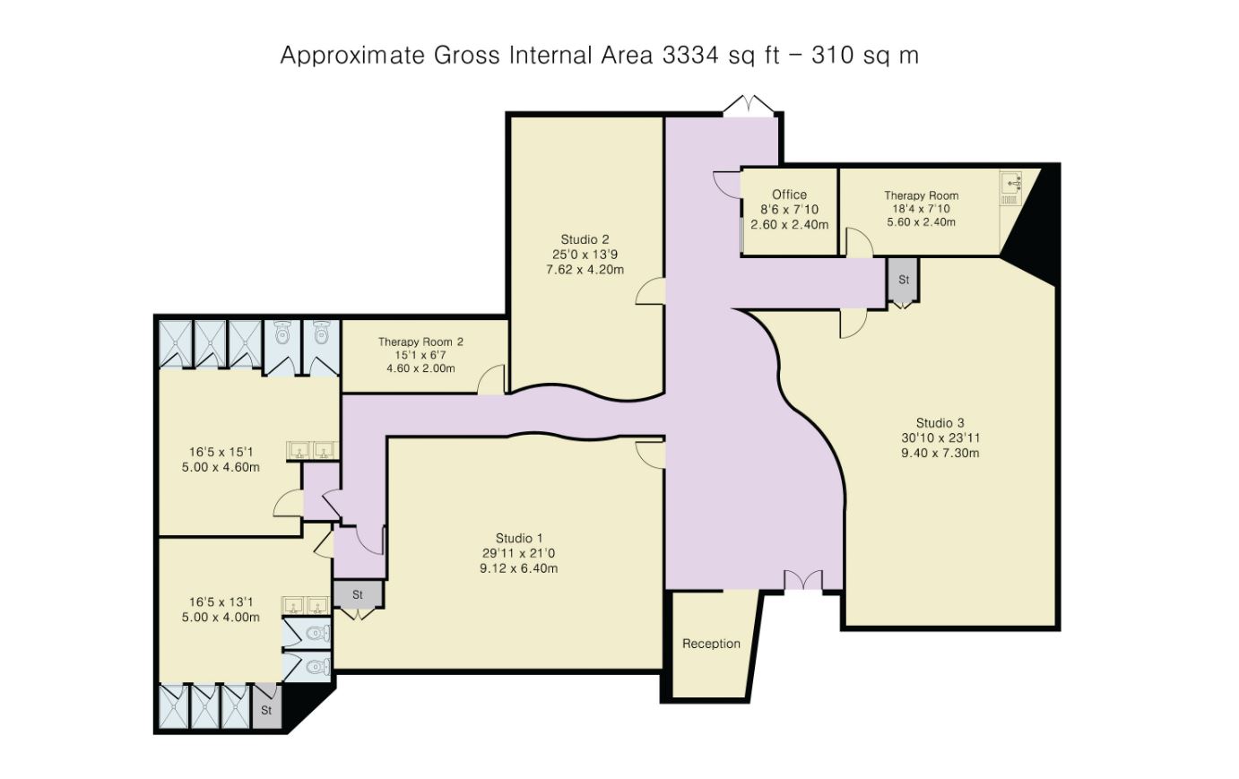 A stunning lower ground floor studio within an attractive converted Victorian warehouse building, part of a large mixed use scheme. Currently used as a high end fitness studio and fitted with several studios, treatment rooms and changing/shower facilities. The premises have plenty of character features with exposed concrete columns and ceilings and excellent ceiling heights over 3m. Would suit similar occupiers, office, showrooms or medical users.