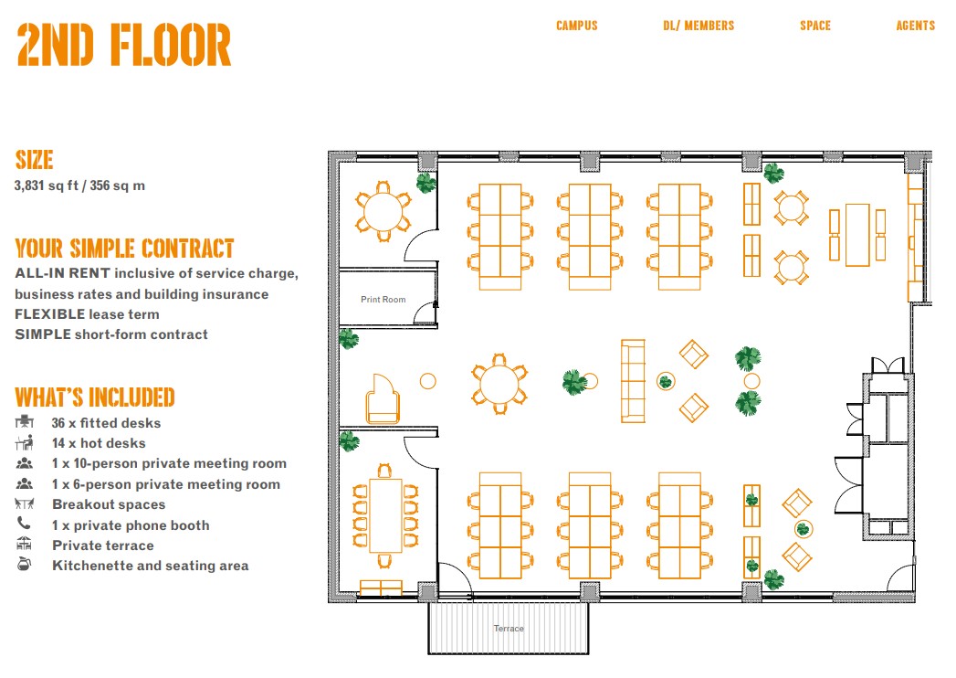 A range of hot desks, phone booths, meeting rooms and event spaces are available to book outside of the office, which can be used for meetings and events. One is located directly opposite Old Street Yard and the other on Charlotte Street in the West End.