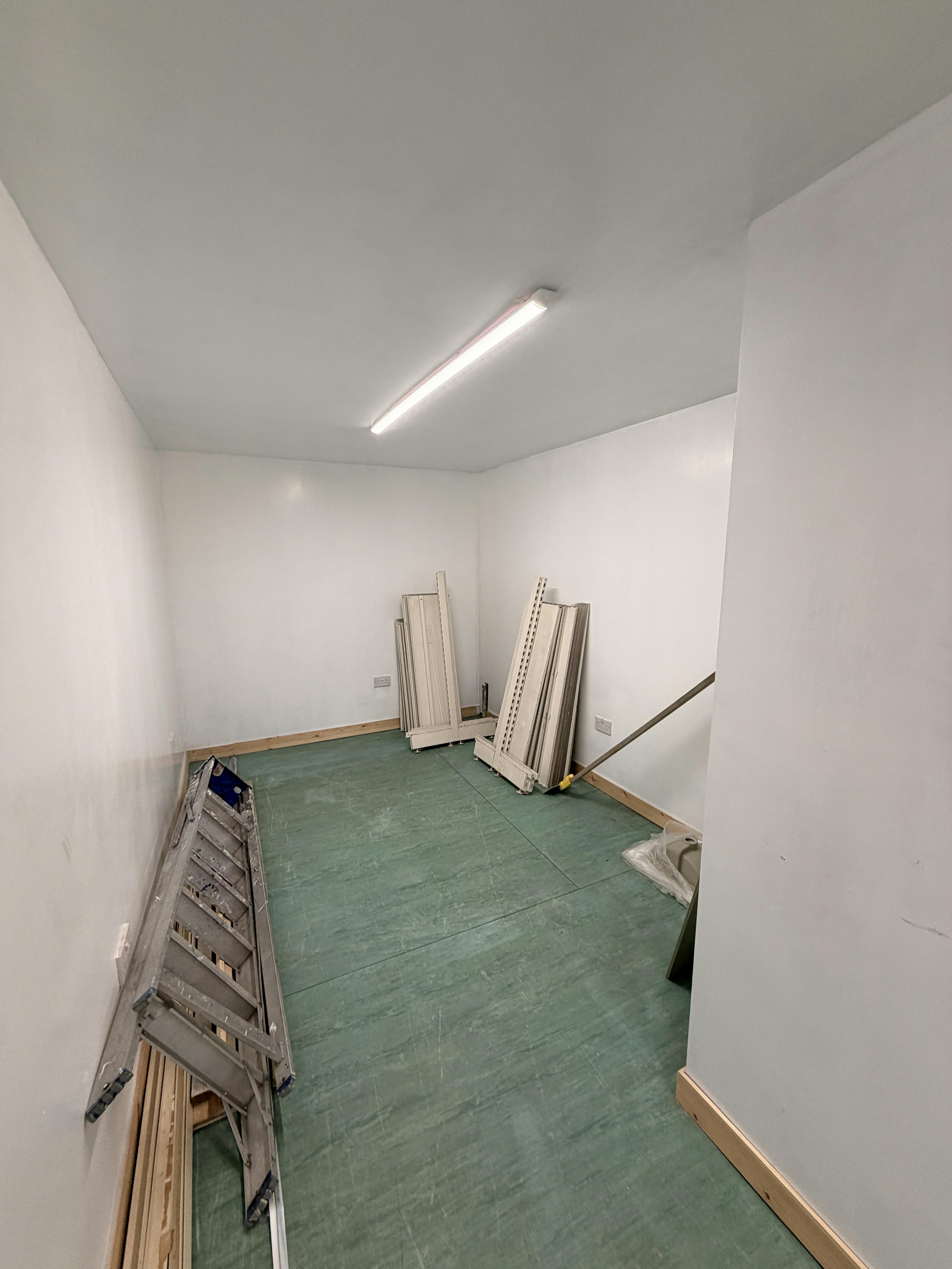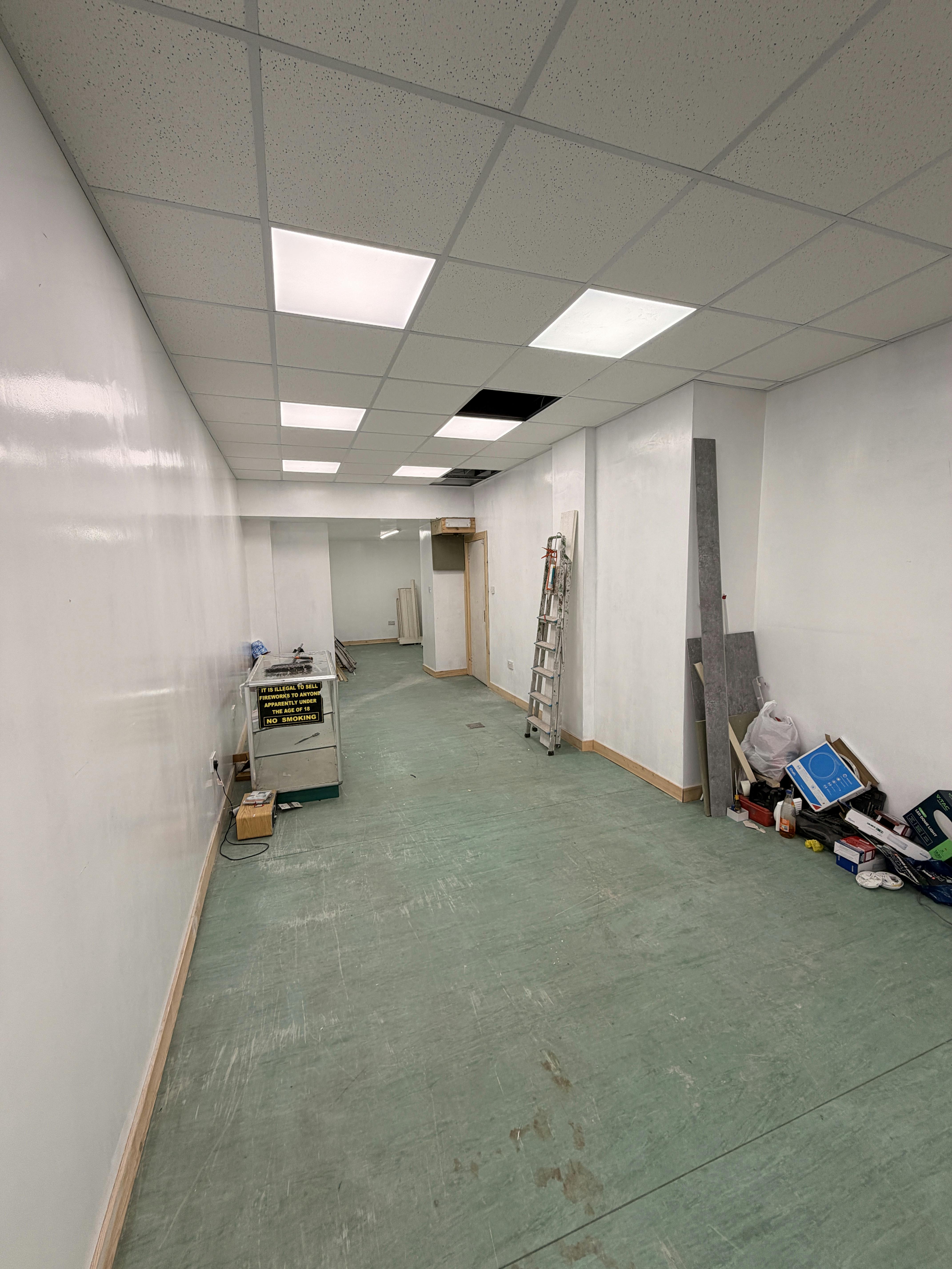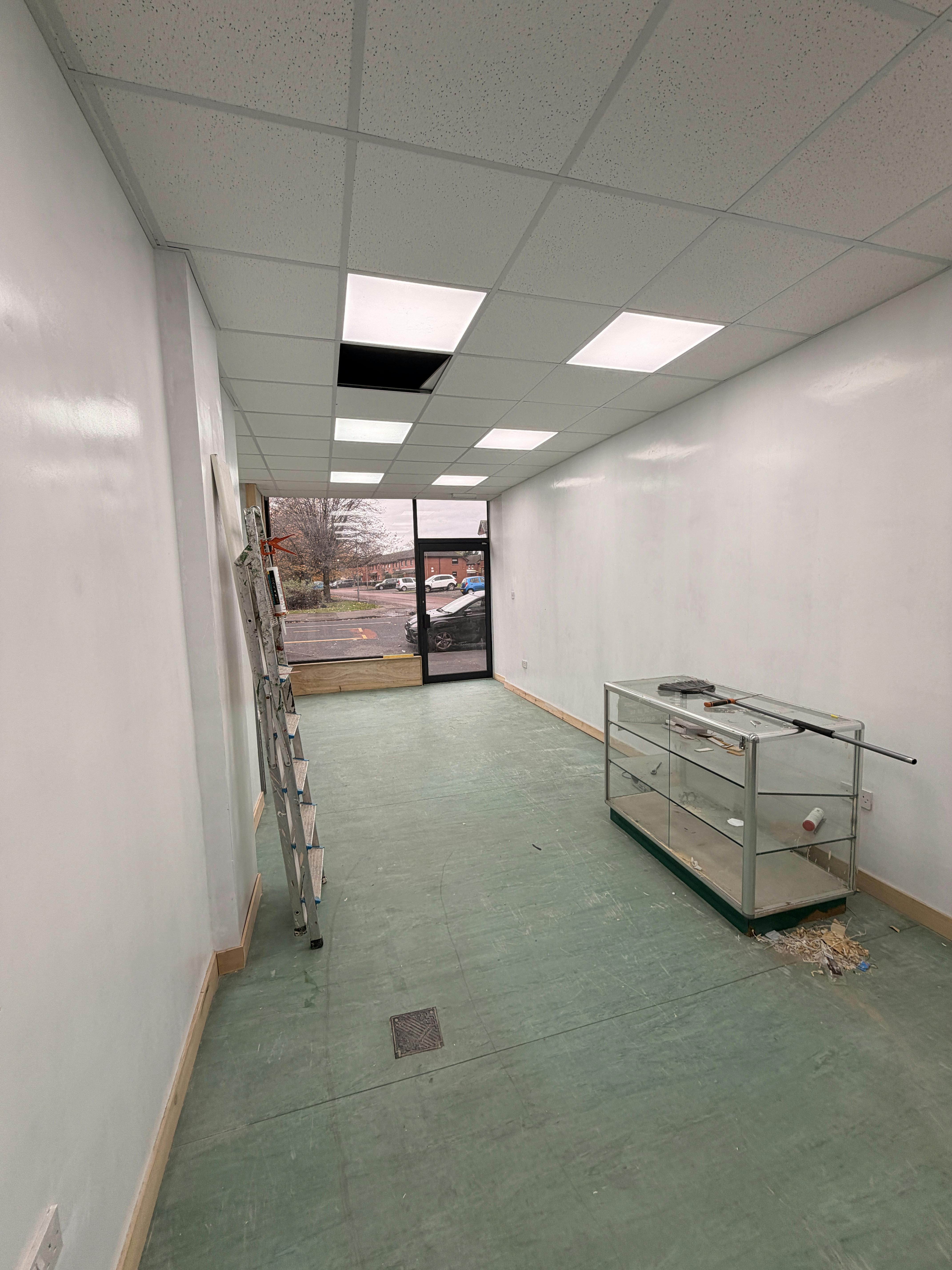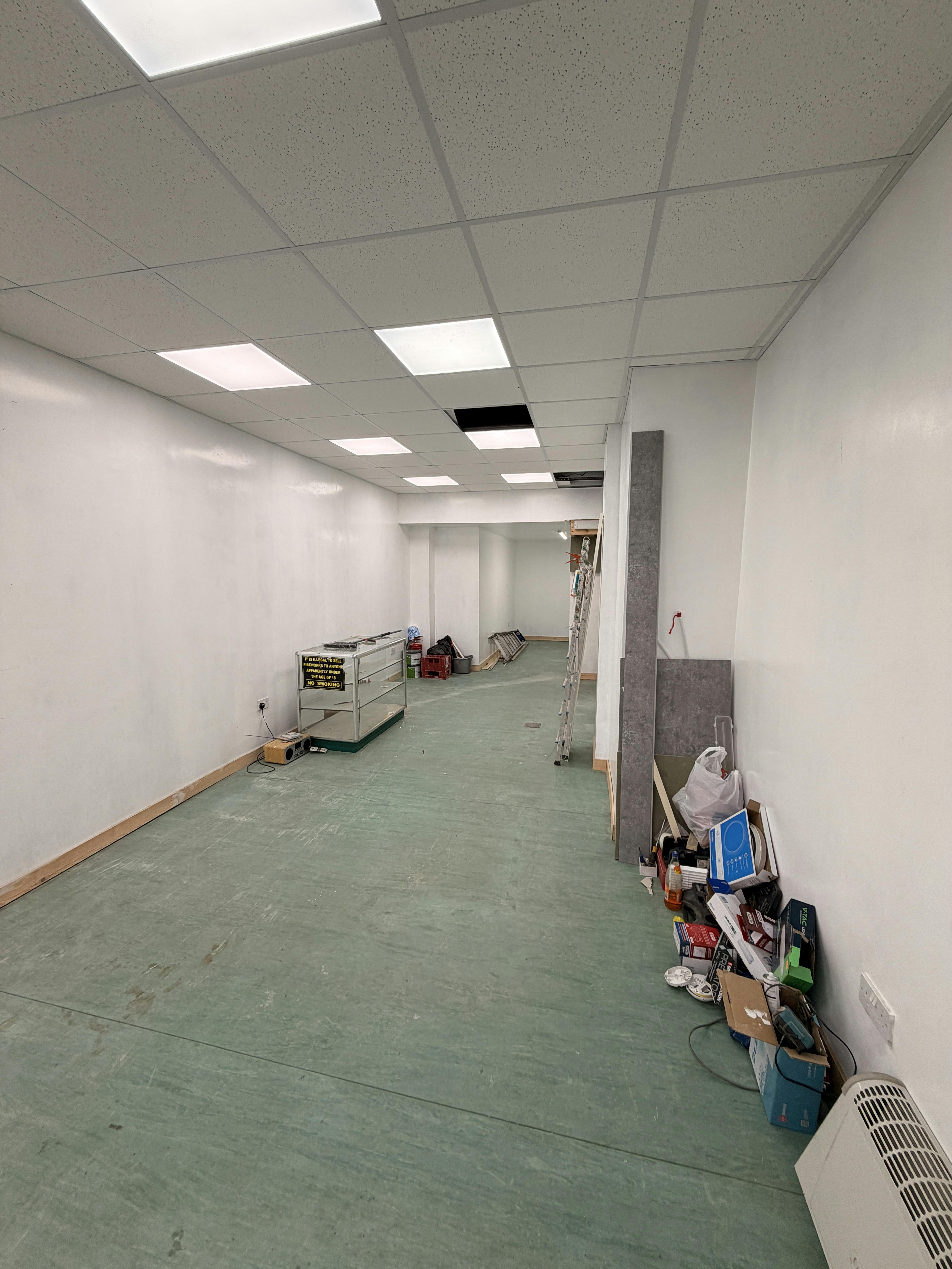 Externally, the single fronted shop sits under a non-illuminated fascia board and is accessed via a flush single pedestrian door which leads into the sales area. The frontage is protected by a roller shutter. Internally, the retail space is rectangular in shape. The floor is covered in commercial vinyl and the walls are of plaster/paint. The suspended grid ceiling incorporates LED box lighting. There is no gas supply to the property and space heating is provided electrically. A storage space and welfare facilities are provided to the rear of the shop.