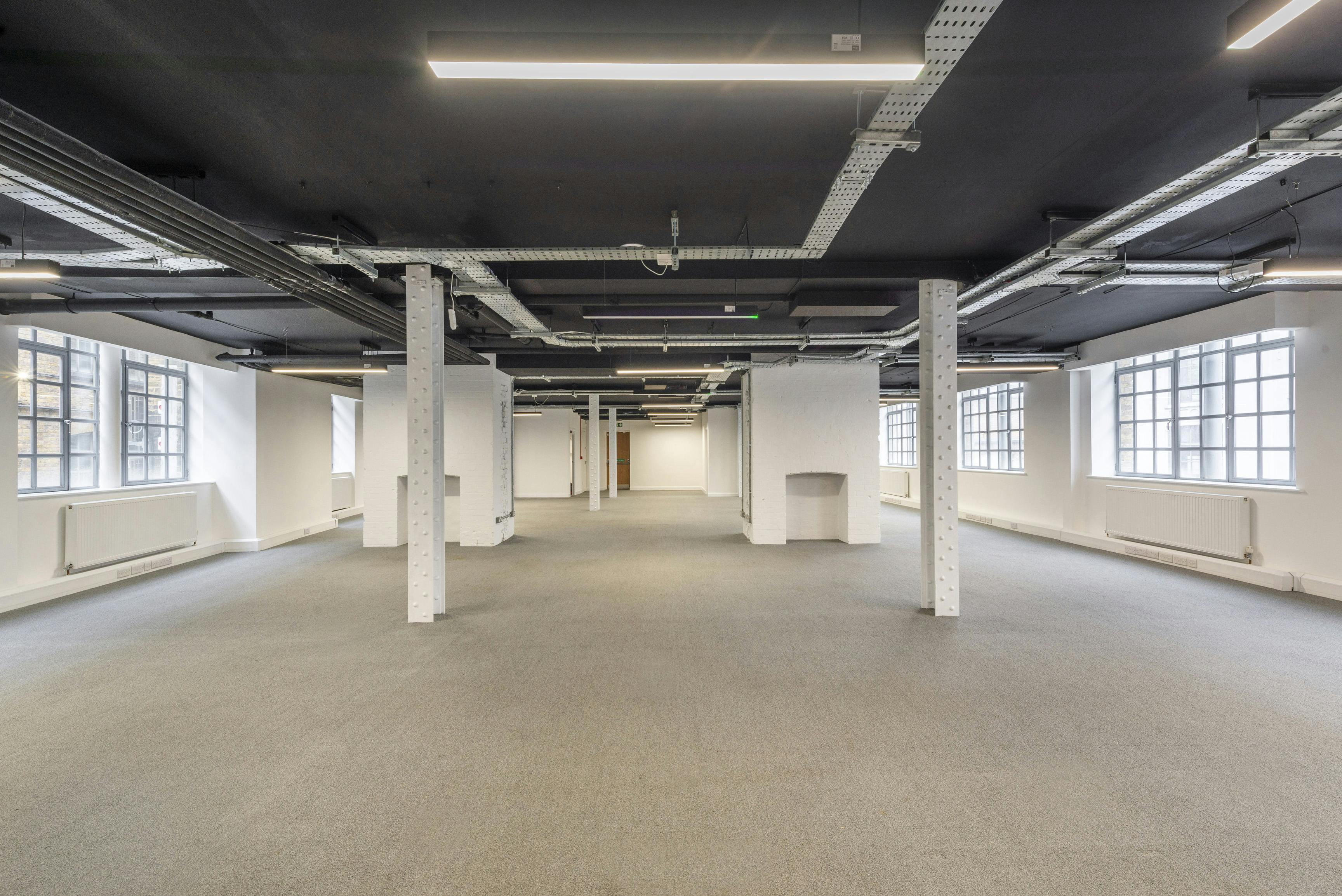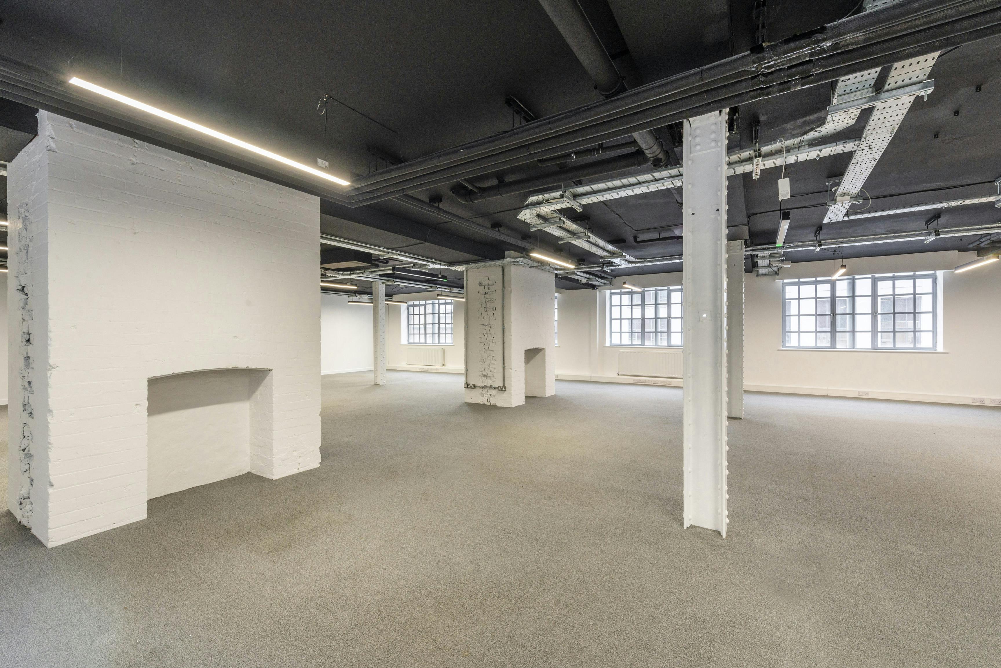 Eyre Street Hill offers industrial-style space, featuring two meeting rooms, a private kitchen, and restrooms. The space is highlighted by exposed steel beams, black-painted ceilings with track systems, Crittall-style windows, and exposed brickwork.