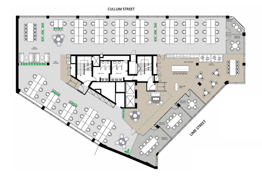 34 Lime Street offers modern, refurbished accommodation in the heart of the City's insurance district. We have refurbished the 4th floor to provide a fully fitted plug and play office space, benefitting from 5 meeting rooms, 70 open plan desks as well as various breakout and hot desking areas. The building also benefits from cycle storage and end of trip facilities.