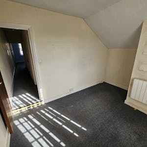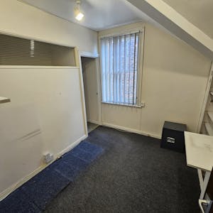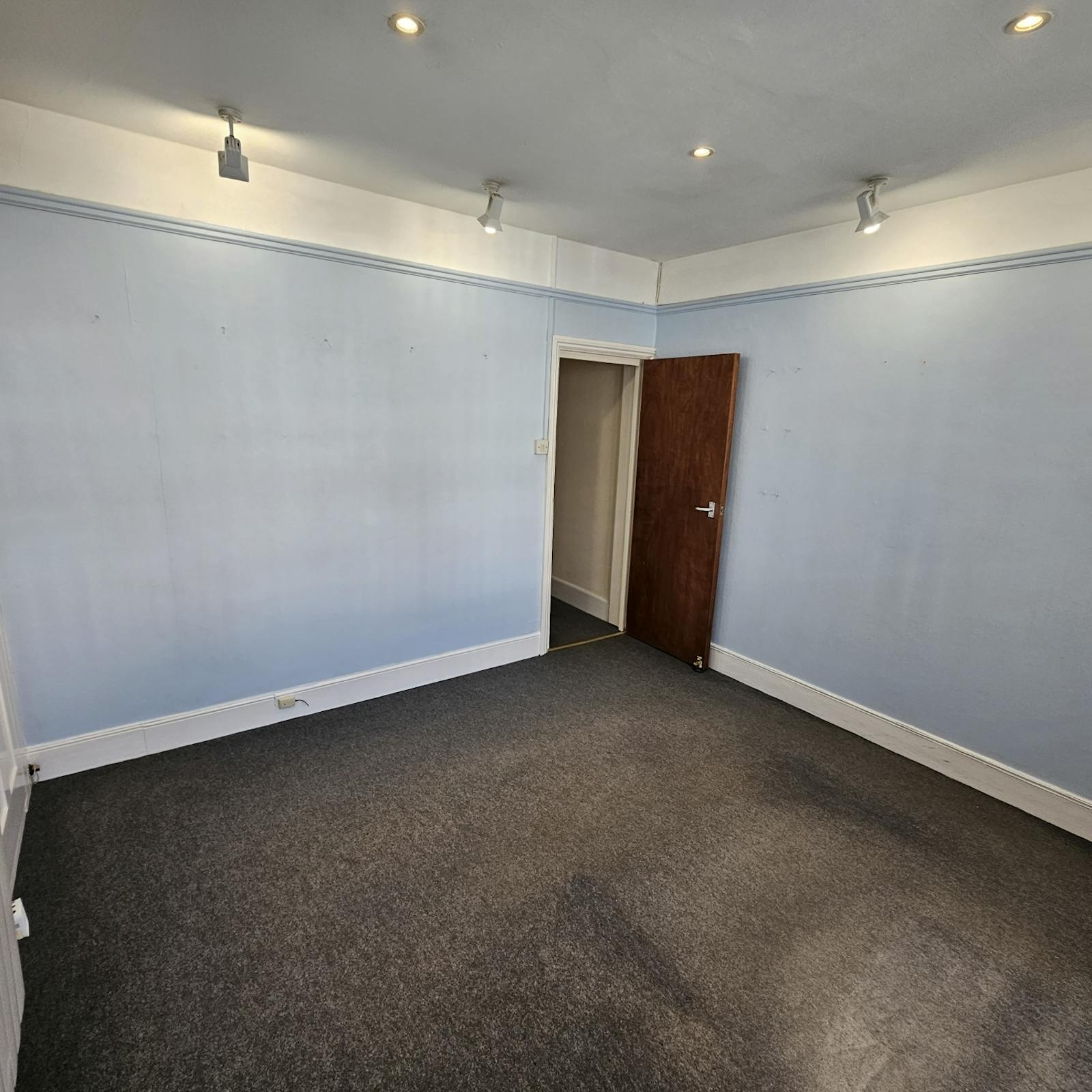 Front office (1) 3.8m 12′ 6″) into alcove x 3.6m (11′ 9″) – 13.7 sq m (147 sq ft.) Window over looking the High Street, wall heater, carpet.