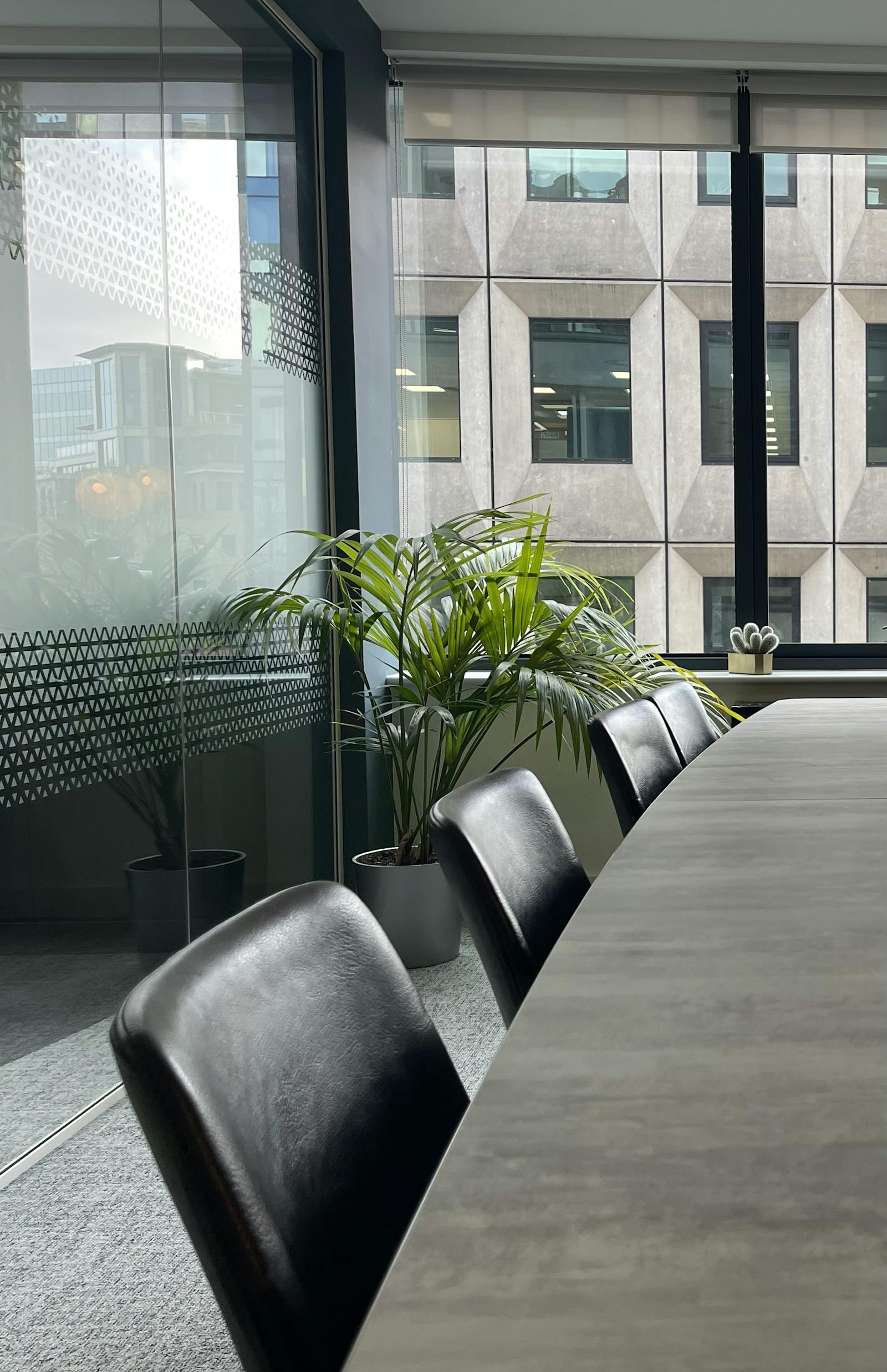 A modern and sleek, fully furnished and fitted office in the centre of Leeds' thriving professional community. The building boasts a glass façade with bronze detailing and a modern entrance foyer with a concierge, creating a warm atmosphere.