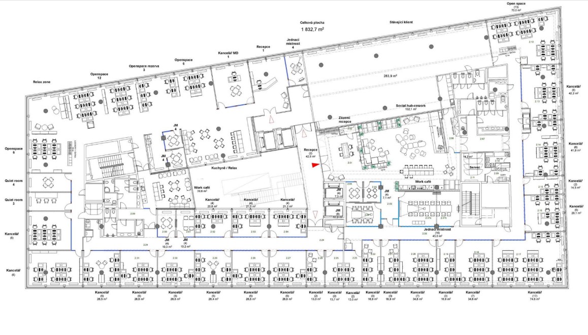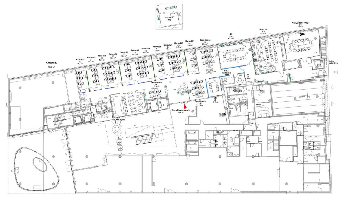 Superior flexible office, coworking, and event space in a newly built office district that offers tenants top-quality workspace, community life, a full range of services, and a wide range of cultural and sporting activities. The building offers a communal terrace for tenants and their visitors. Coffee shop and canteen directly in the building. The centre is like a small town in the city with its own fitness centre, cafes, restaurants, post office, shopping centre, kindergarten, elementary school and park with greenery, making it the best-equipped business project in Prague.