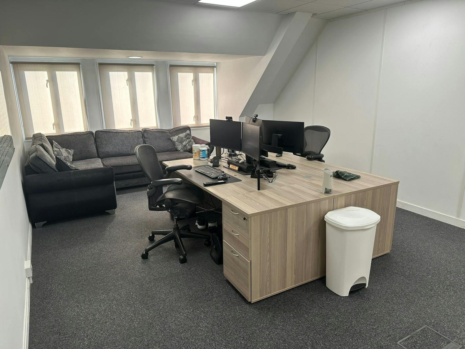 This office building features a welcoming ground-floor reception area, with both stairs and a lift providing access to the first and second-floor offices. Each office is fitted with suspended ceilings, integrated lighting, carpet tiles and air conditioning. Communal toilets and a kitchenette are available on every floor.