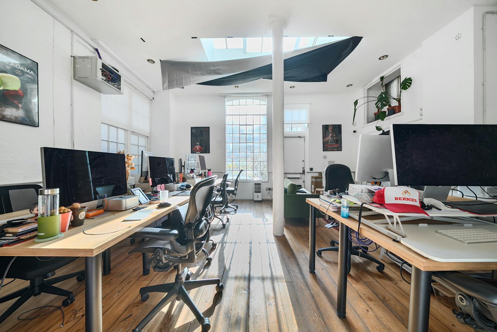 Upon entry, the floor delivers immediate “WOW” factor, featuring a fully exposed steel-trussed pitched roof that provides exceptional ceiling height. Combined with exposed brickwork, wooden floors, and large Crittall-style windows, it offers a rare and characterful loft-style office or studio environment.
