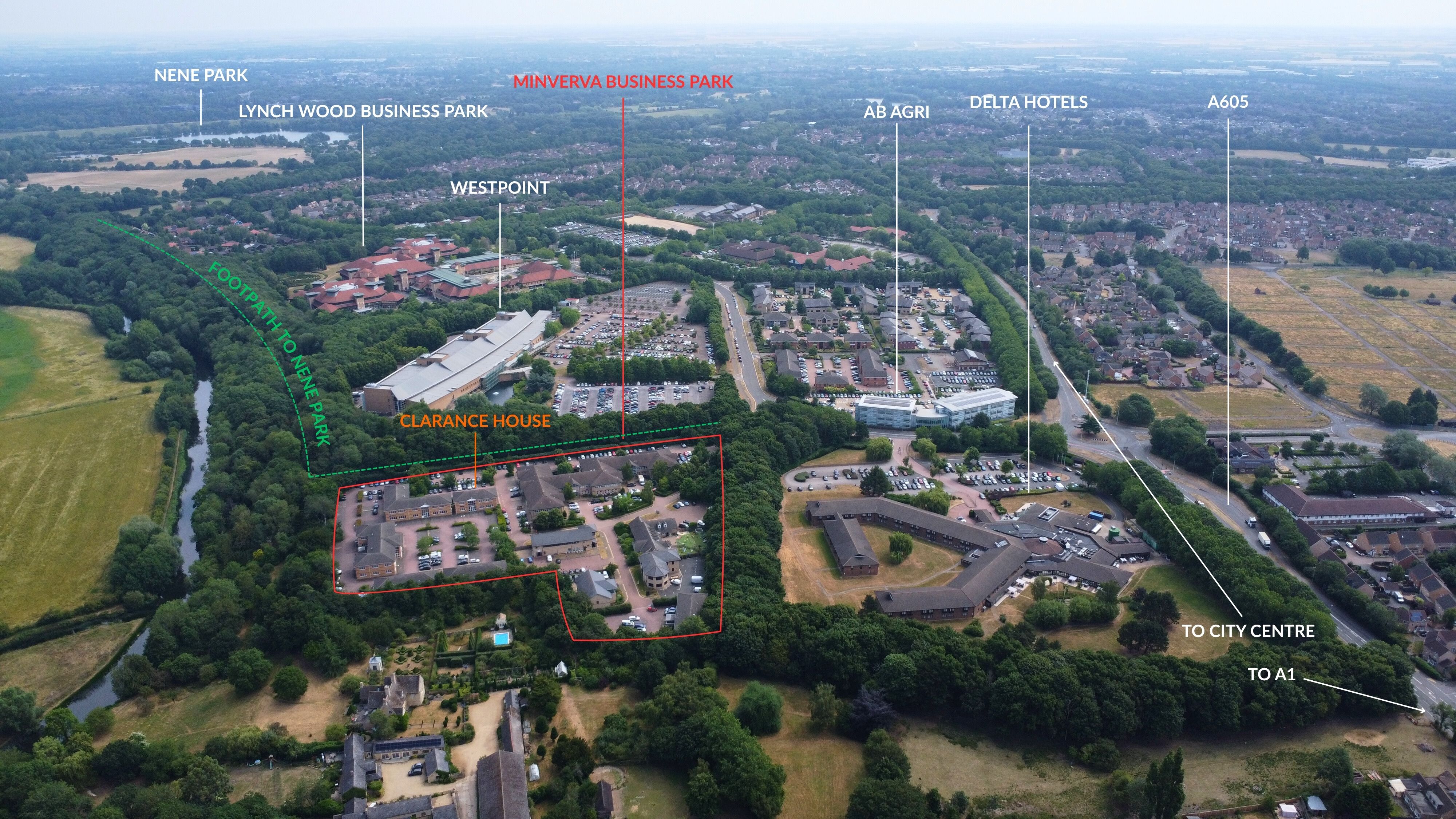 Located just outside of Peterborough City Centre, Lynch Wood is recognised as a premier out of town business destination based in a prominent position for excellent transport links. With great access to the A1 and A14, you’re easily connected to the national motorway network for convenient travel throughout the UK. You can hop on a train and get to London in 45 minutes, or take the regular bus service which runs