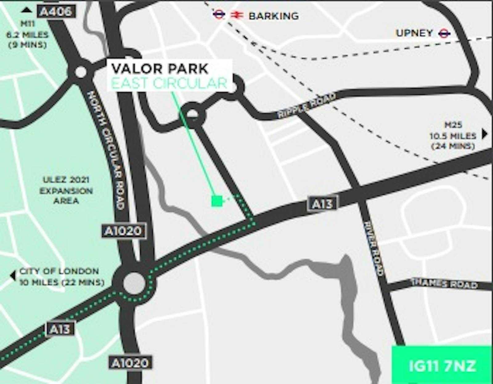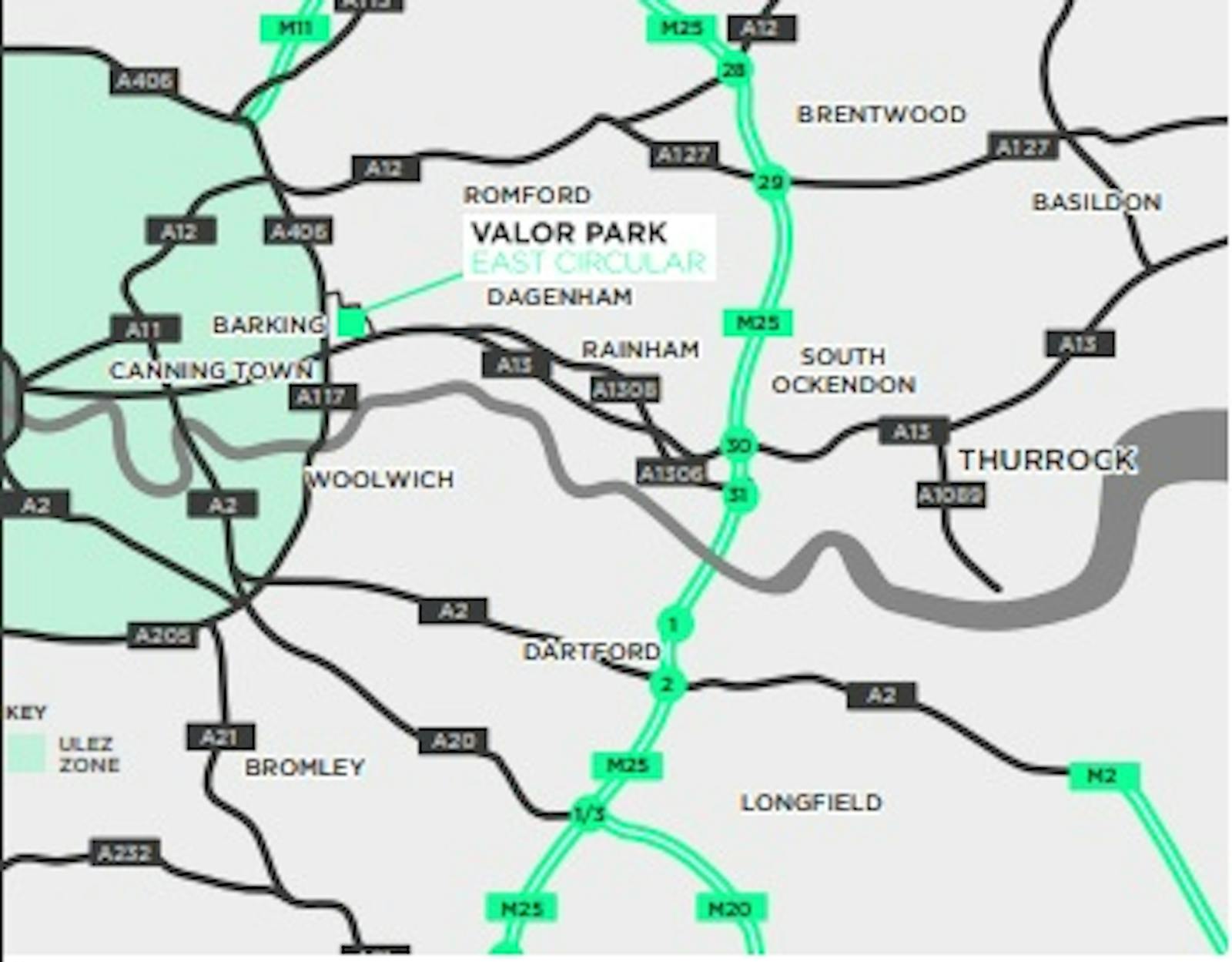 The A13(T) provides excellent access to the A406 North Circular Road / M11 which in turn provides access to the M25 (Junction 30/31).