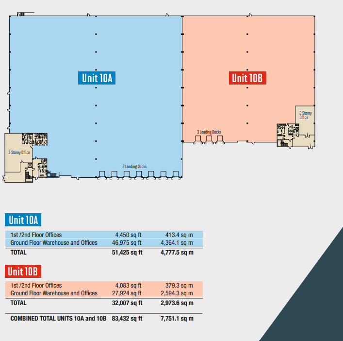 Unit 10A has seven dock levellers and one level access door, Unit 10B has three dock levellers and one level access door.