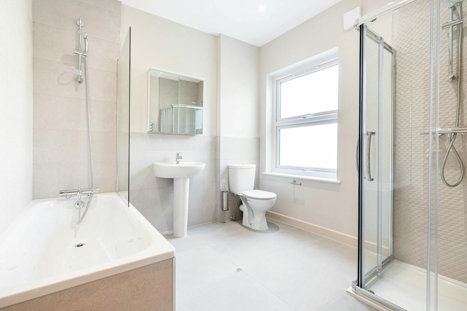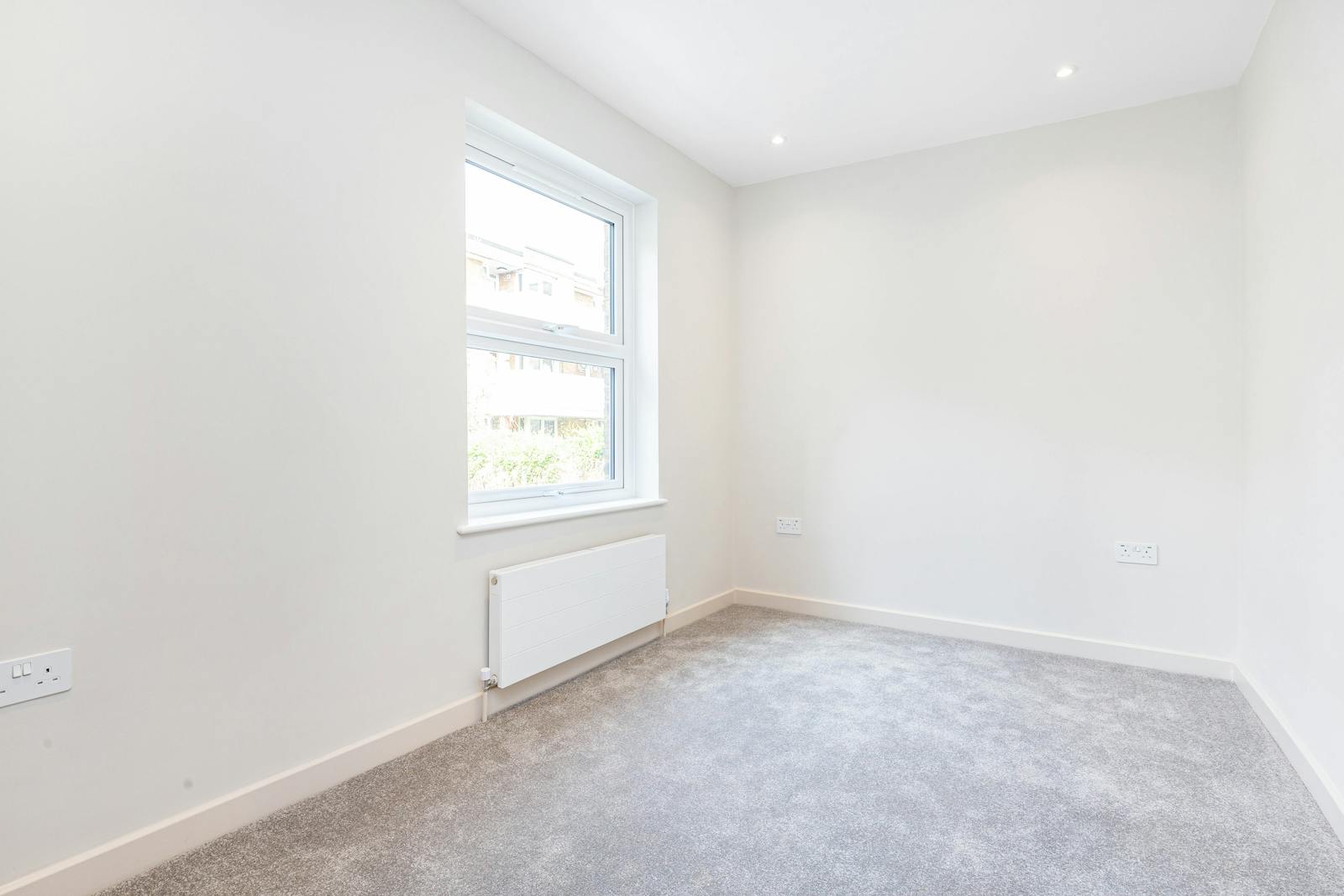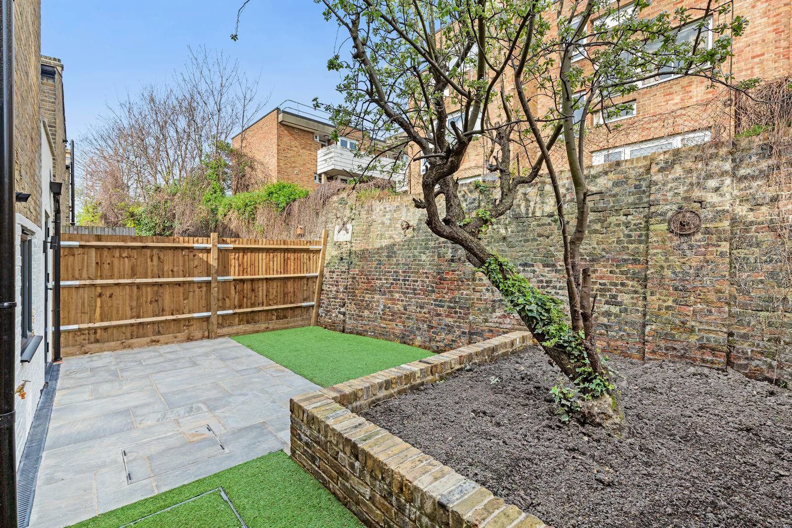 The private garden is accessed from the kitchen. Upstairs there are two bedrooms, both with built-in wardrobes, and a large bathroom with a bathtub and walk-in shower.