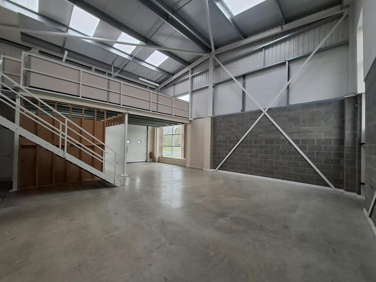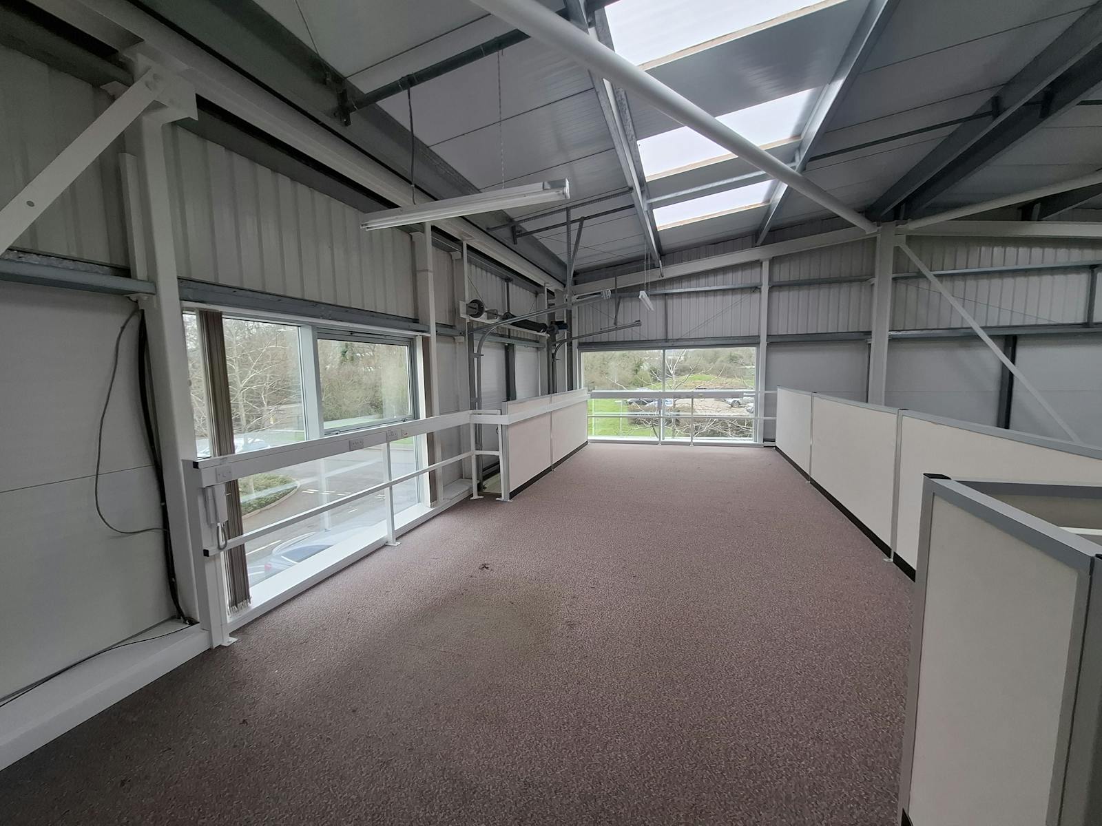 Internally, the accommodation provides an open-plan warehouse and trade counter area incorporating halogen lighting, an electrically operated roller shutter door, a pedestrian access door, a concrete floor, and translucent roof panels. The unit also includes a mezzanine level offering additional space suitable for storage or office use.