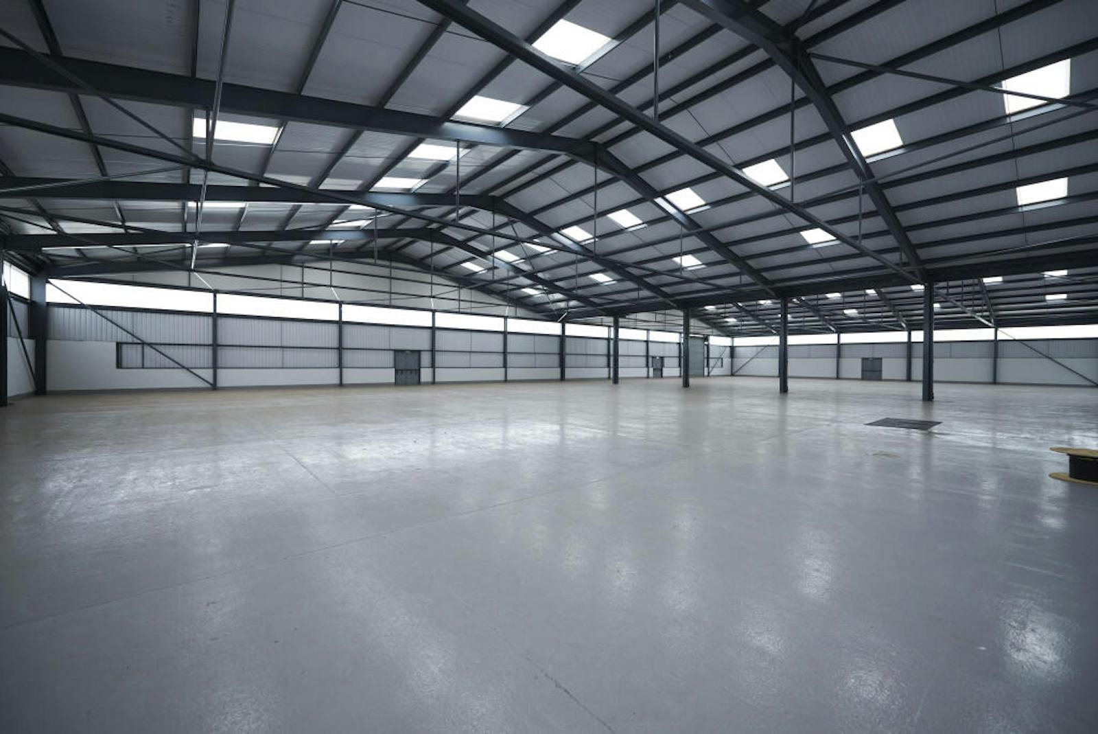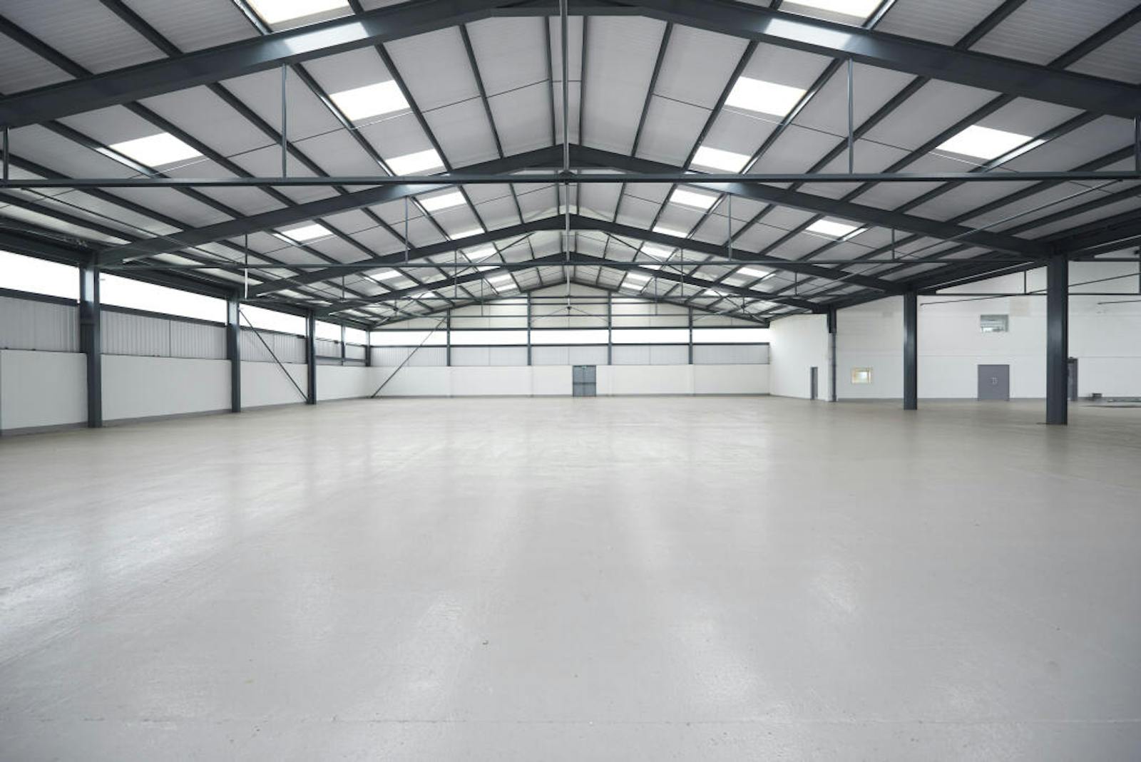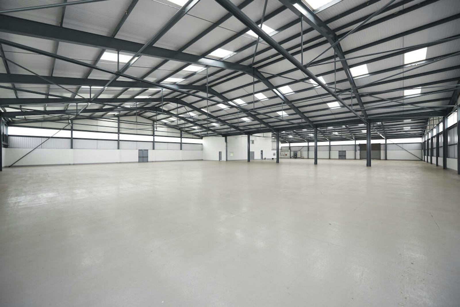 The warehouse comprises two bays and benefits from natural light via translucent panels, complemented by suspended ceiling lighting.