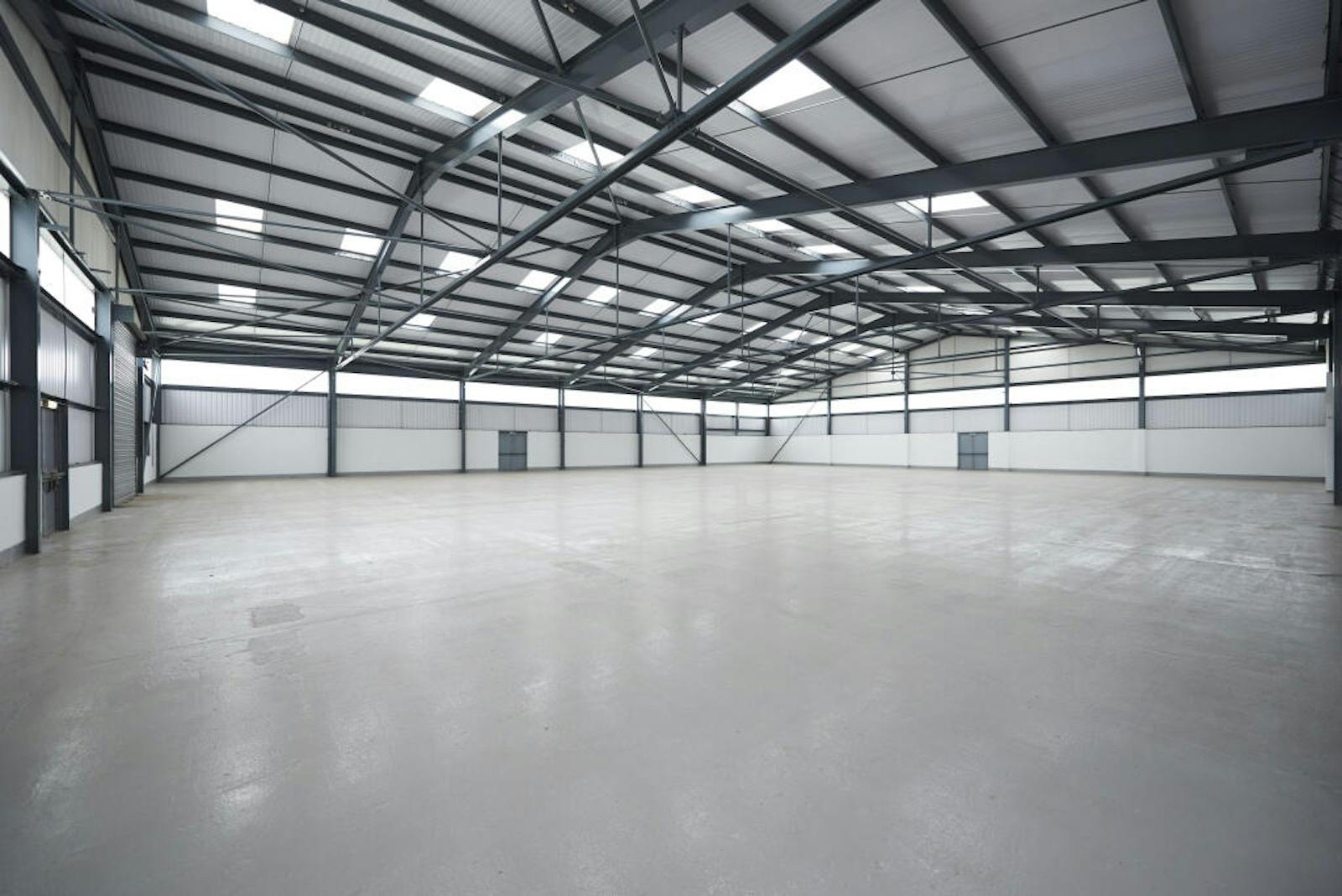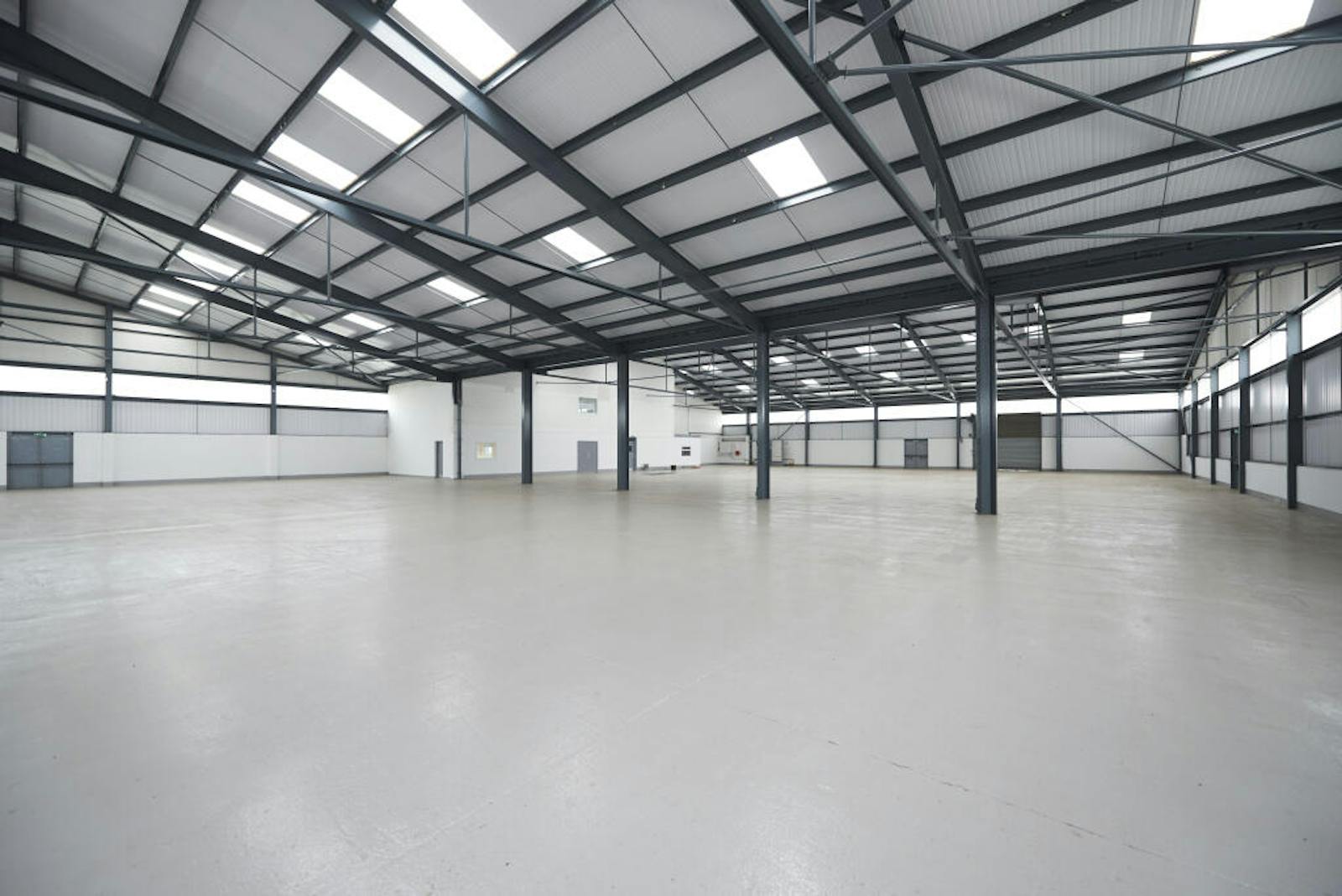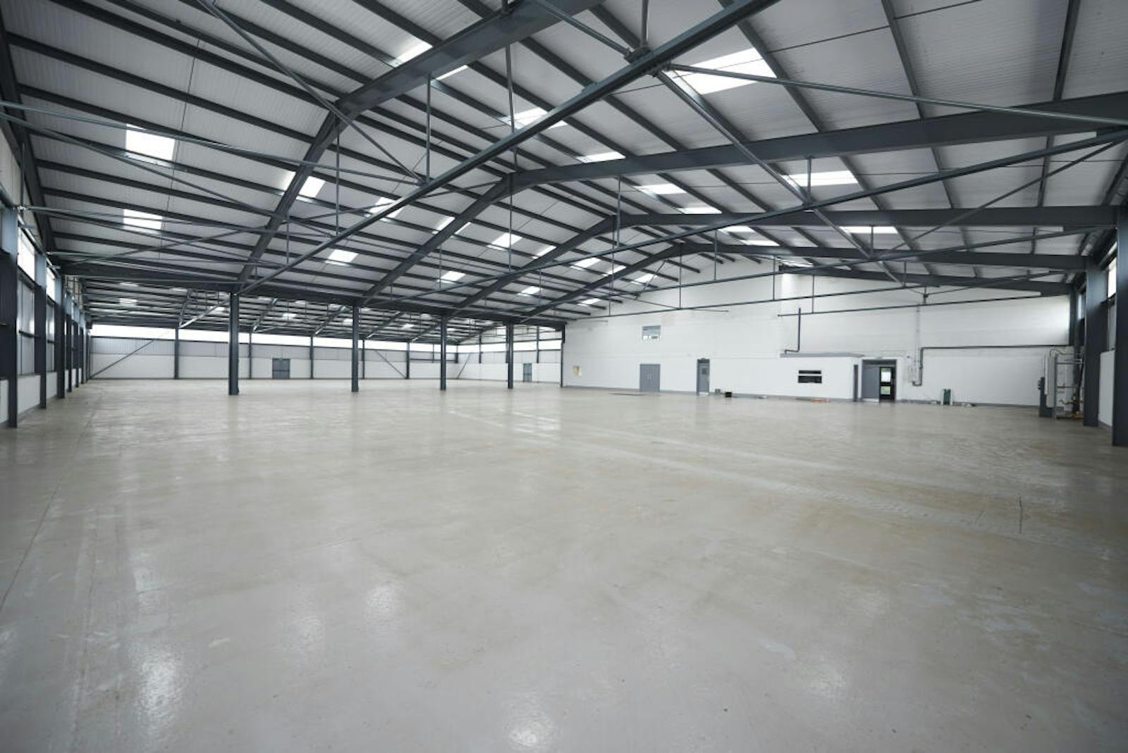 The warehouse comprises two bays and benefits from natural light via translucent panels, complemented by suspended ceiling lighting.