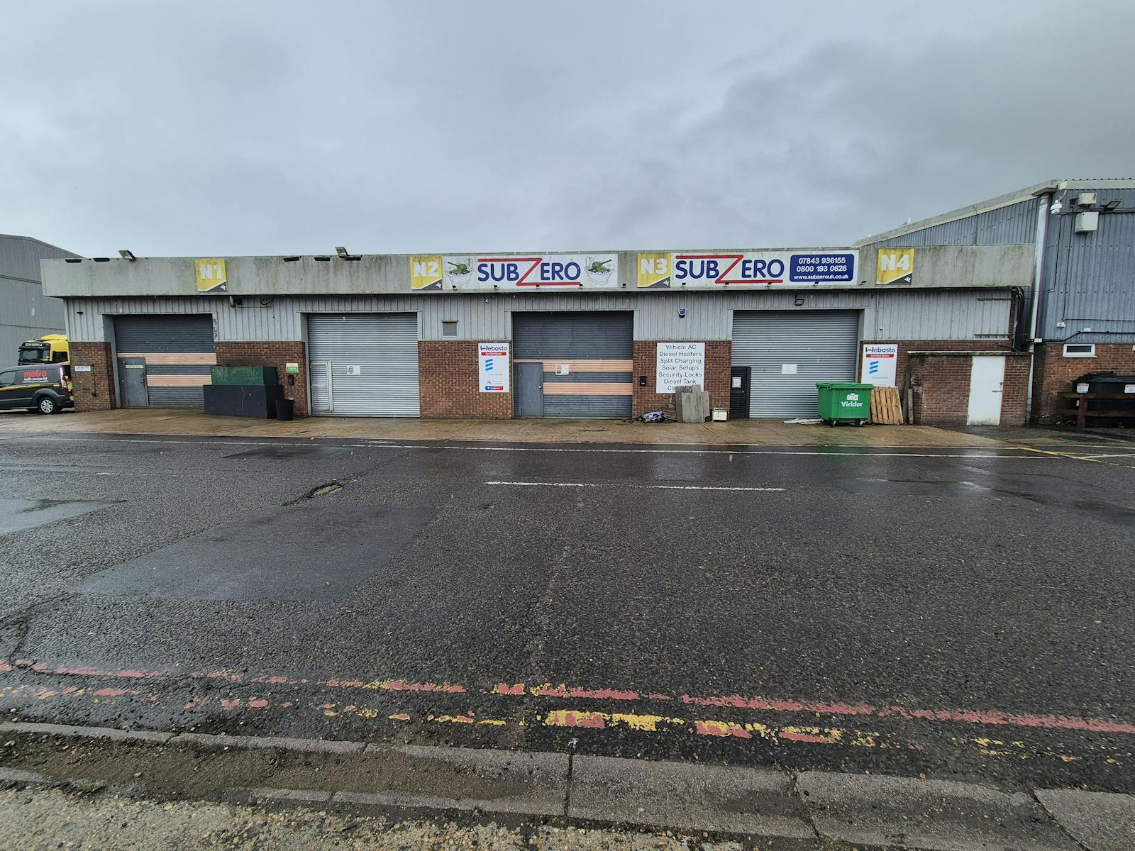 An end of terraced unit of steel frame construction with part brick, part profile metal clad elevations under a pitched roof with roof lights, loading door and WC's.