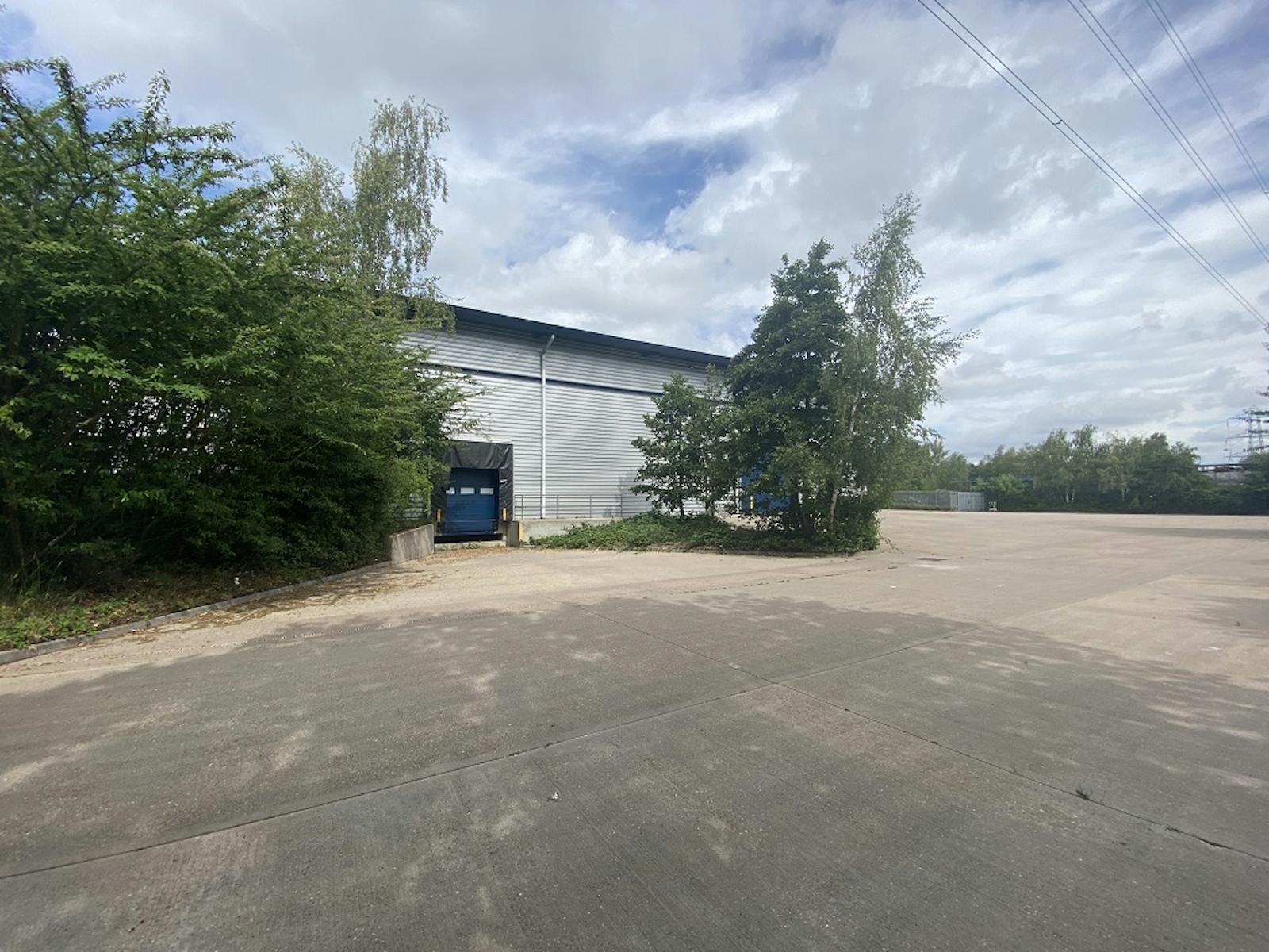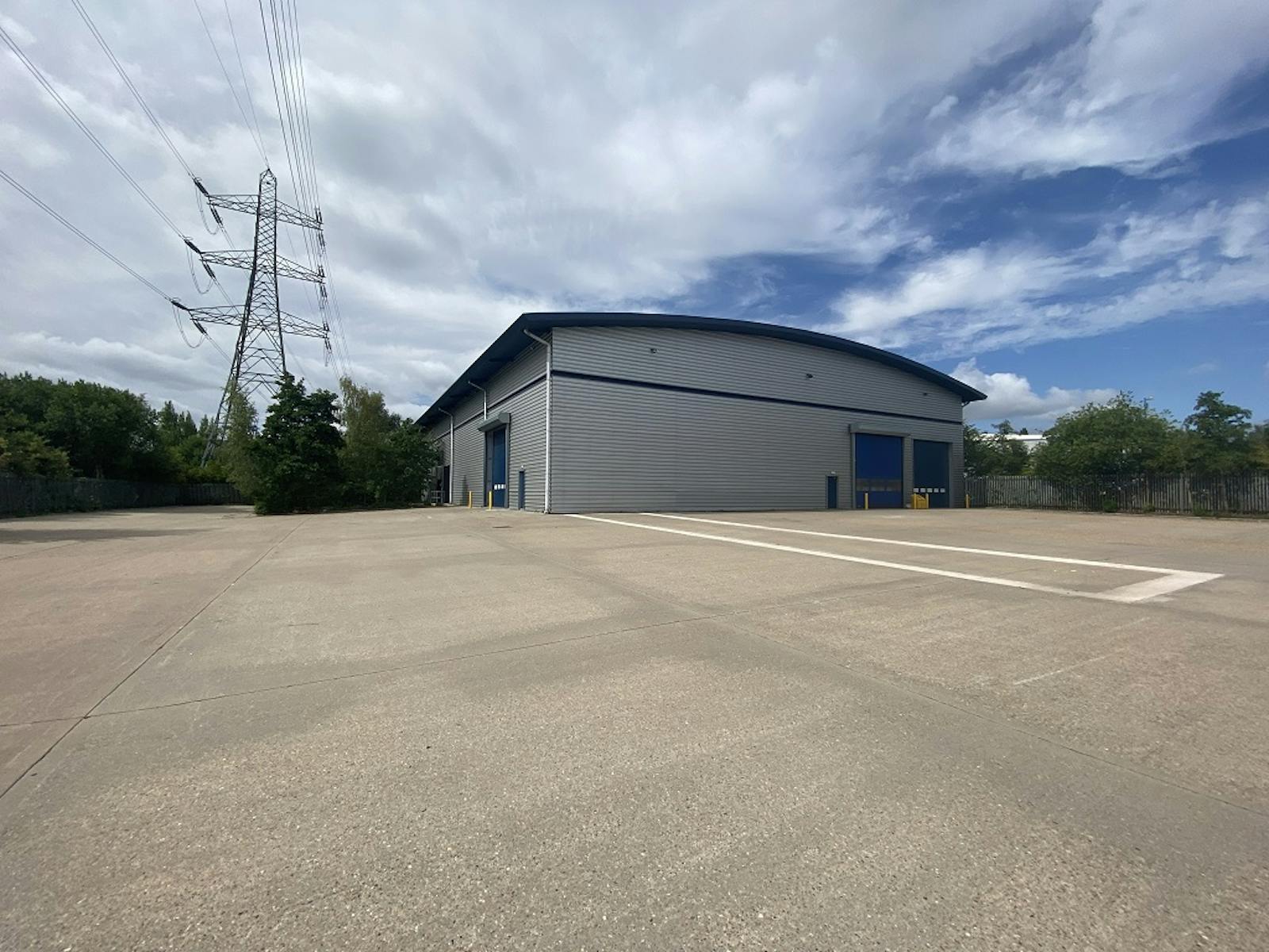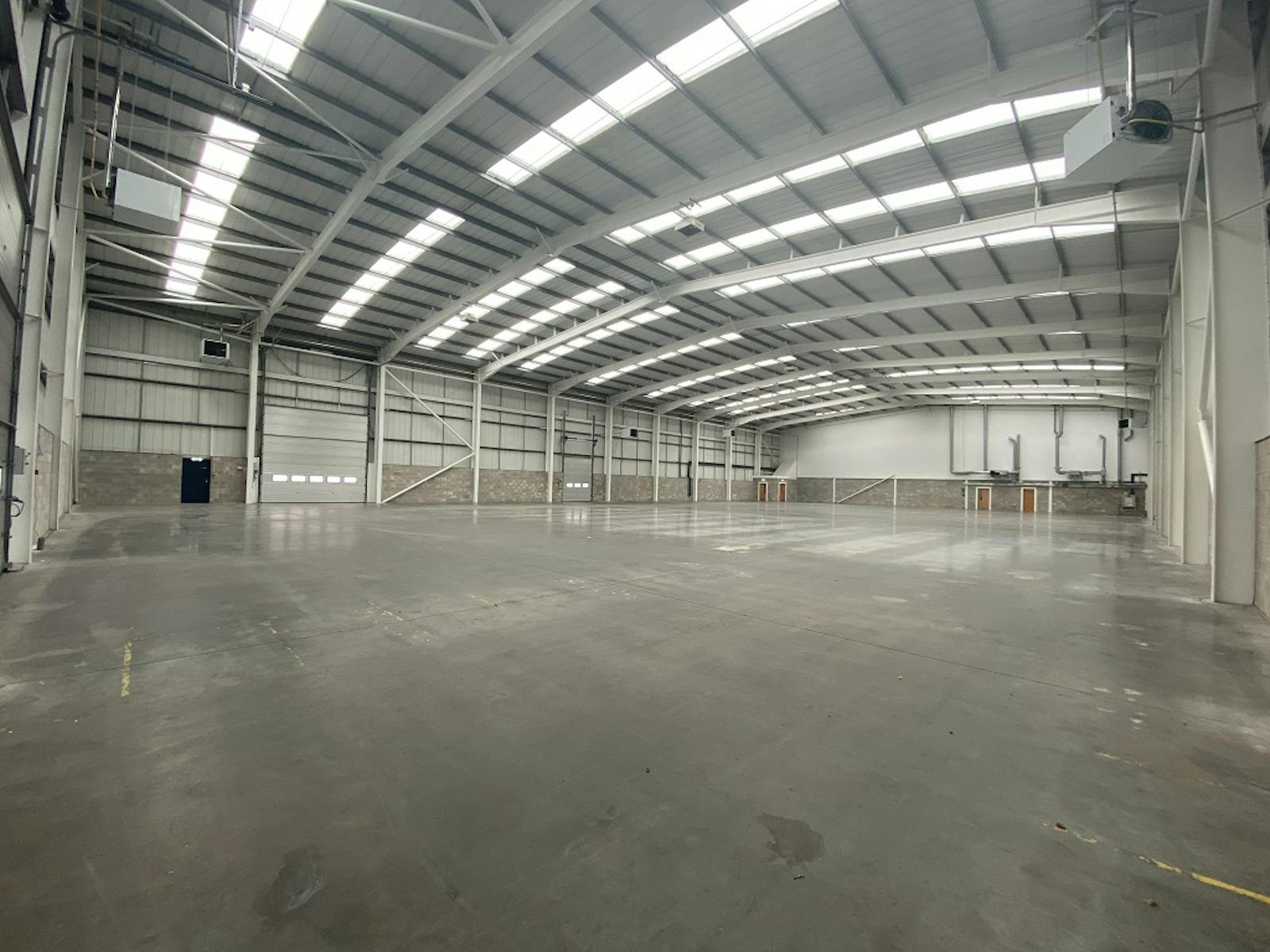 The building comprises a substantial 21,616 sq ft warehouse with an 8.17m eaves height, three level-access loading doors, and a dock-level loading door, supported by a 38m deep secure service yard. Constructed with a steel portal frame, metal-profile cladding and a barrel-vaulted roof, the unit provides robust, flexible space suited to a variety of industrial uses. To the front, 9,238 sq ft of high-quality, two-storey integral offices offer modern accommodation with raised floors, comfort cooling and staff amenities.