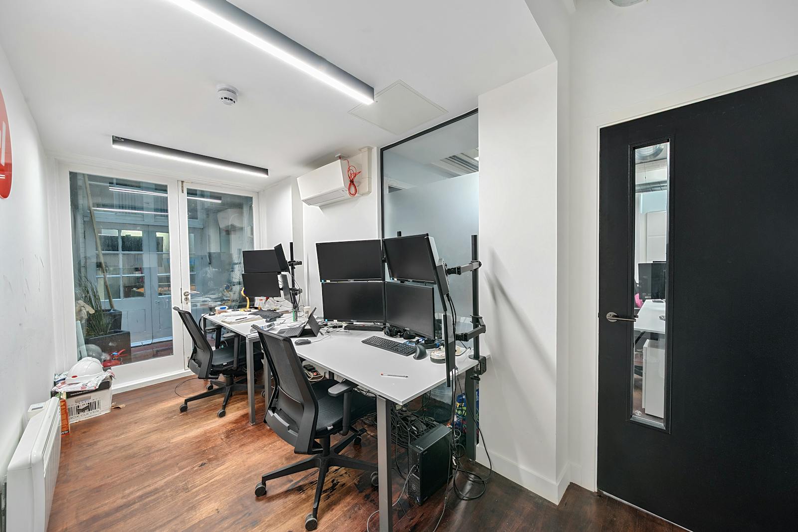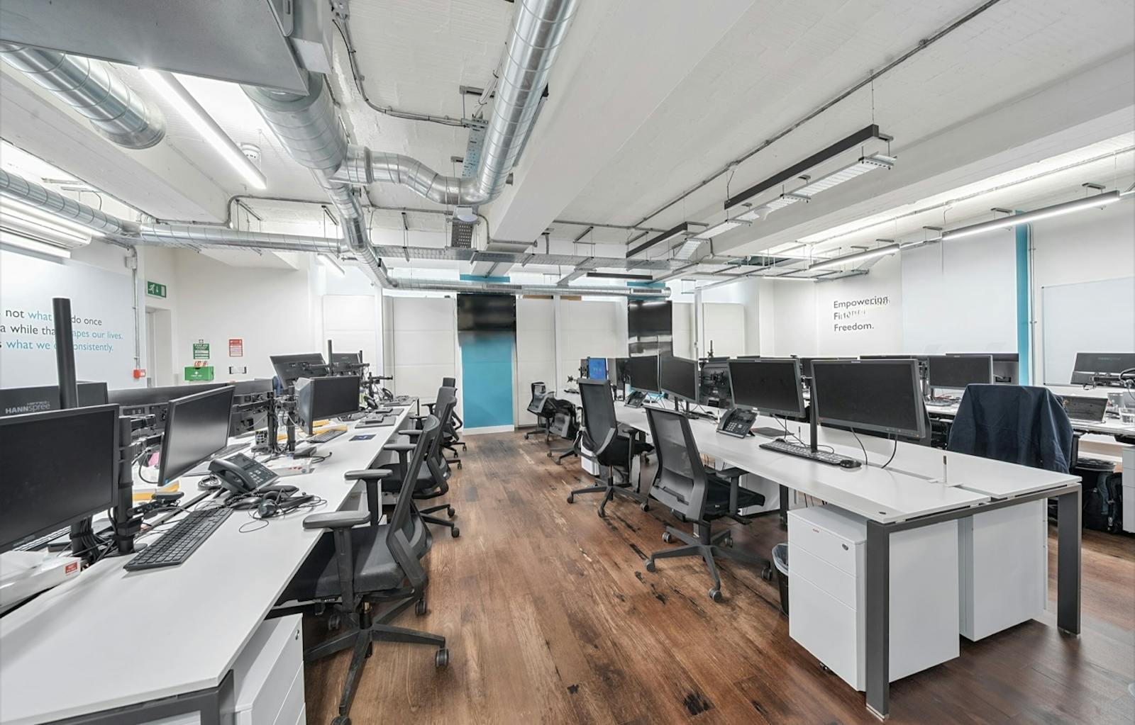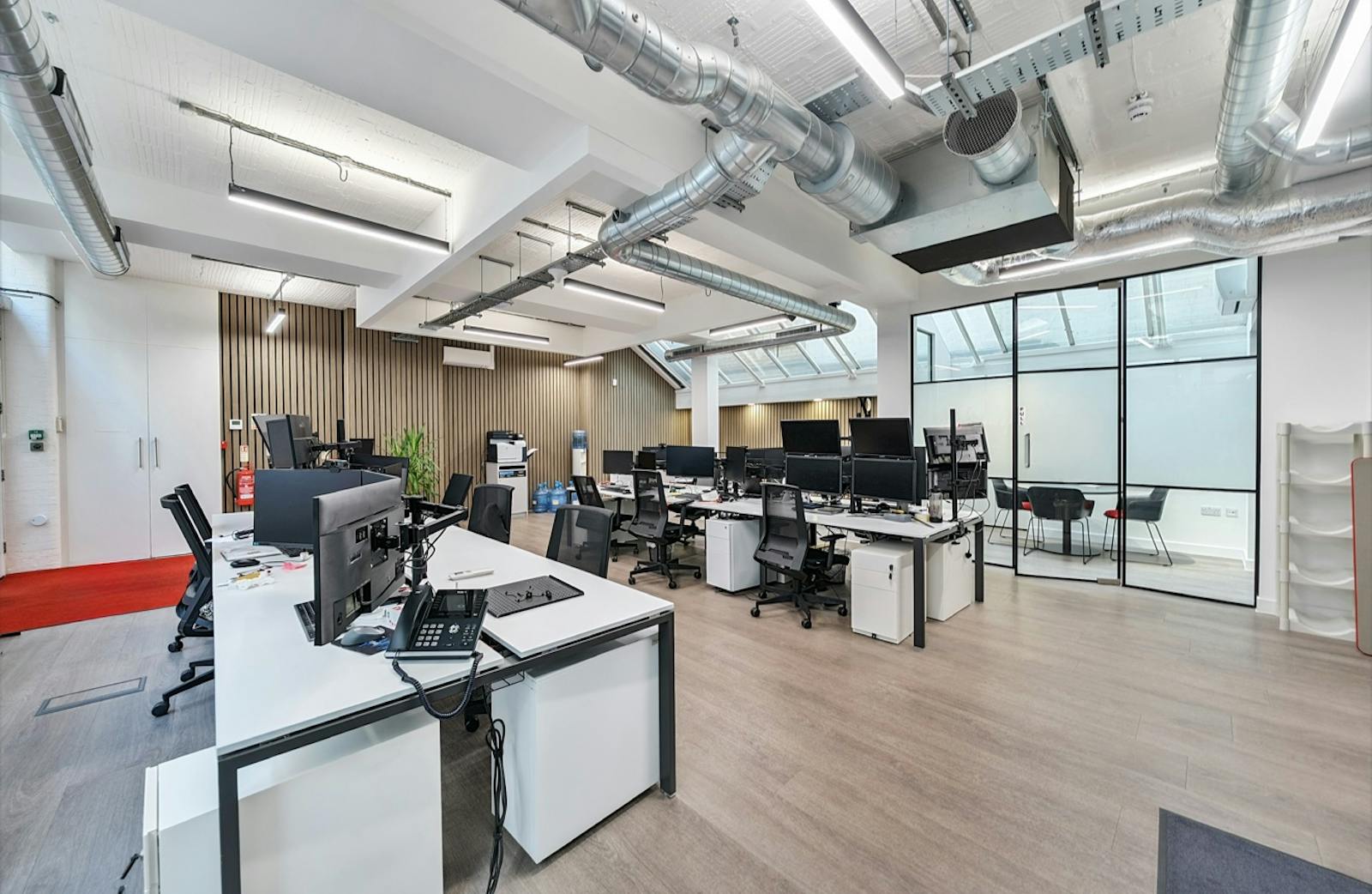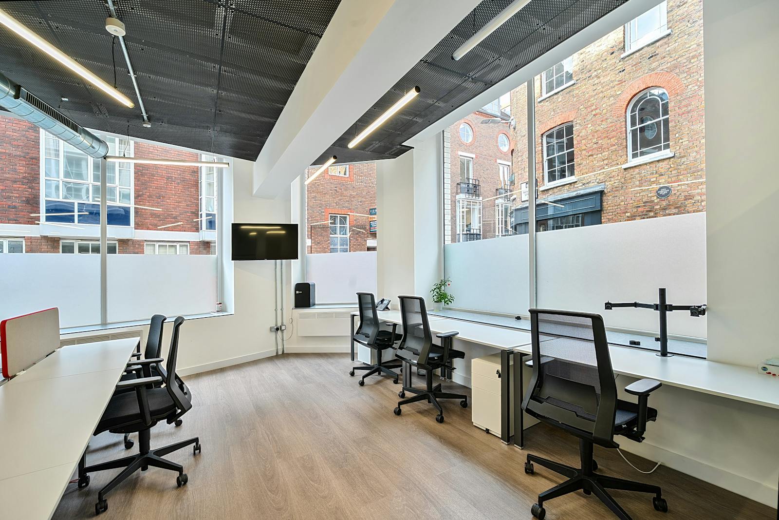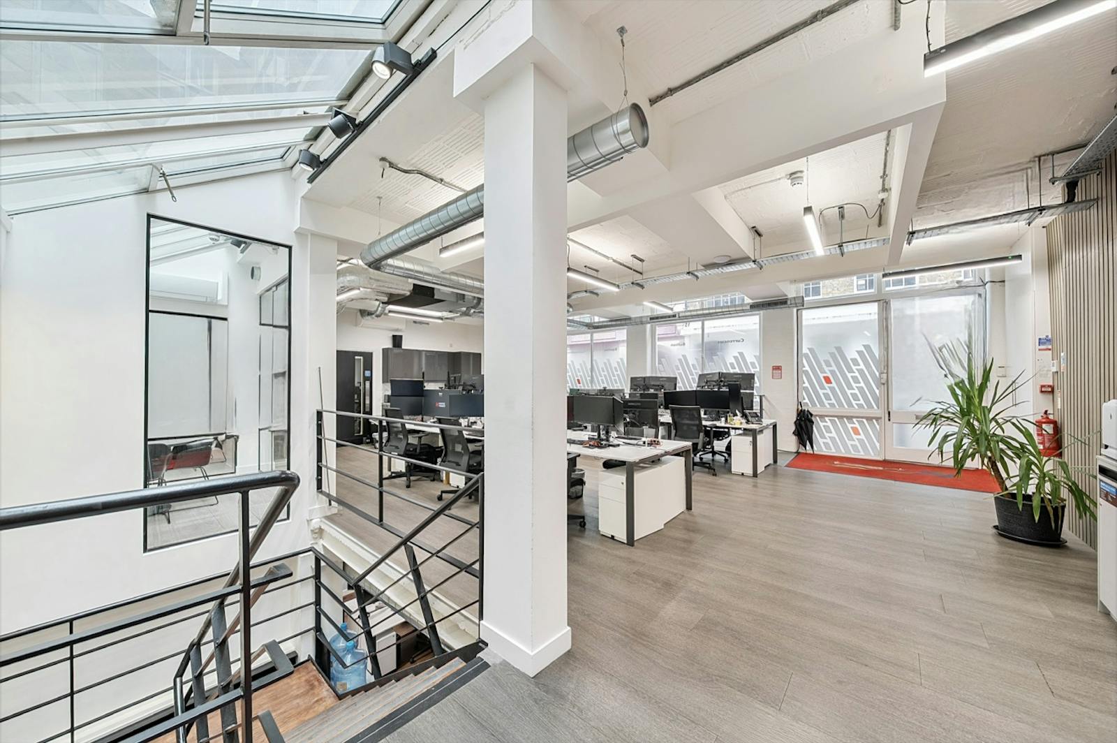 Spanning the ground and lower ground floors, this 4,306 sq ft self-contained office offers a versatile, fully fitted layout. The ground floor provides a welcoming entrance with meeting rooms, private office suites, and multiple workstations, while the lower ground benefits from impressive floor-to-ceiling heights, creating an open and airy working environment.