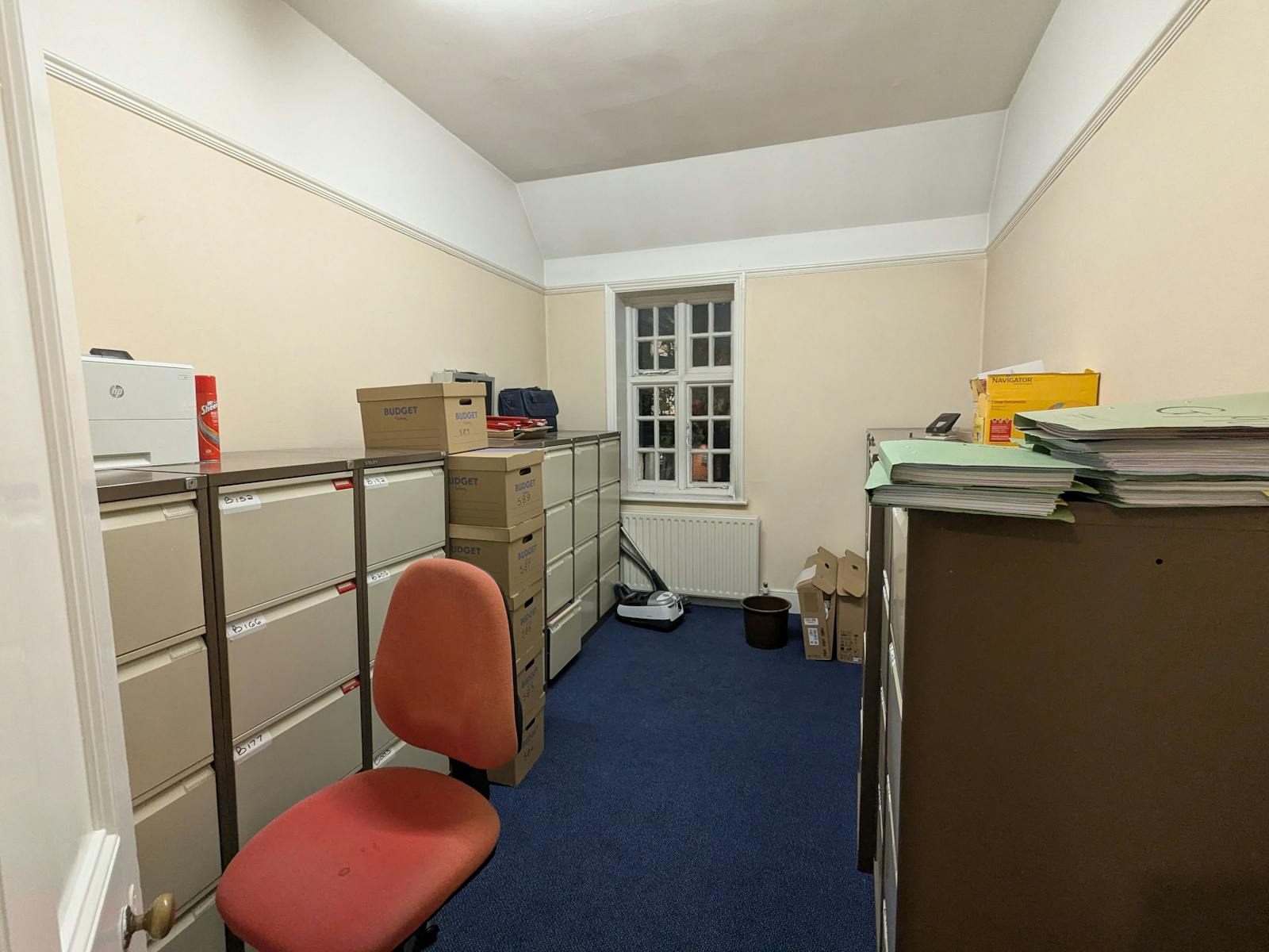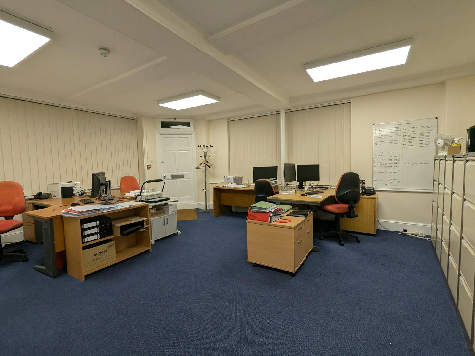 This office suite provides a functional mix of open-plan workspace and private glazed offices within a character building. The space features carpeted floors throughout, modern LED lighting and strategically placed power points to suit a variety of business needs. Additional amenities include ample built-in storage, a kitchenette, high ceilings and large windows that provide good natural light throughout.