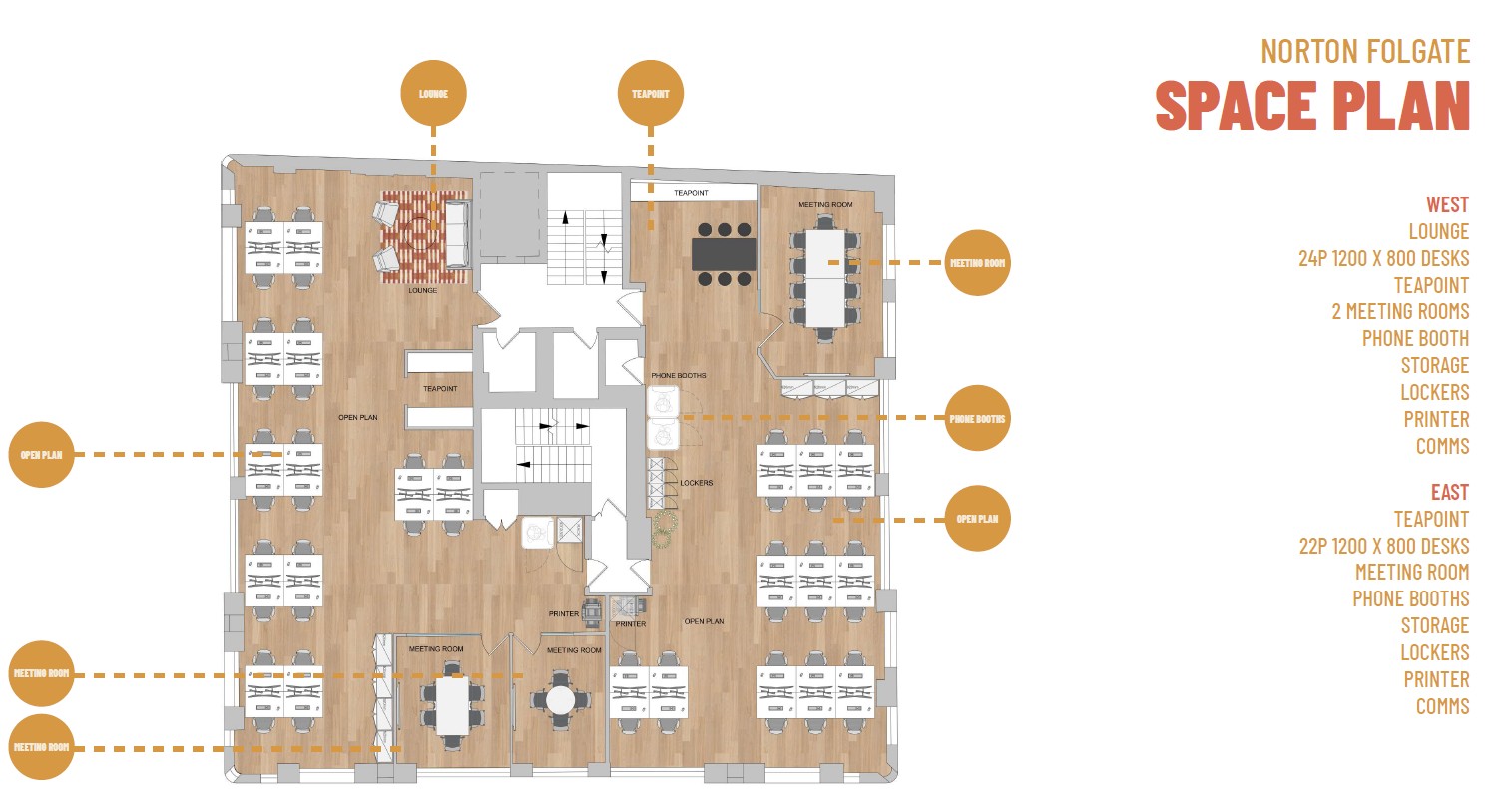Fourth Floor: Brand new, fully fitted and furnished, offering 32 desks, breakout space, and 3 meeting rooms.
