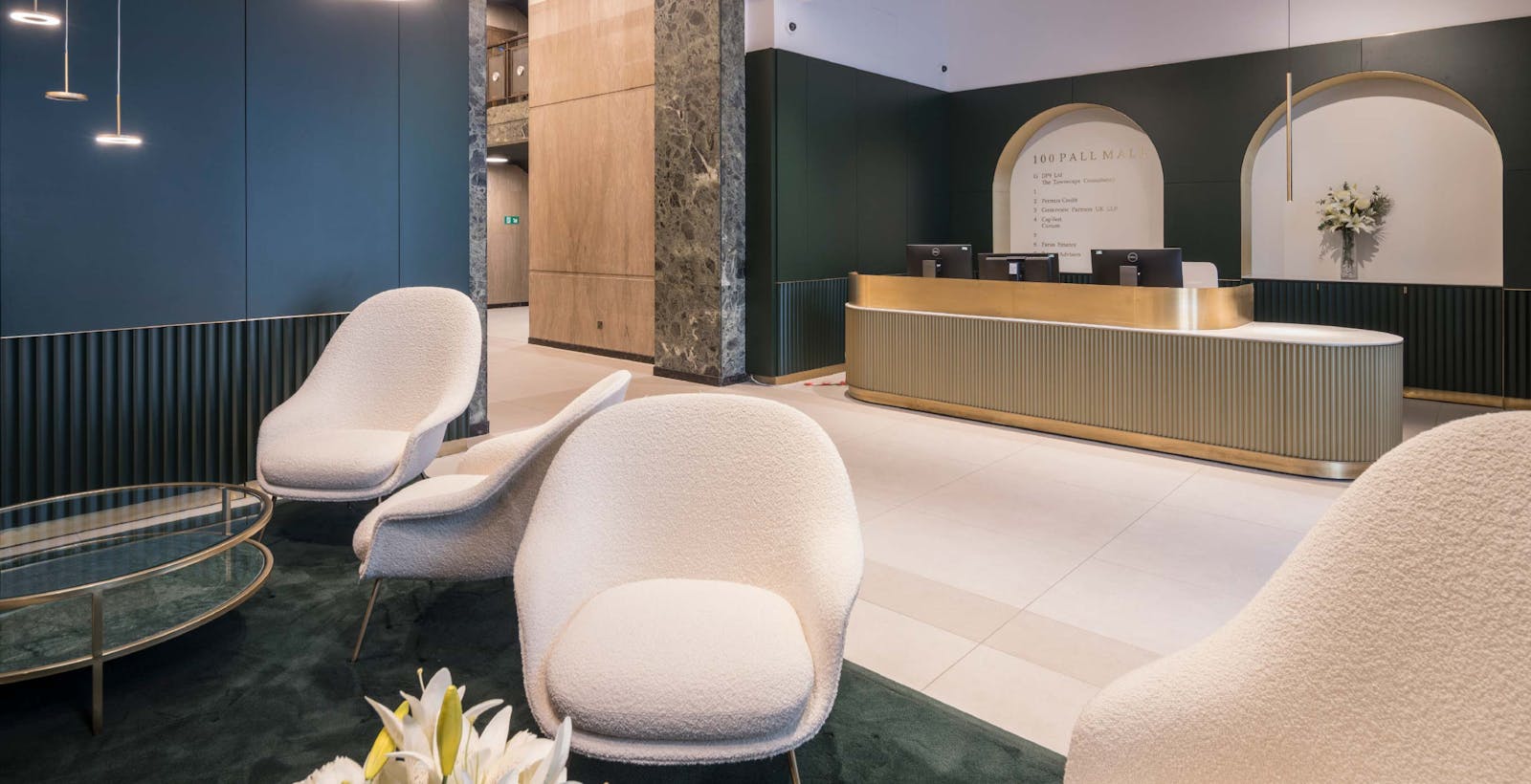 100 Pall Mall features a stylish new reception providing an impressive welcome to tenants and visitors. The arrival experience at the building has been transformed with considered design details throughout the reception. Feature lighting and exceptional finishes create a sense of luxury.