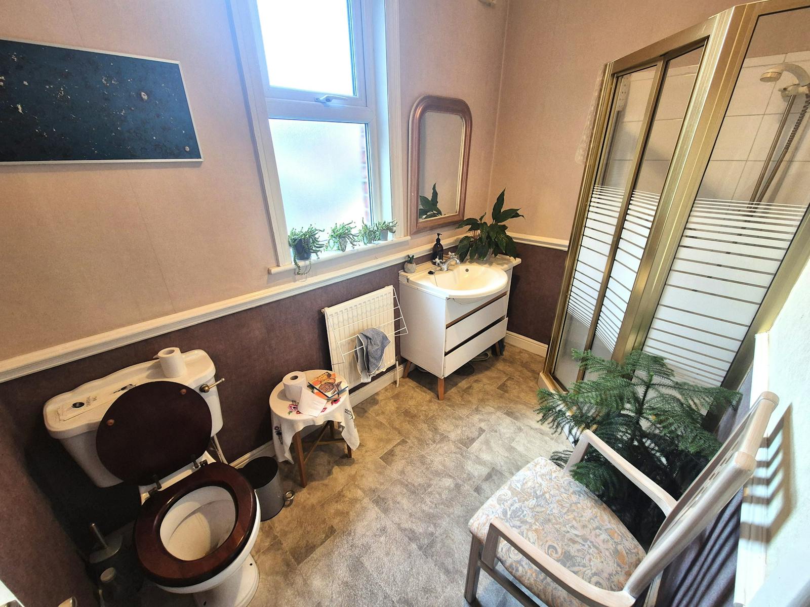 Bathroom with low level w.c, sink and shower cubicle.