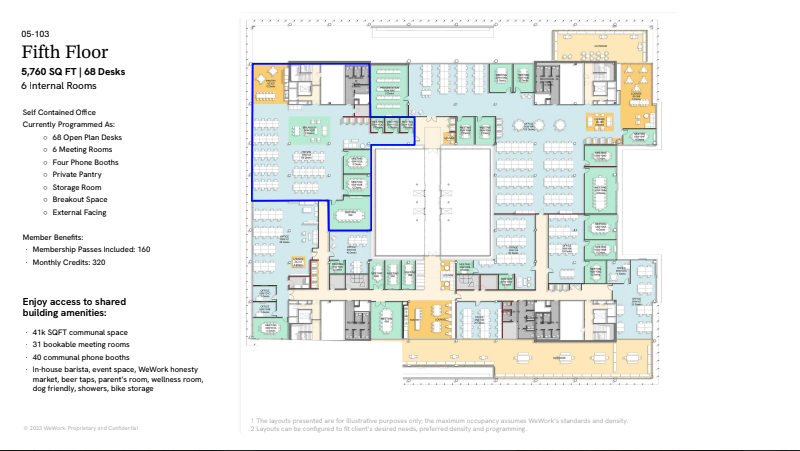 WeWork presents three floors of flexible workspace in this 6 storey building. Offering common areas, modern meeting rooms, coworking