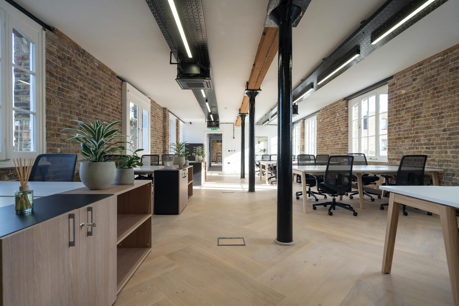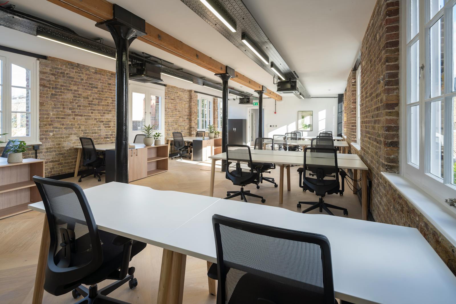 This newly refurbished second floor office at 16 Bowling Green Lane blends modern fit out with retained character features, including wooden beams, exposed brickwork and steel columns. The accommodation is fully fitted to include 20 desks, three meeting rooms, a breakout area with soft seating, a demised kitchen and WC facilities.