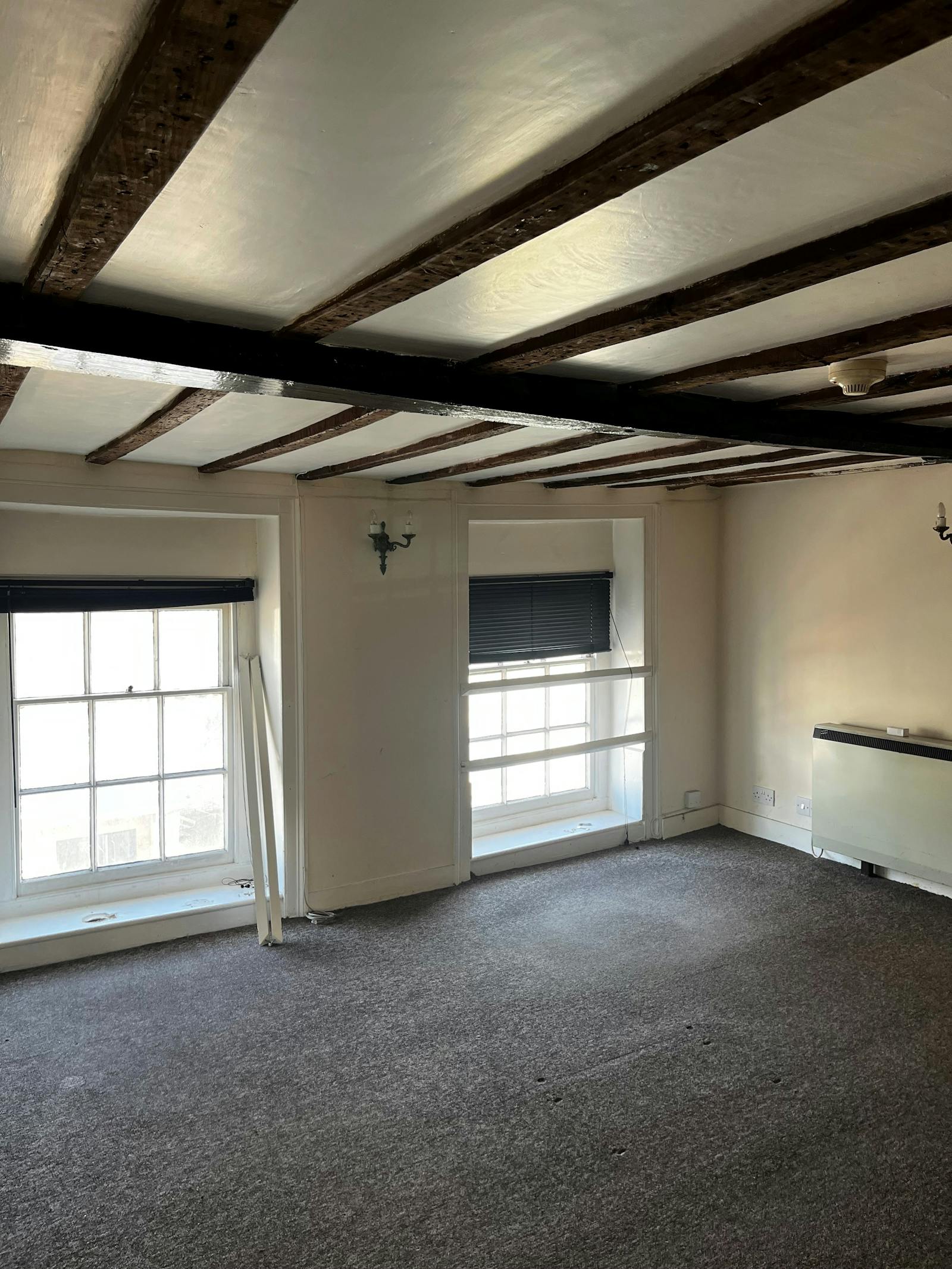 Suite 14 — 25.7 sq m (277 sq ft) single room with carpet and wall heater, window to front, feature beams. Rent £325.00 pcm plus VAT.