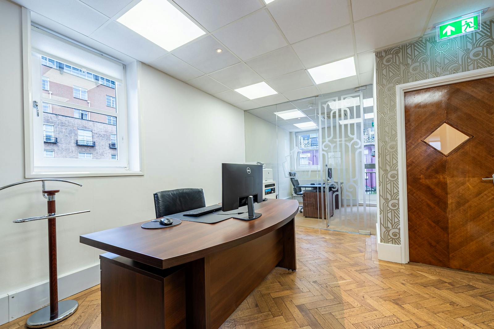 The suite is offered on highly flexible terms, with a comprehensive package that includes rent, business rates, service charge, cleaning, most utilities, and quality furnishings. IT and connectivity options are also available, allowing for a seamless move-in experience. Housed within a very special building that blends timeless elegance with modern convenience, this office represents a unique opportunity to work in one of London’s most refined and well-connected districts.
