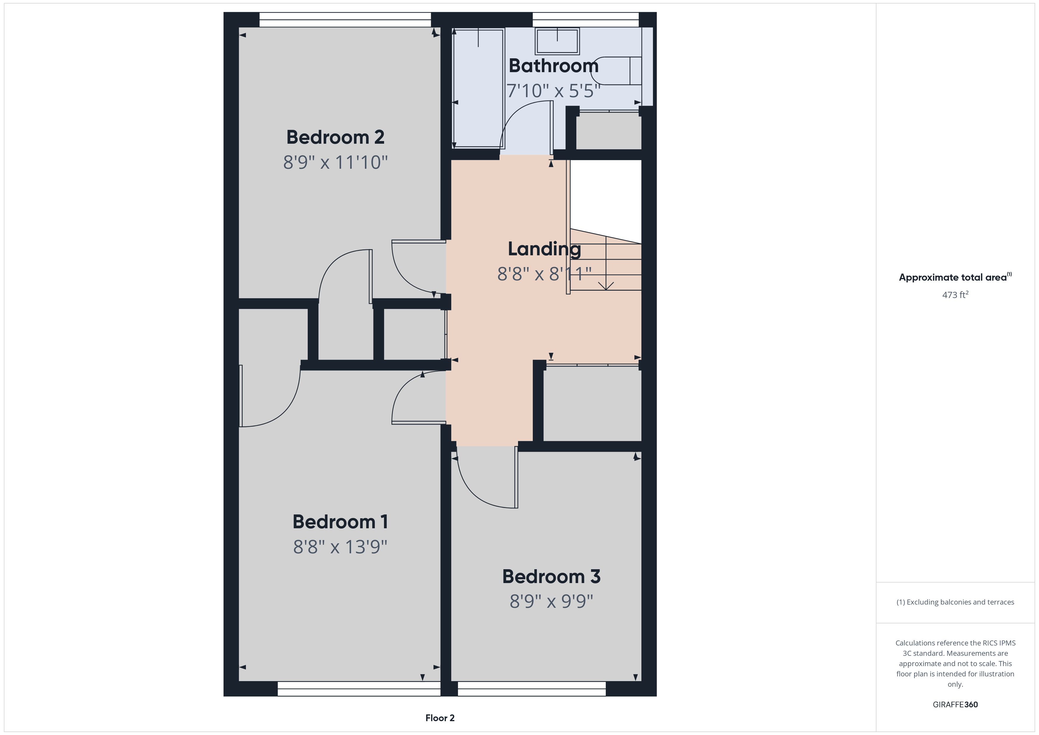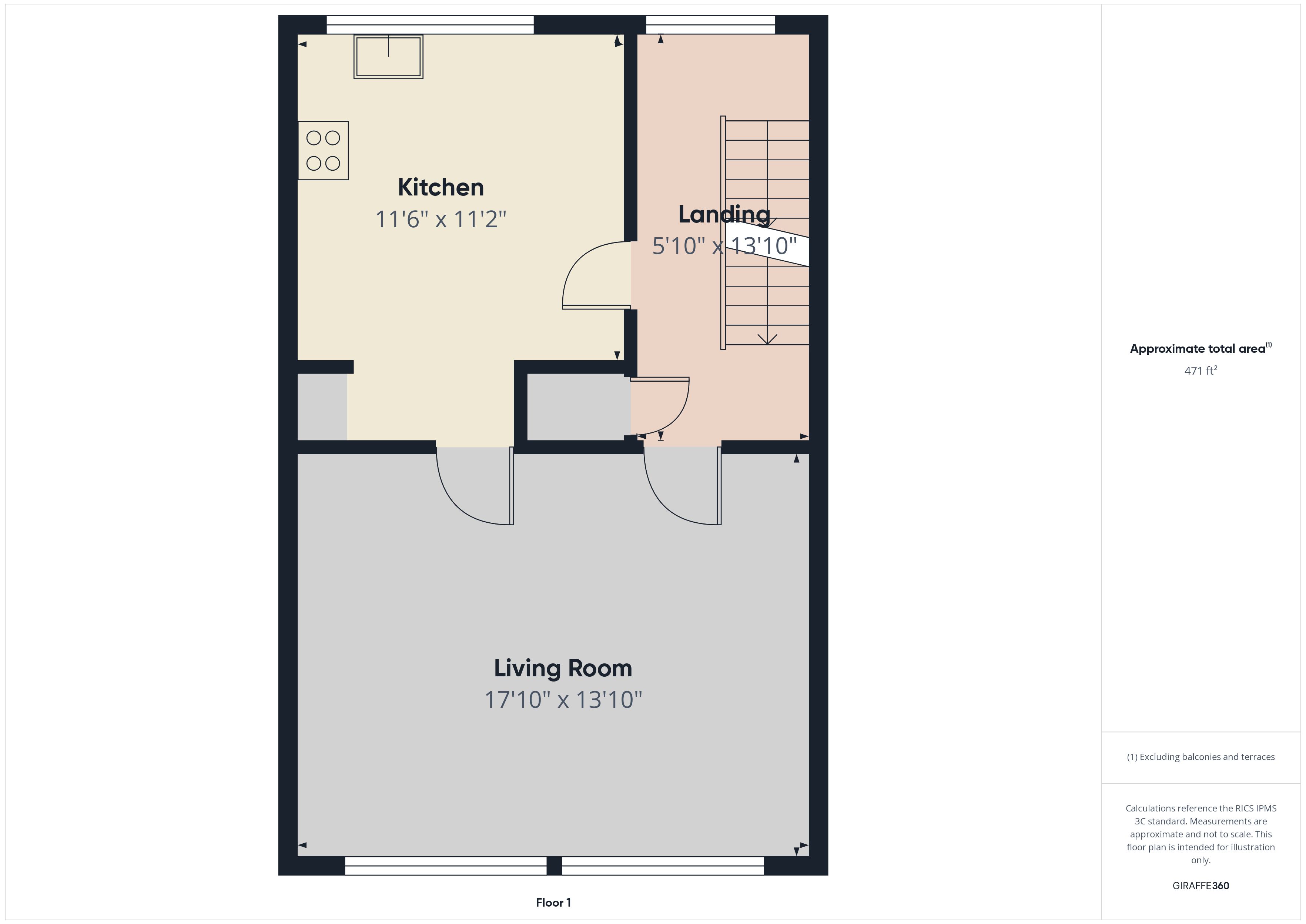 The flat measures approximately 944 Sq ft. The first floor comprises a large street facing living room with a kitchen and landing area. The three bedrooms and bathroom are located on the second floor.