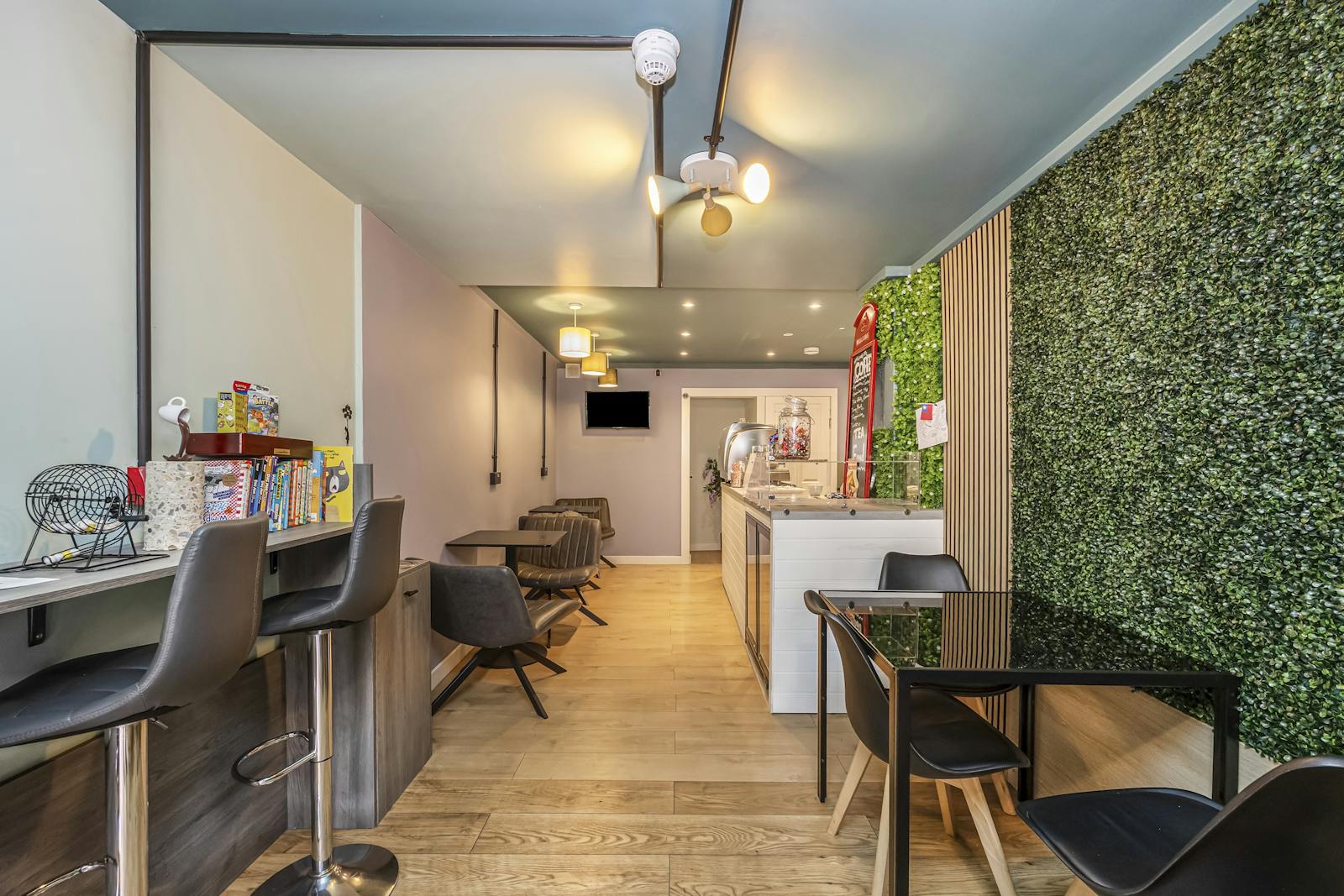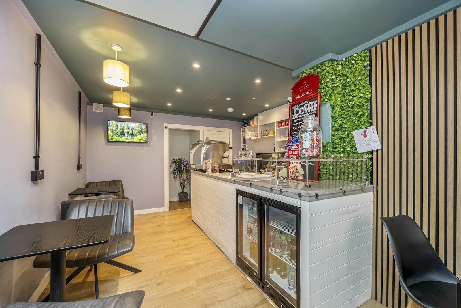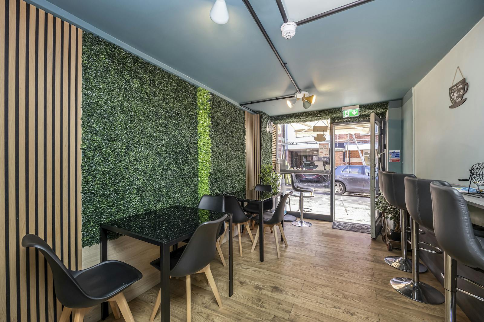 The premises occupy a prominent ground floor commercial unit, arranged in an open plan configuration, incorporating a full service bar and counter, wood effect laminate flooring, contemporary LED lighting, and a well executed modern interior fit out.