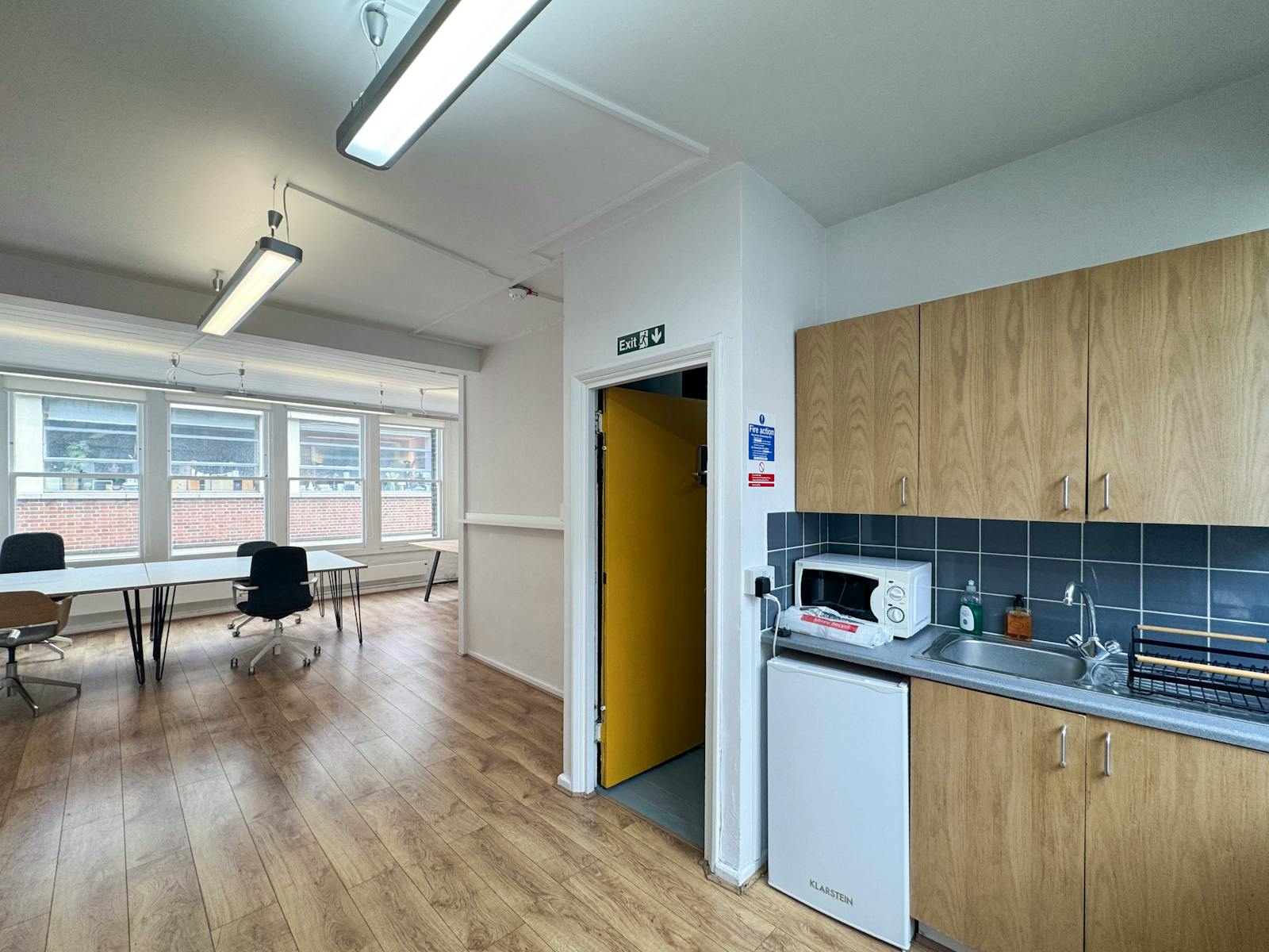 First Floor: Includes a glazed, partitioned director’s office / private meeting room, high ceilings, plus access to a rear fire escape and light well.