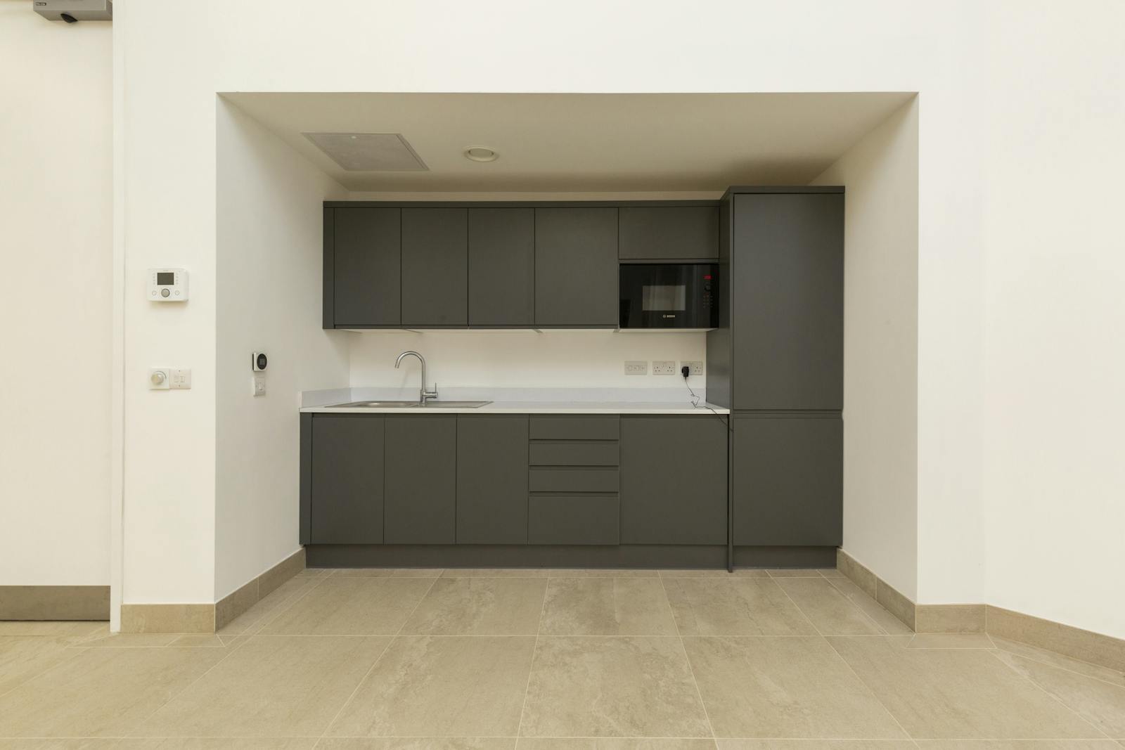The space includes LED lighting, CAT 6 cabling, air conditioning, and kitchenettes on each floor. Access is via a private gated courtyard, set back from the street and next to Haggerston Park. On-site parking is available for an additional fee.