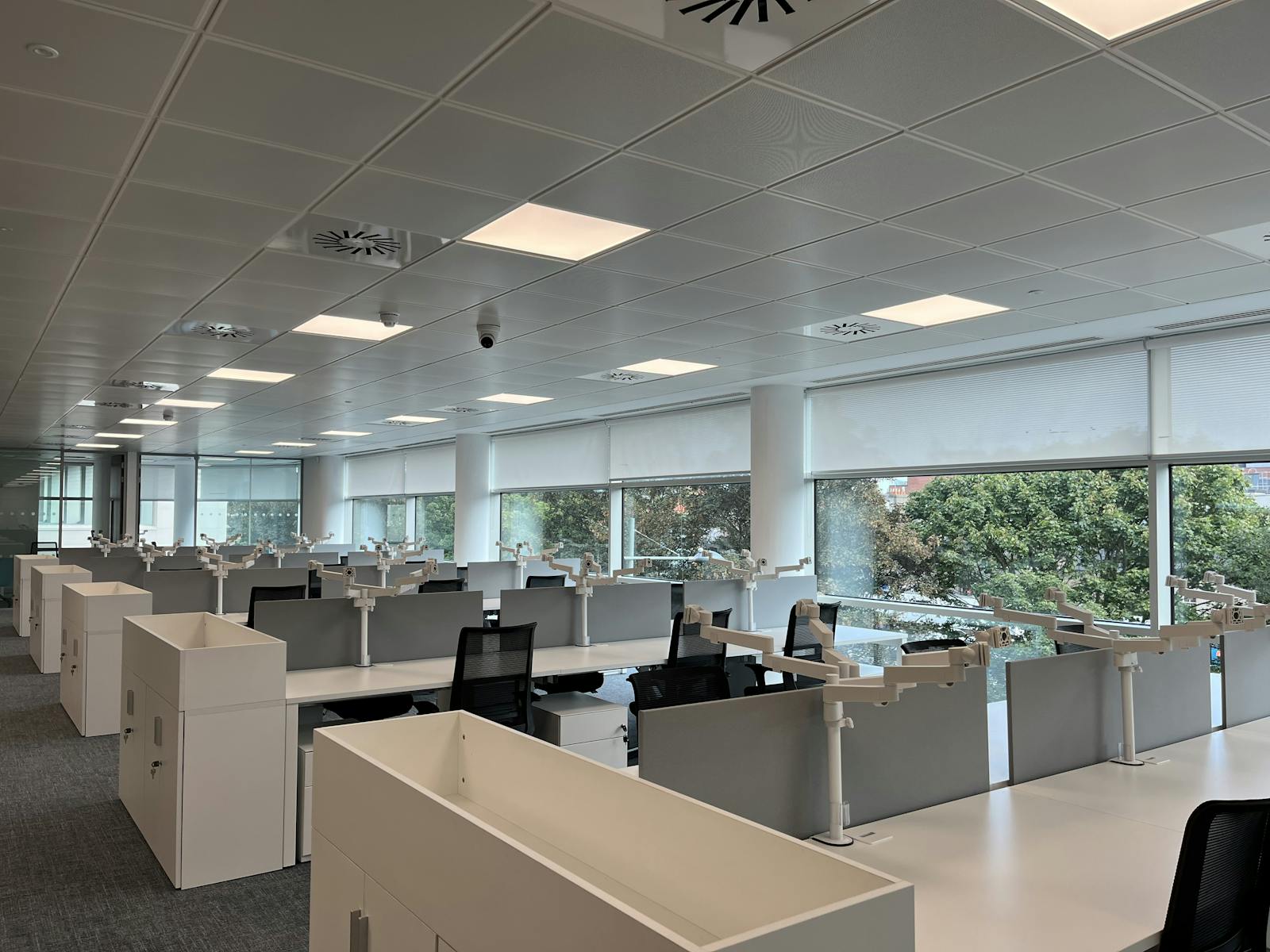 Suspended ceiling at 2.7m clear height, with perforated acoustic metal tiles