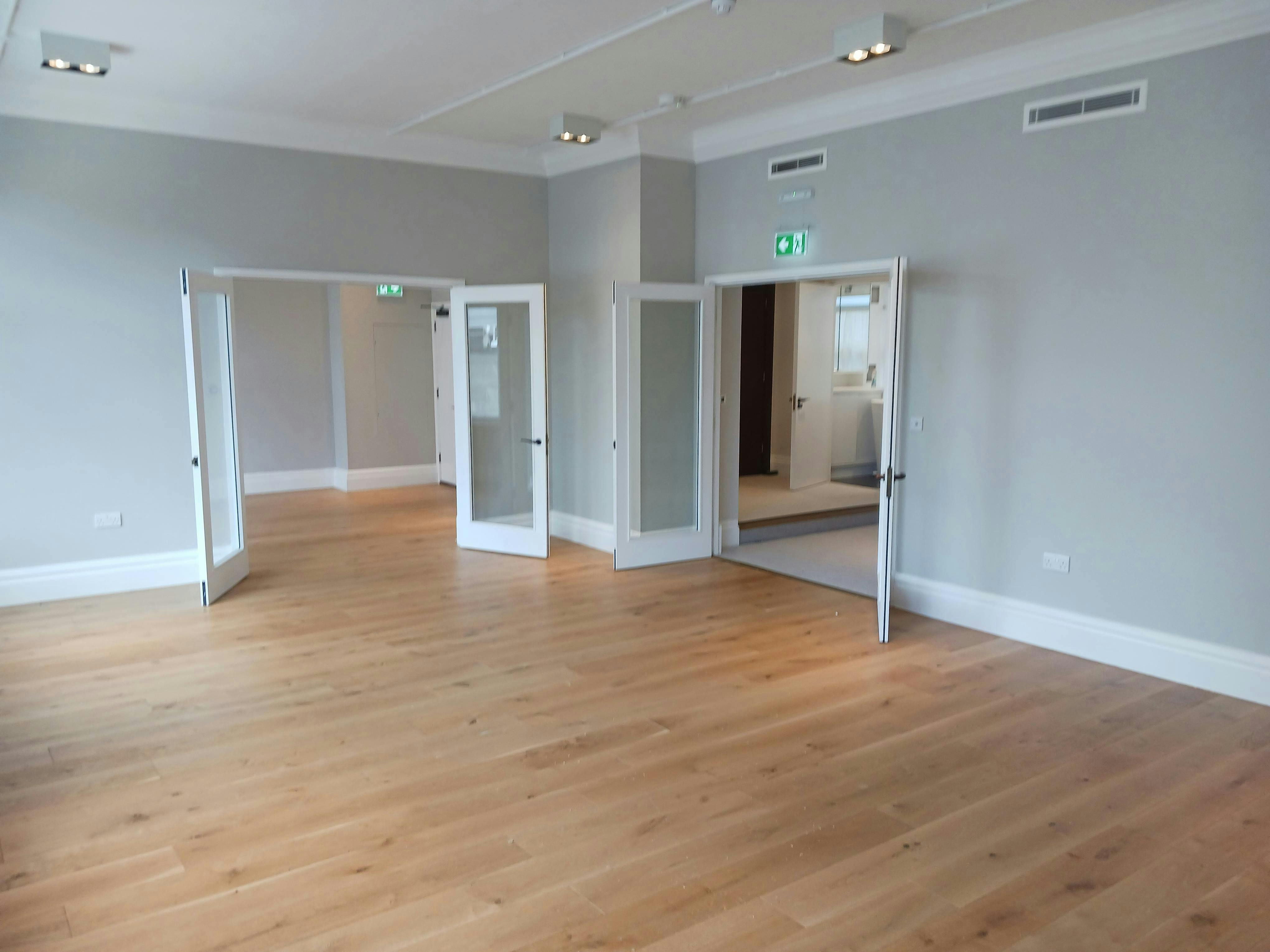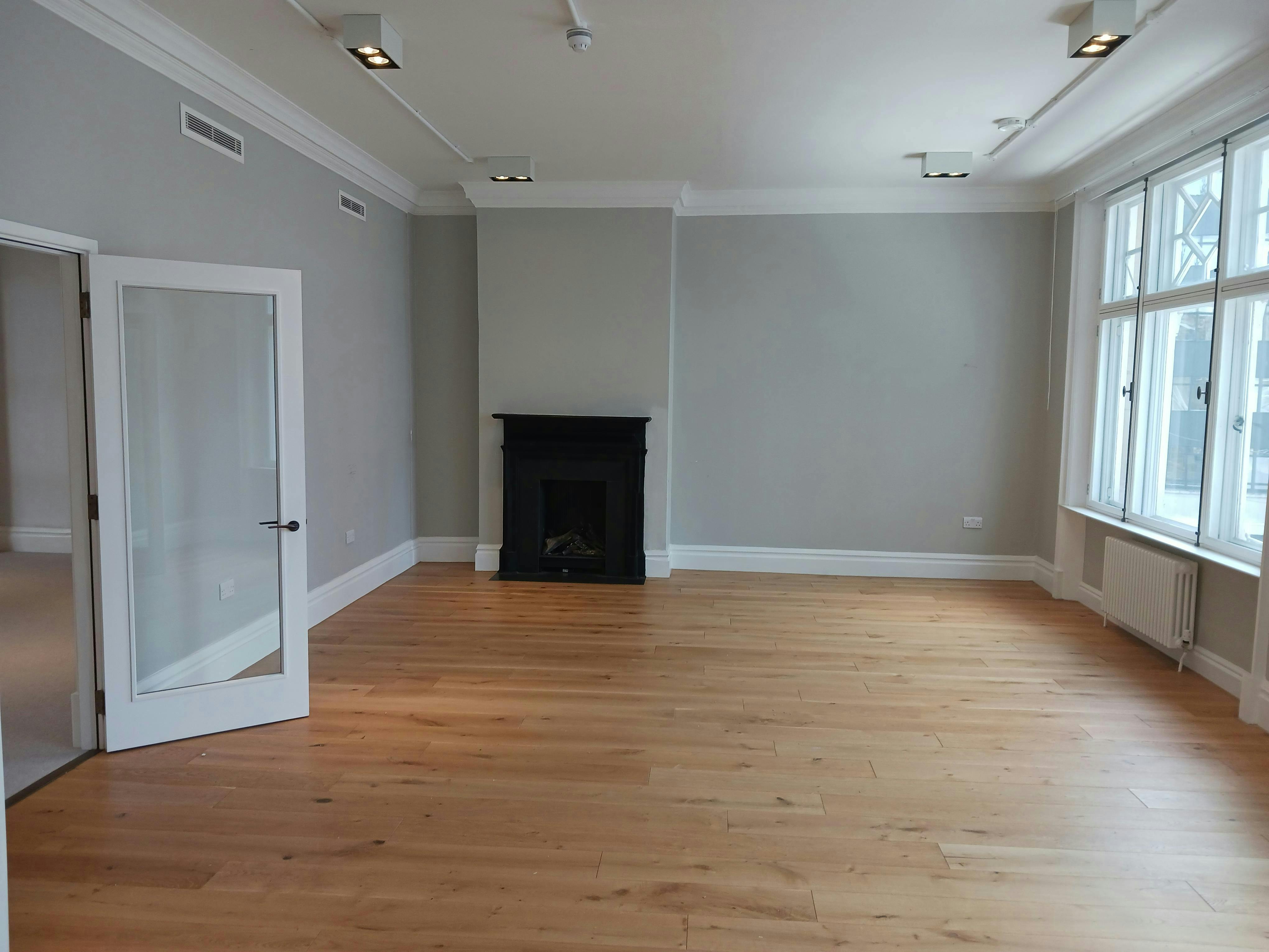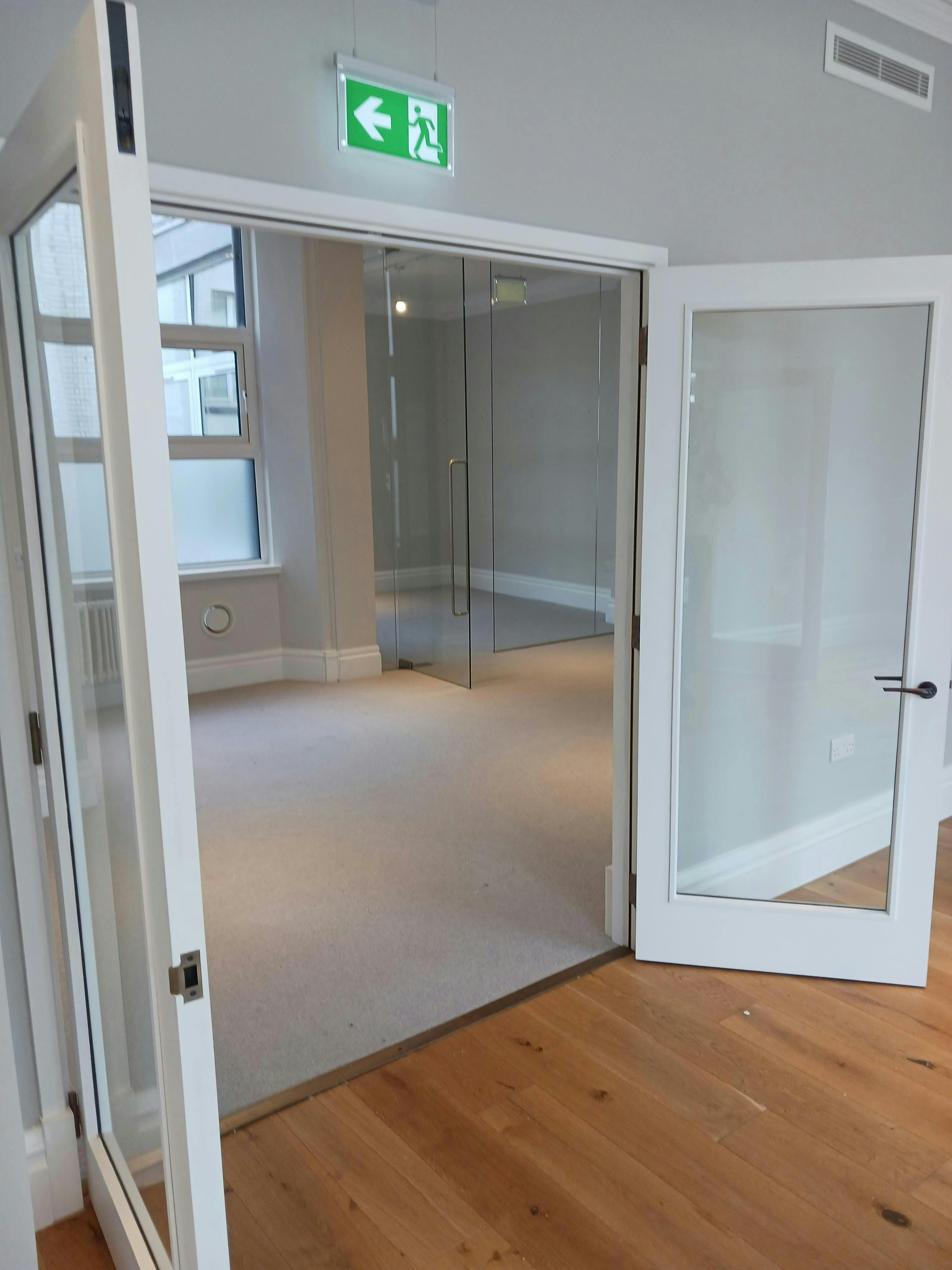 A self-contained office of 1,138 sq ft over the whole second floor, arranged as an open area, two large offices to the front and a meeting room to the rear.