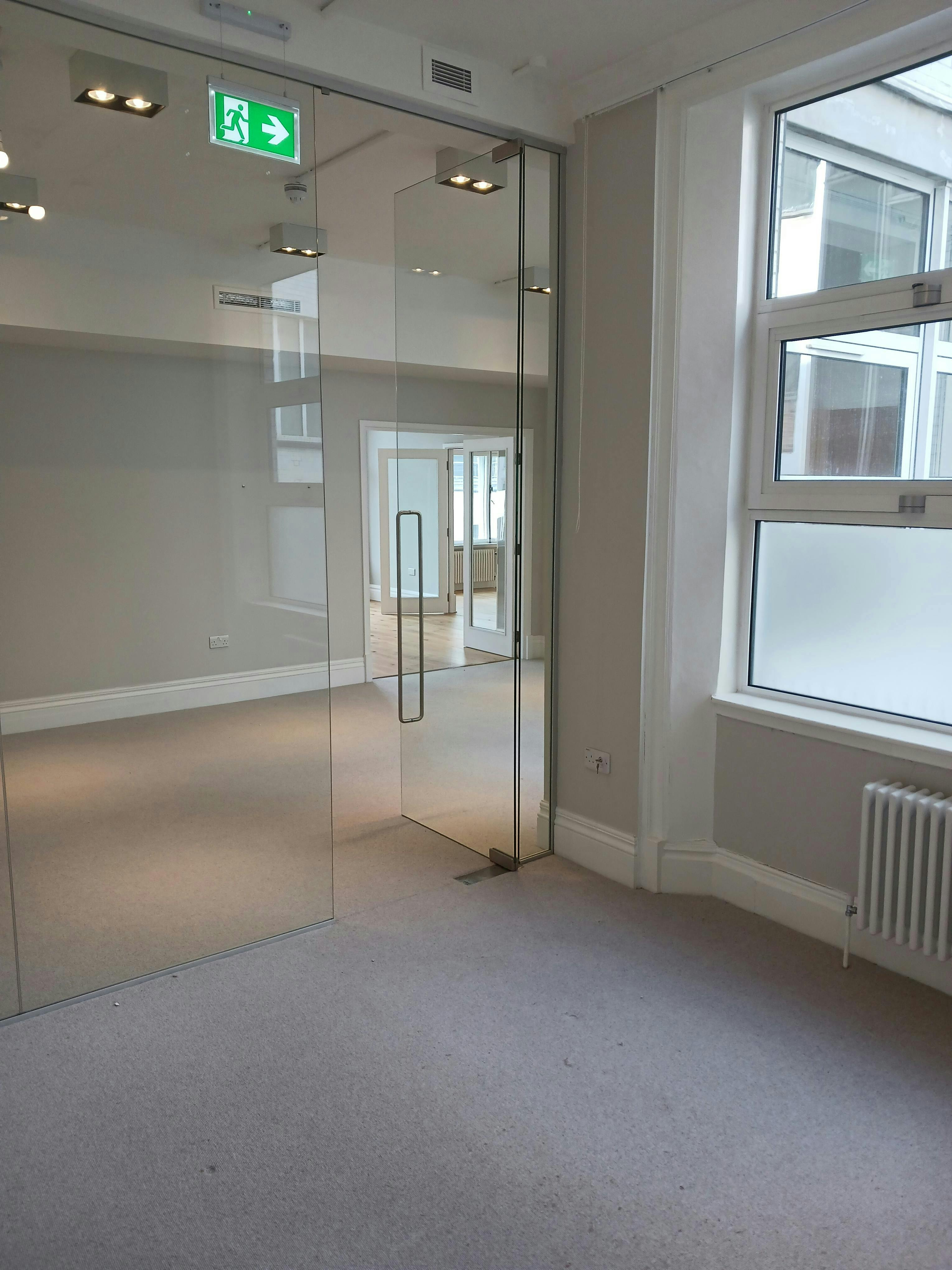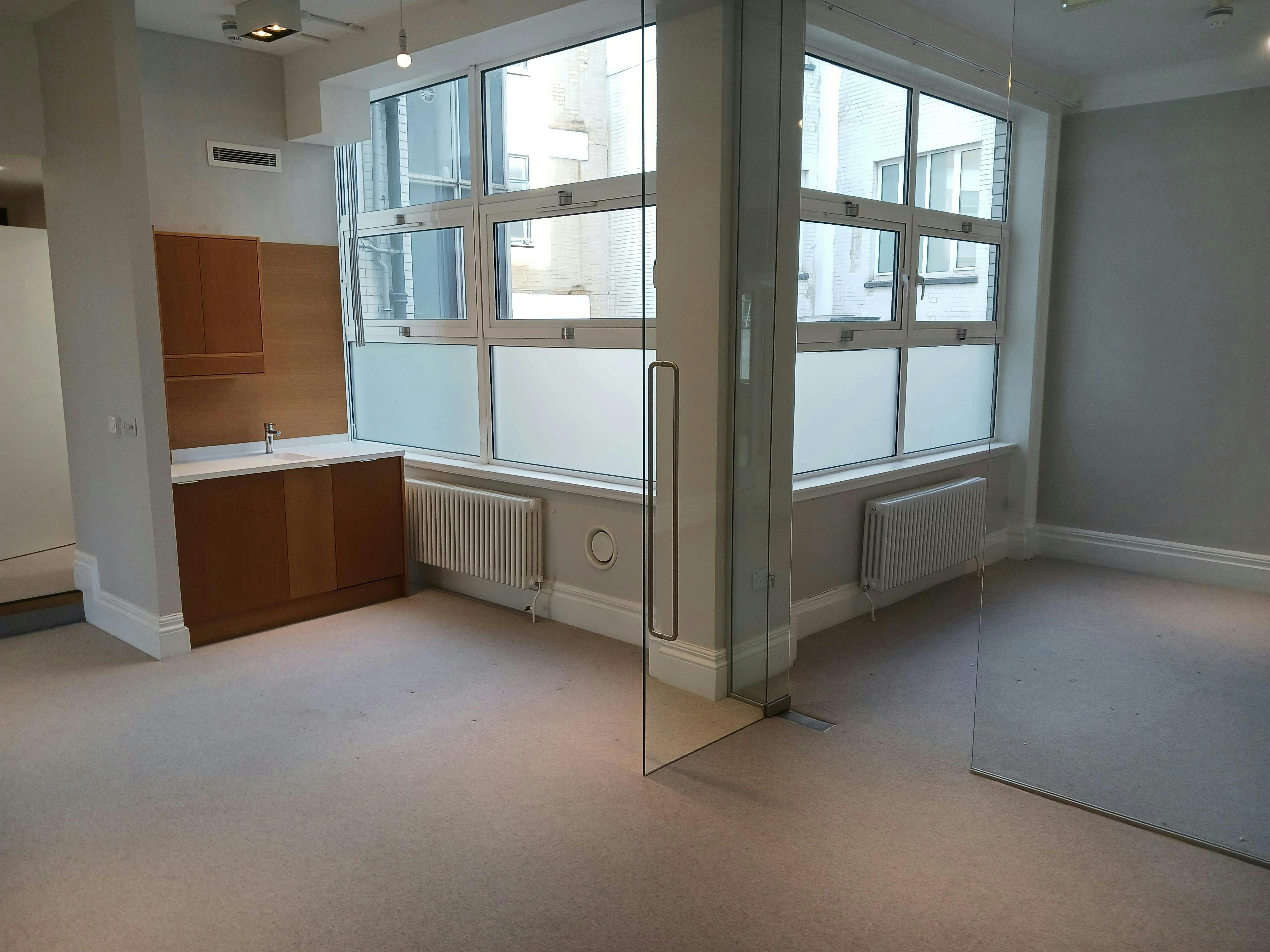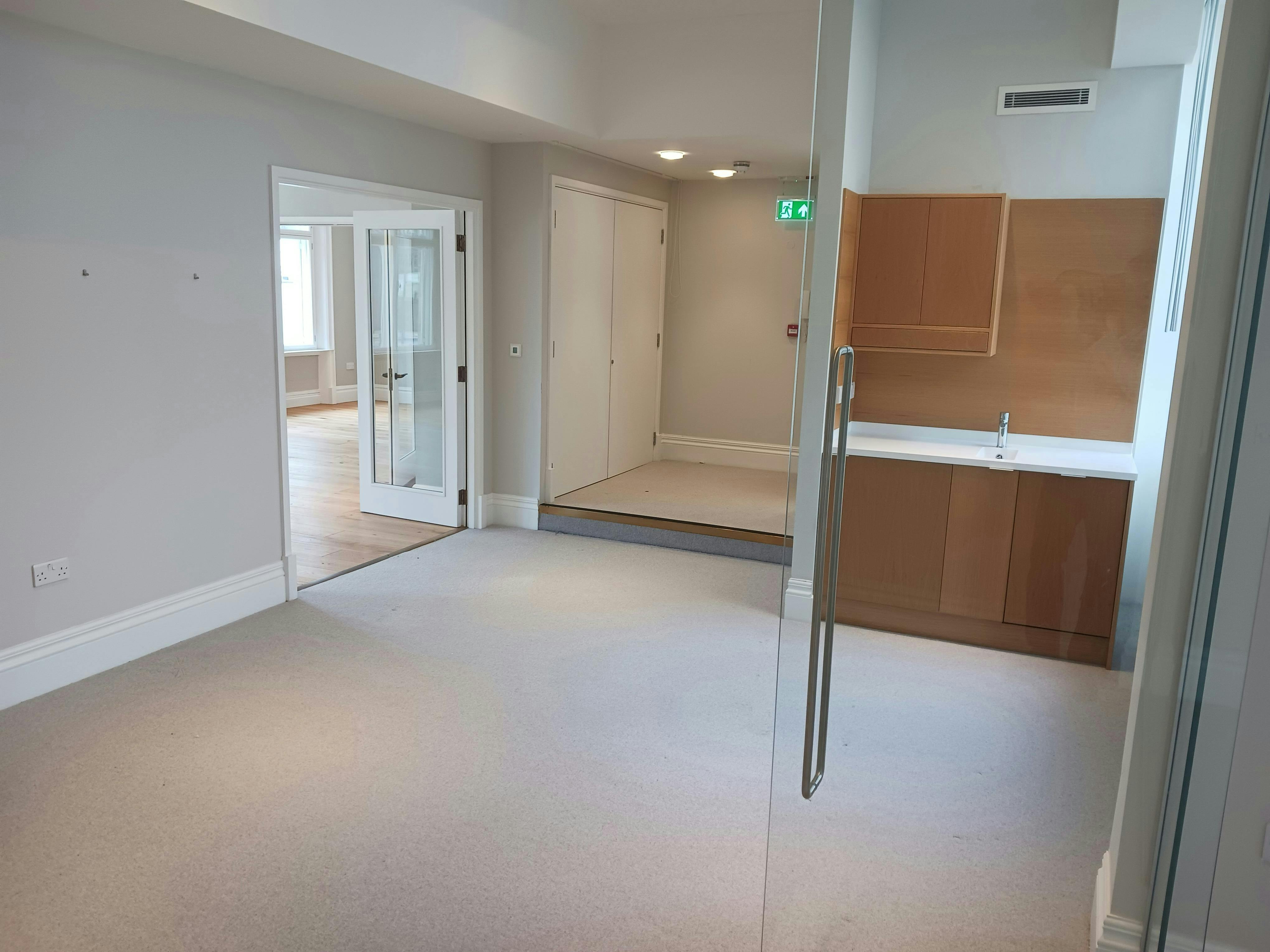 A self-contained office of 1,138 sq ft over the whole second floor, arranged as an open area, two large offices to the front and a meeting room to the rear.