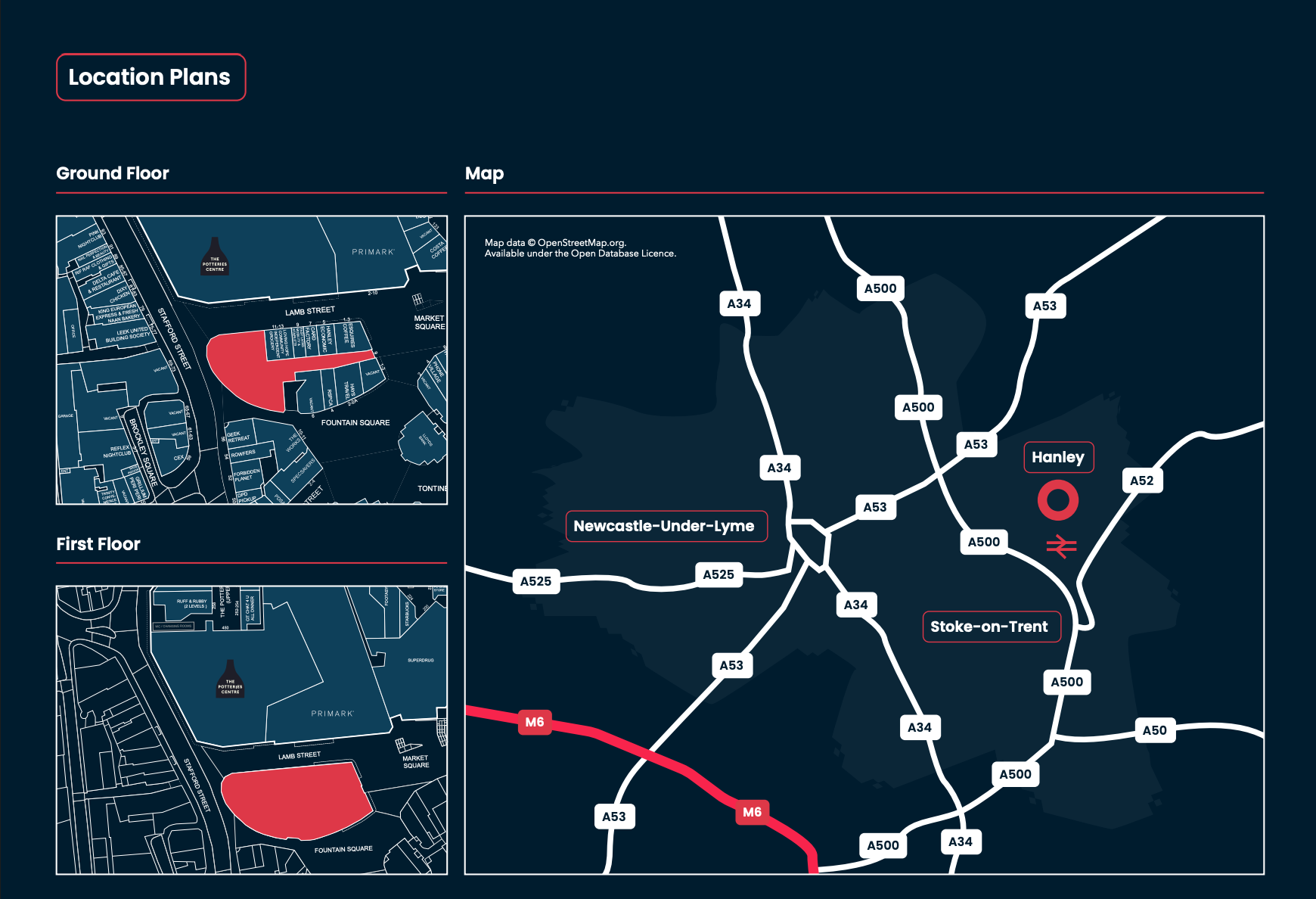The subject premises forms part of highly prominent island site in the heart of Hanley’s prime retail area, adjacent to Primark and the 560,000 sq ft Potteries Shopping Centre & Hanley Indoor market. Other nearby occupiers include Card Factory, Hays Travel, Specsavers, Esquires & The Works.