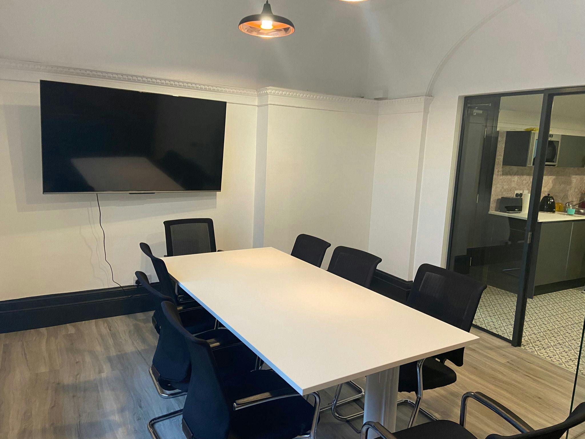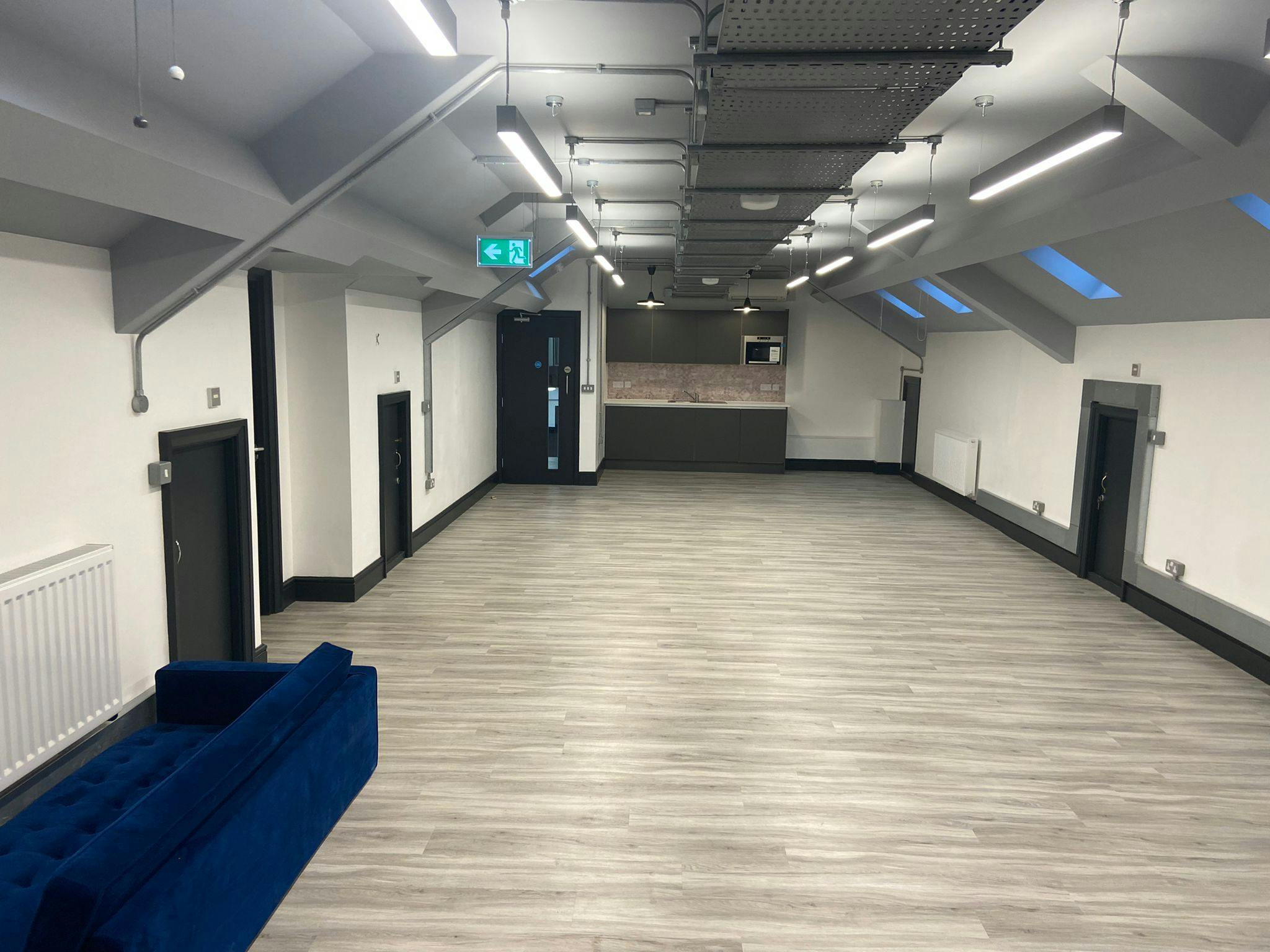 The space is located on the top floor with exposed services, suspended LED lighting and two air-conditioning units. The suite includes a kitchenette, with WCs and shower facilities located within the common areas of the building.