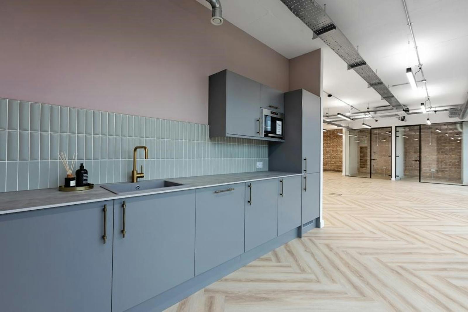 This studio style office is located on the second floor of this mixed-use building providing contemporary open plan office space plus three glazed meeting rooms, kitchen point and two w.c.s.