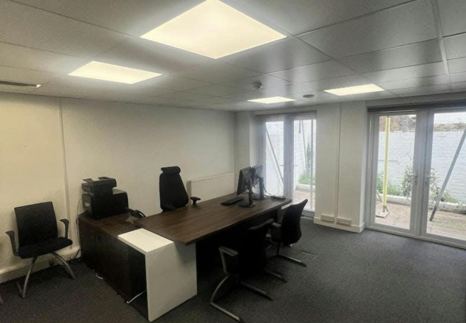 The accommodation provides flexible and well-presented workspace, with a kitchen on the ground floor, WC facilities on each level, and access to a private rear terrace. Two reserved parking spaces are situated directly outside the building, a rare advantage in this central location.