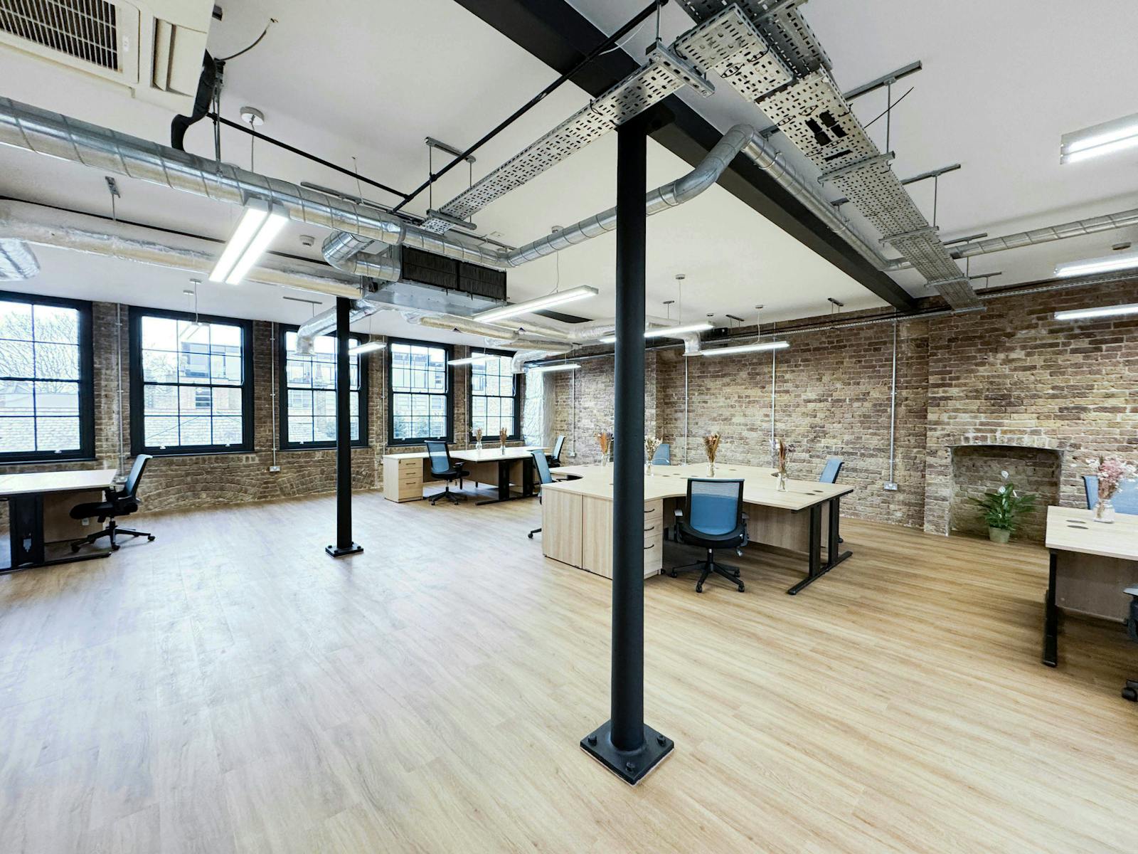 The available floor offers a characterful warehouse aesthetic, with exposed brickwork, retained original industrial features, and excellent natural light from both the front and rear elevations. The space benefits from comfort cooling, modern lighting, Cat V data cabling, timber laminate flooring, and dedicated male and female WC facilities, creating a practical and well-balanced working environment.