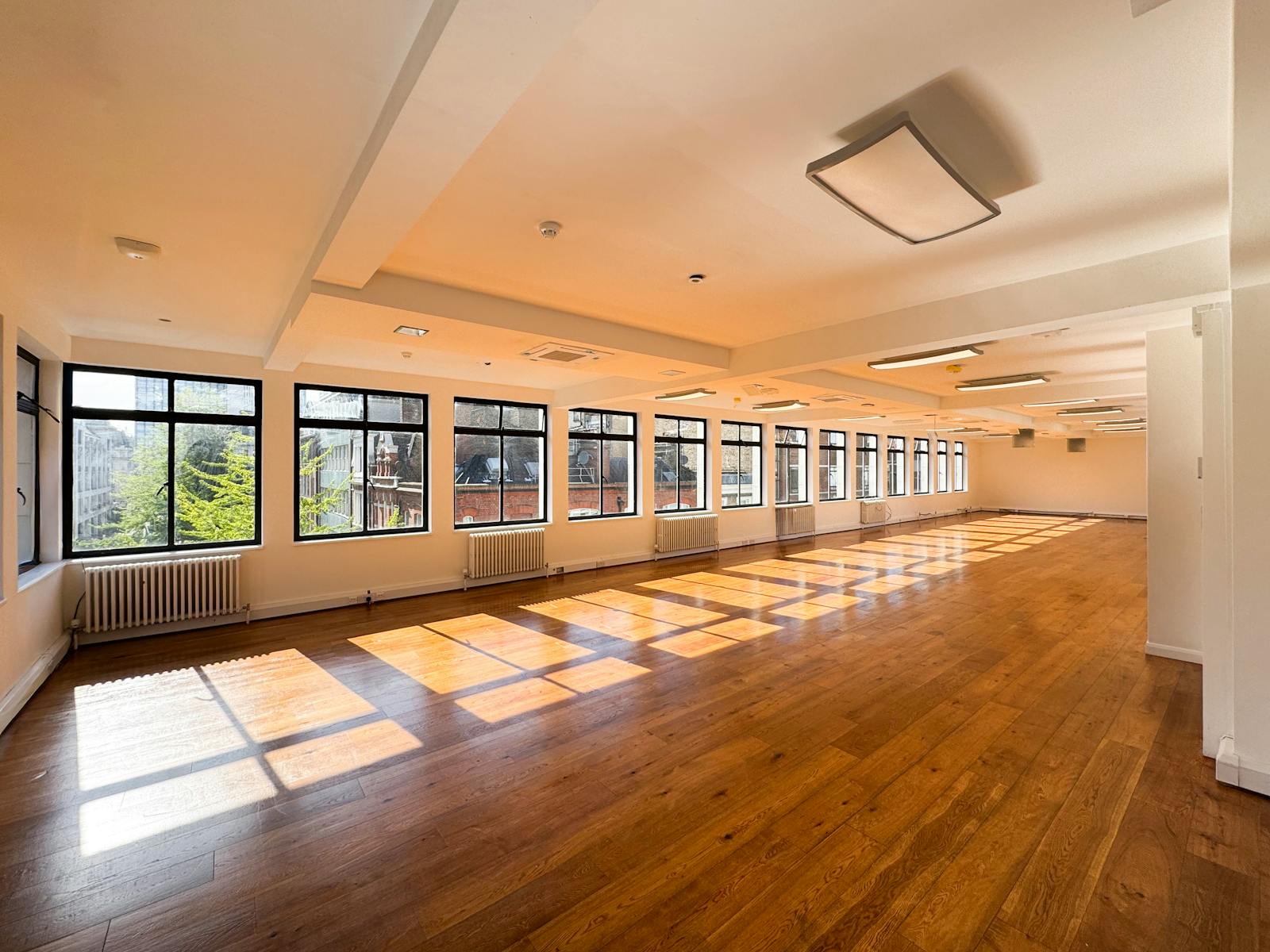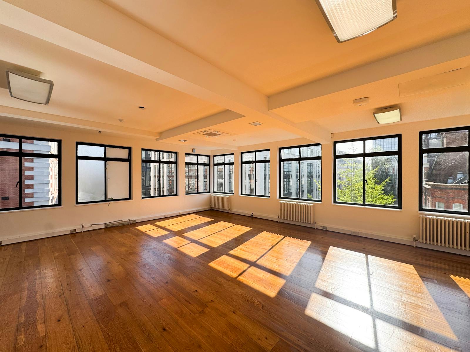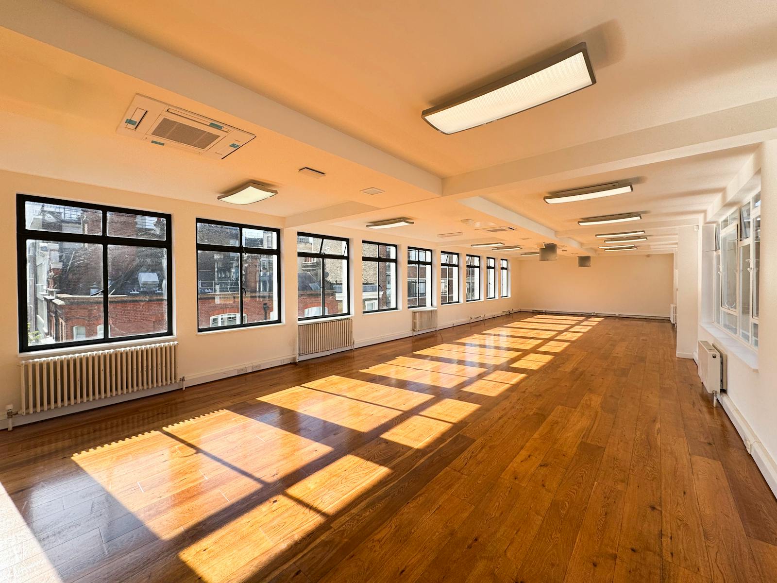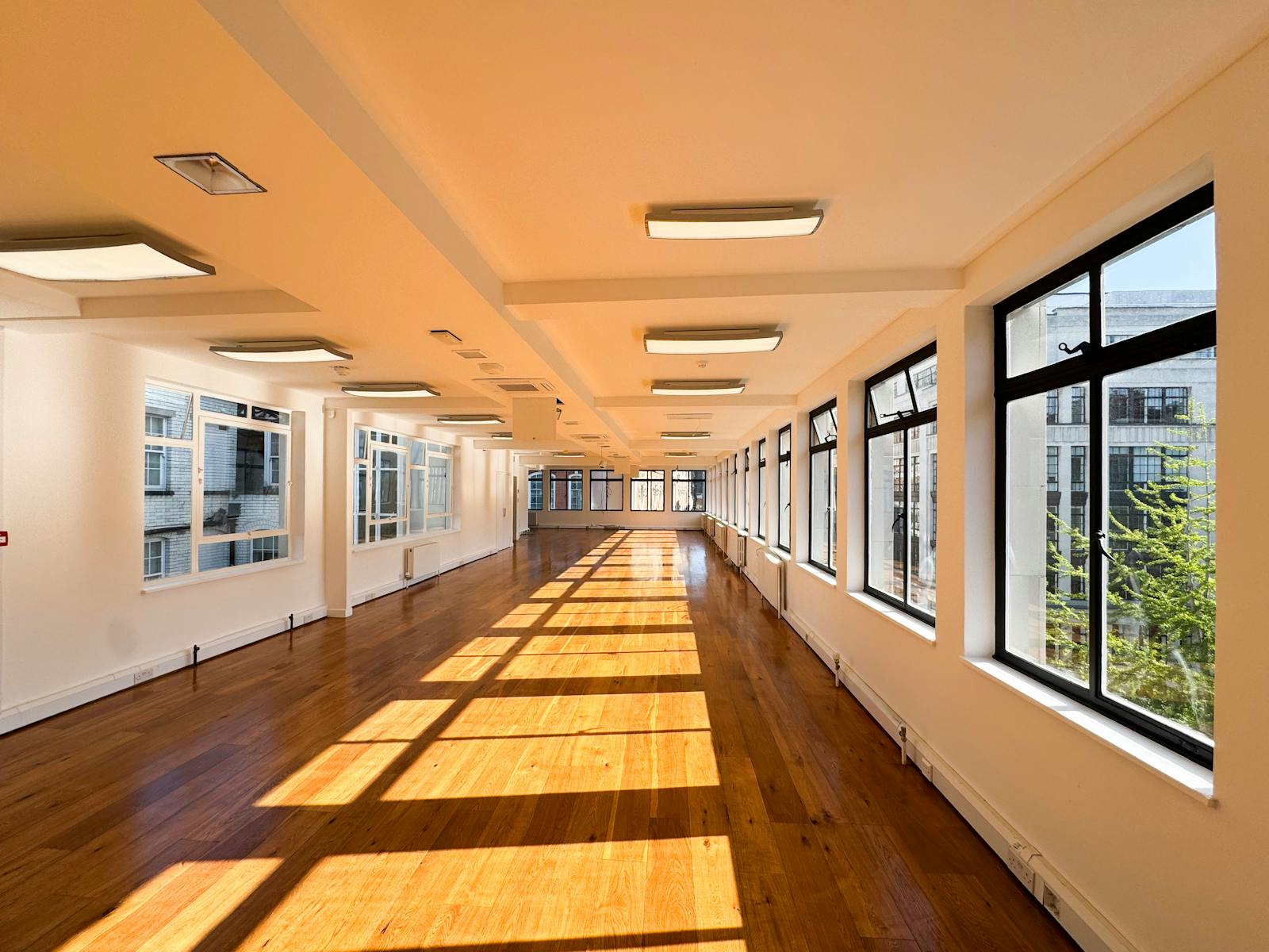 The accommodation includes newly sanded and varnished timber flooring, serviced air conditioning units, roller blinds, perimeter trunking, LED lighting, fibre connectivity (not tested), and a fitted kitchenette.