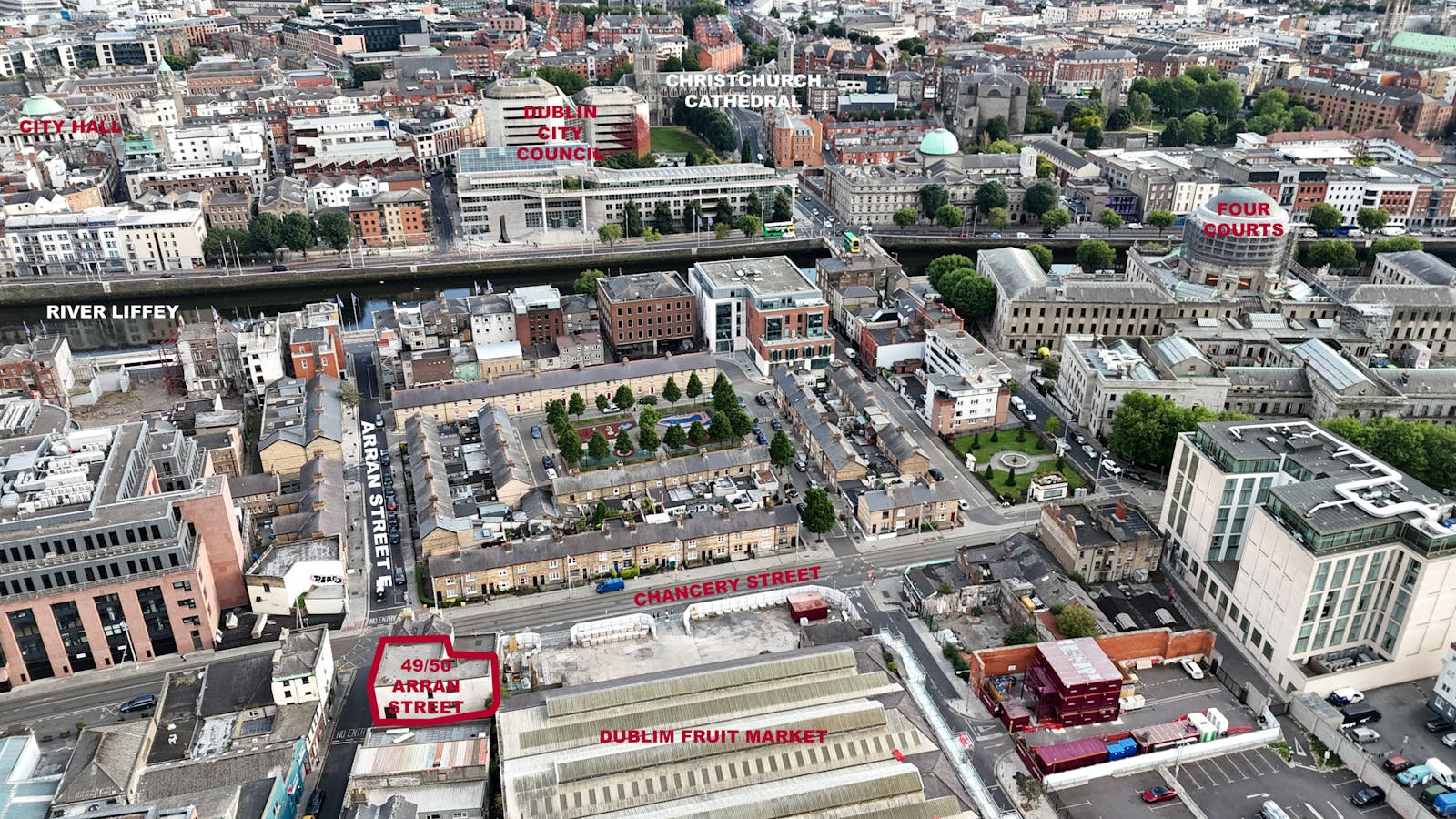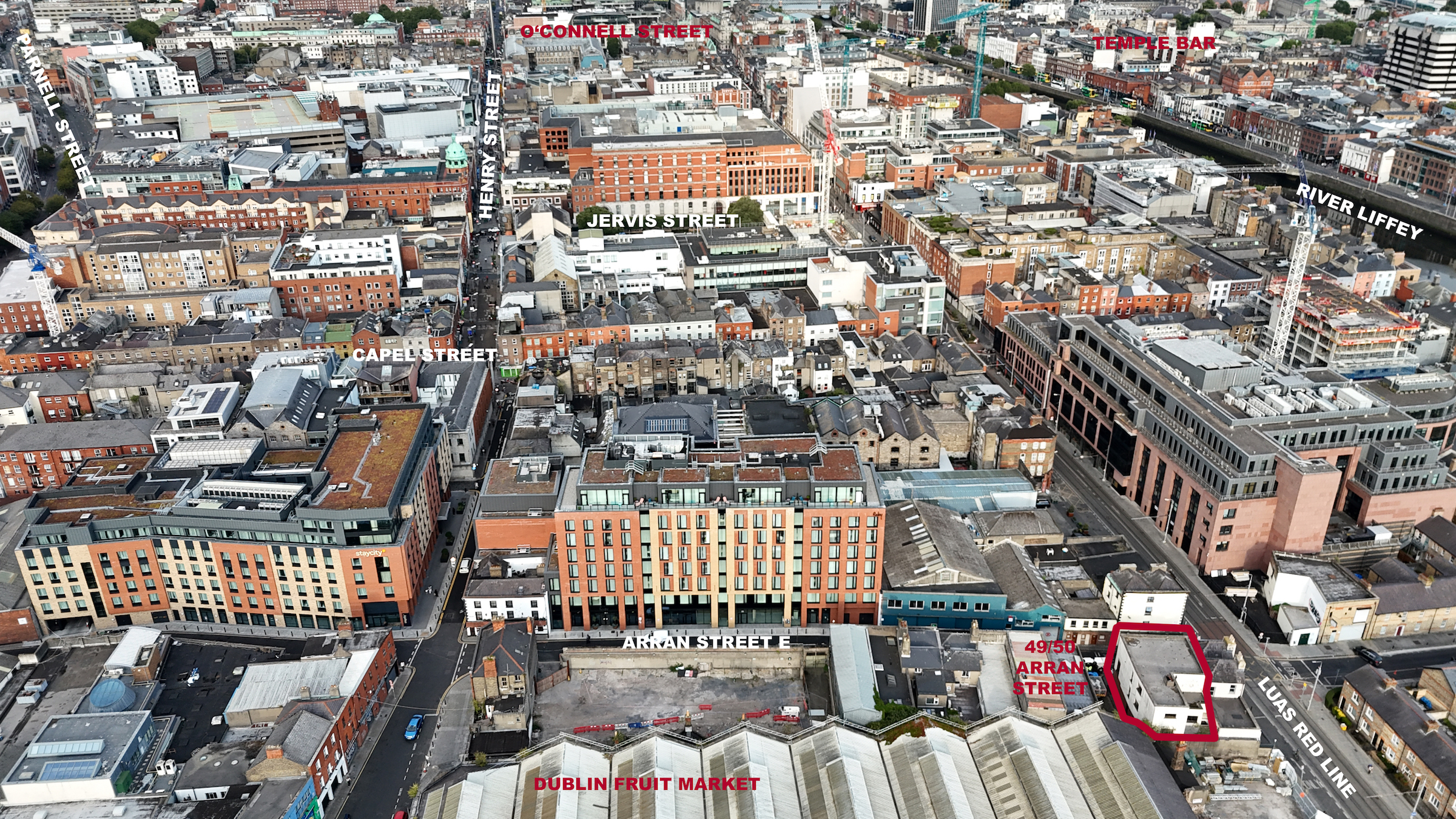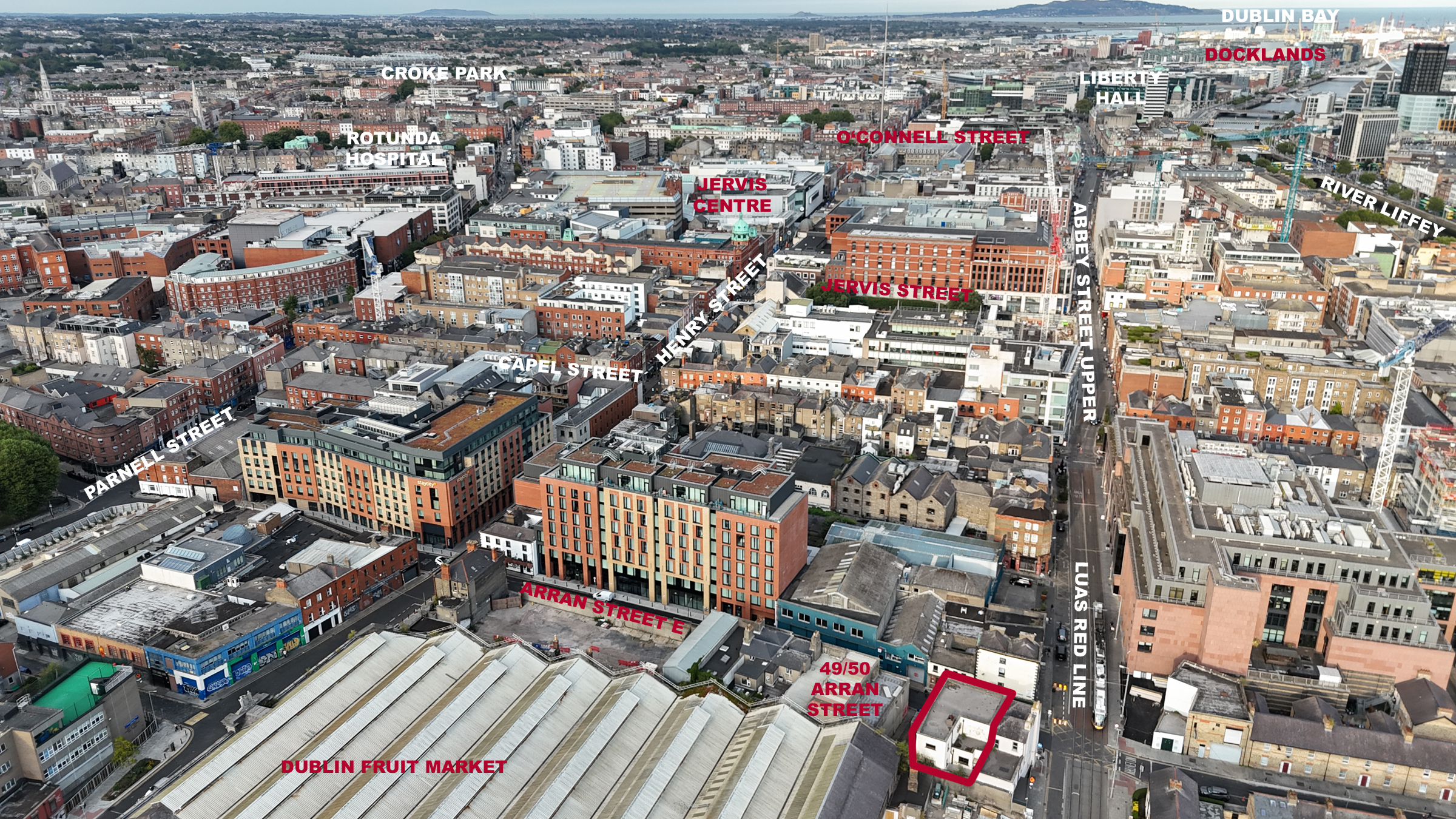 This area of the city is due to be regenerated with the redevelopment of the Victorian Fruit and Vegetable market as a Continental Style Food Market with access immediately adjacent to 49-50 Arran Street East, the development of a Staycity Aparthotel Complex on the opposite corner to Arran House and plans for an eight storey, 98-bedroom hotel on the nearby site of the former Boland Biscuit Factory.