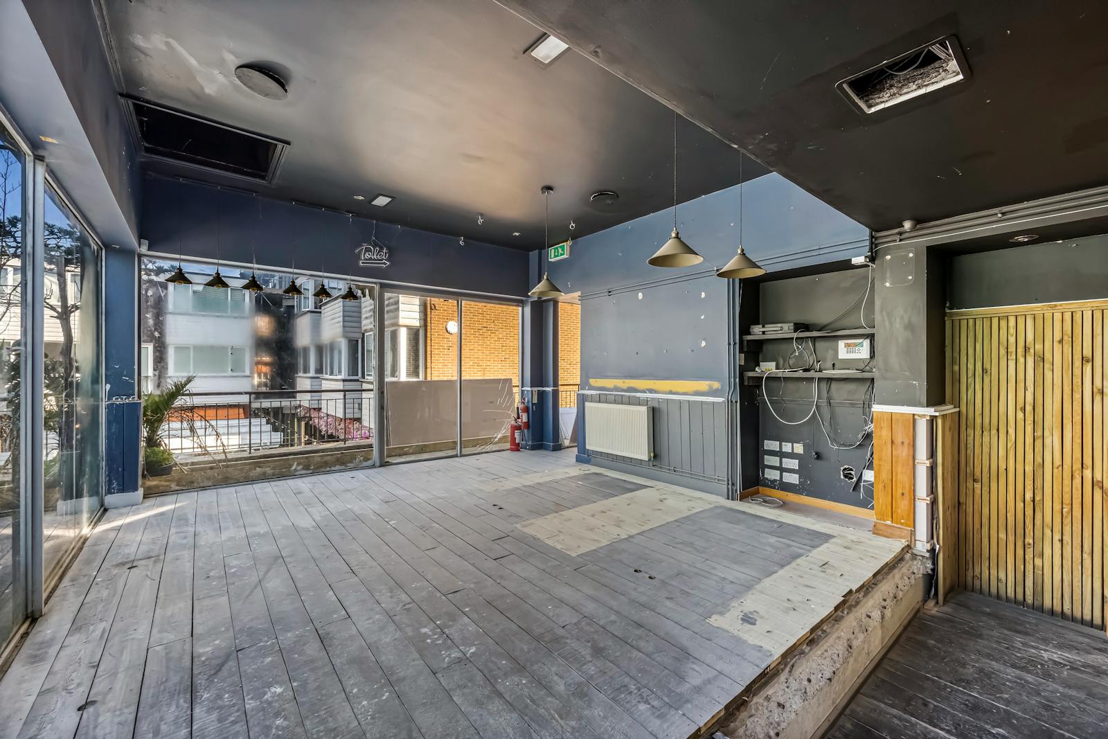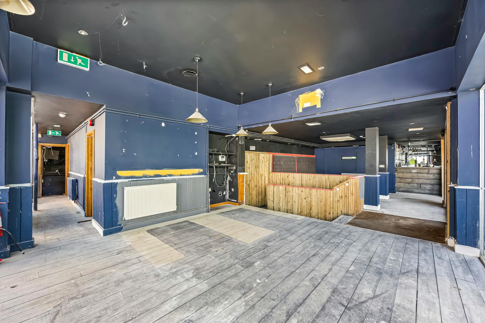 The first floor kitchen, which is no longer included within the demised premises, is fully fitted with a comprehensive modern extraction system together with pizza ovens, commercial grade fridges and freezers, a walk-in cold room, durable industrial flooring and multiple stainless steel preparation stations.