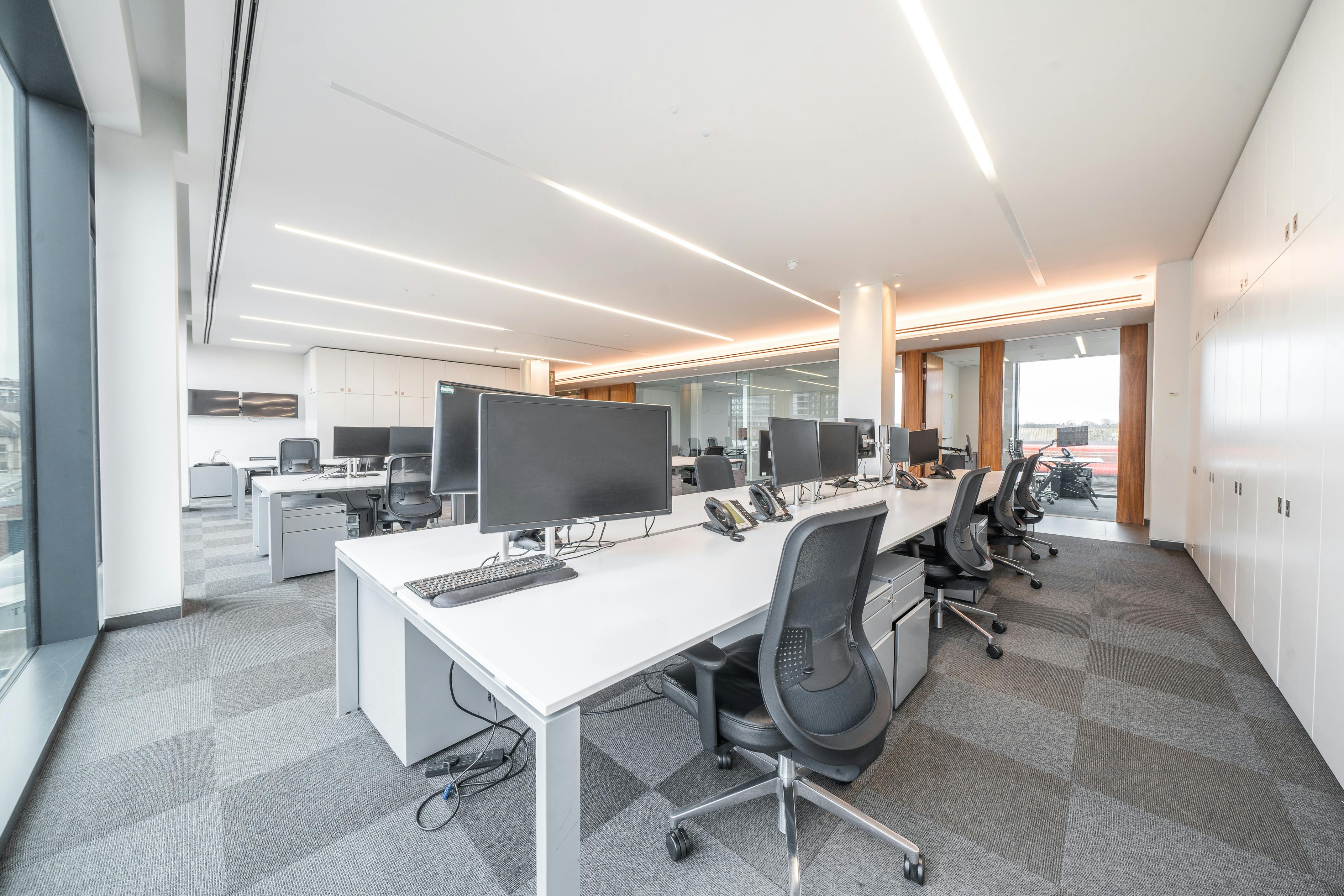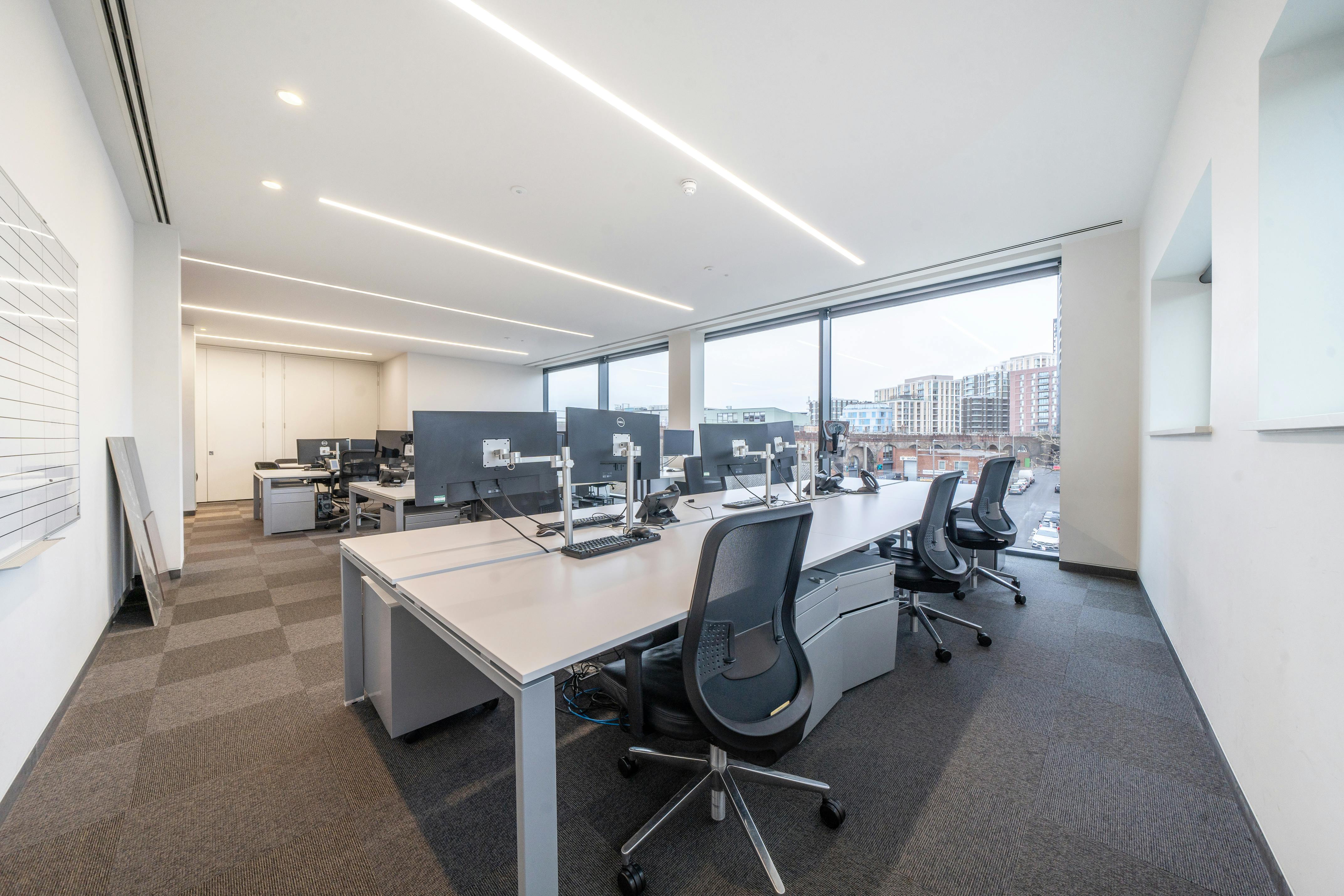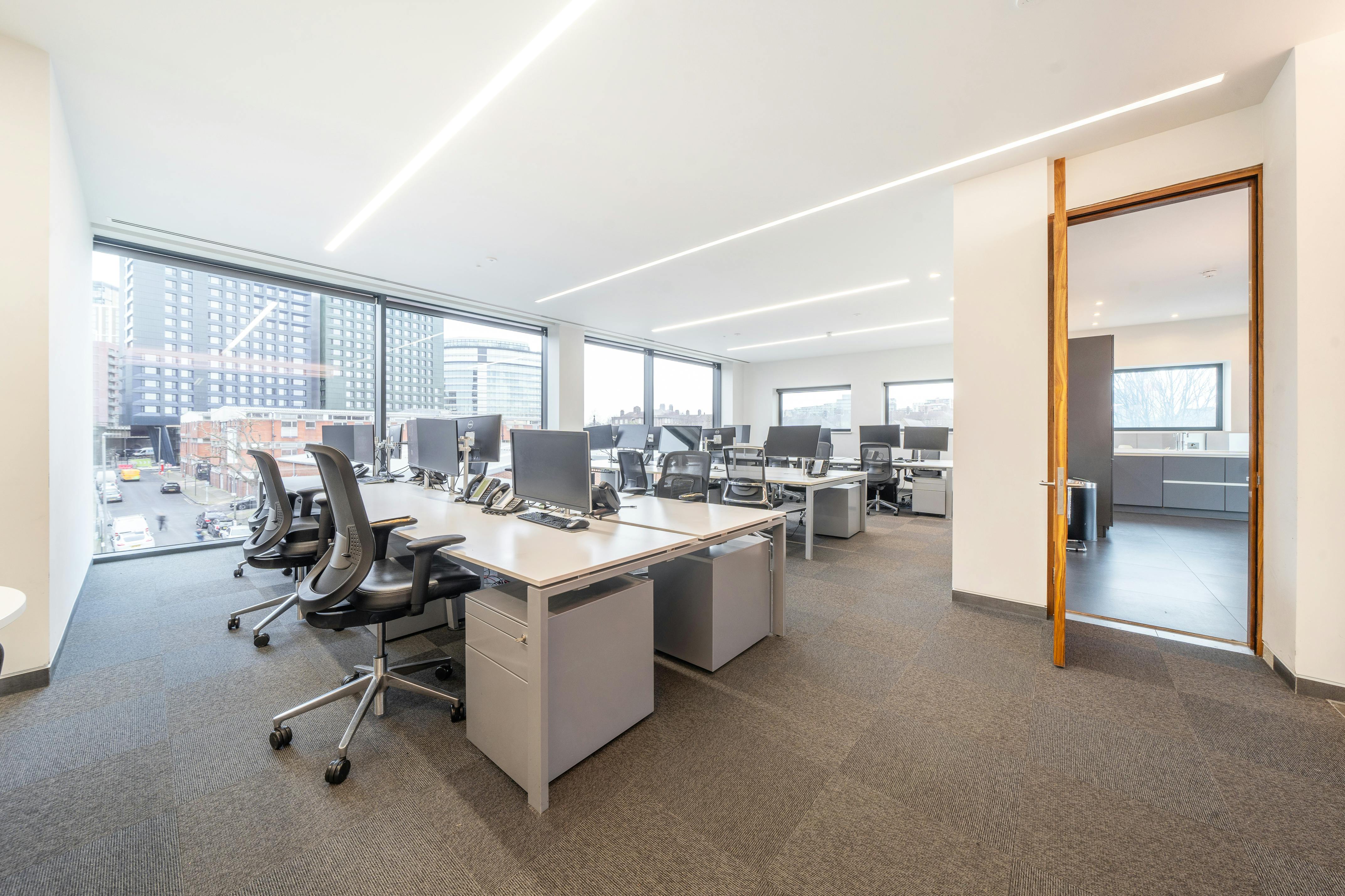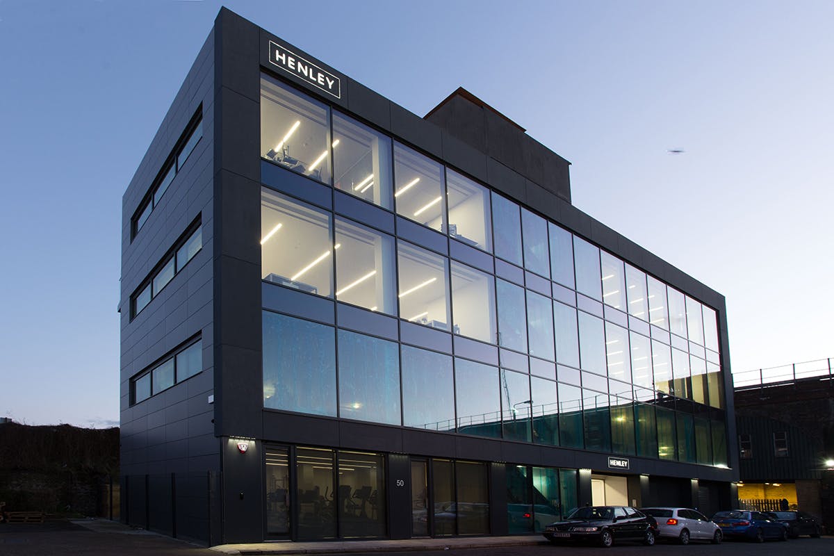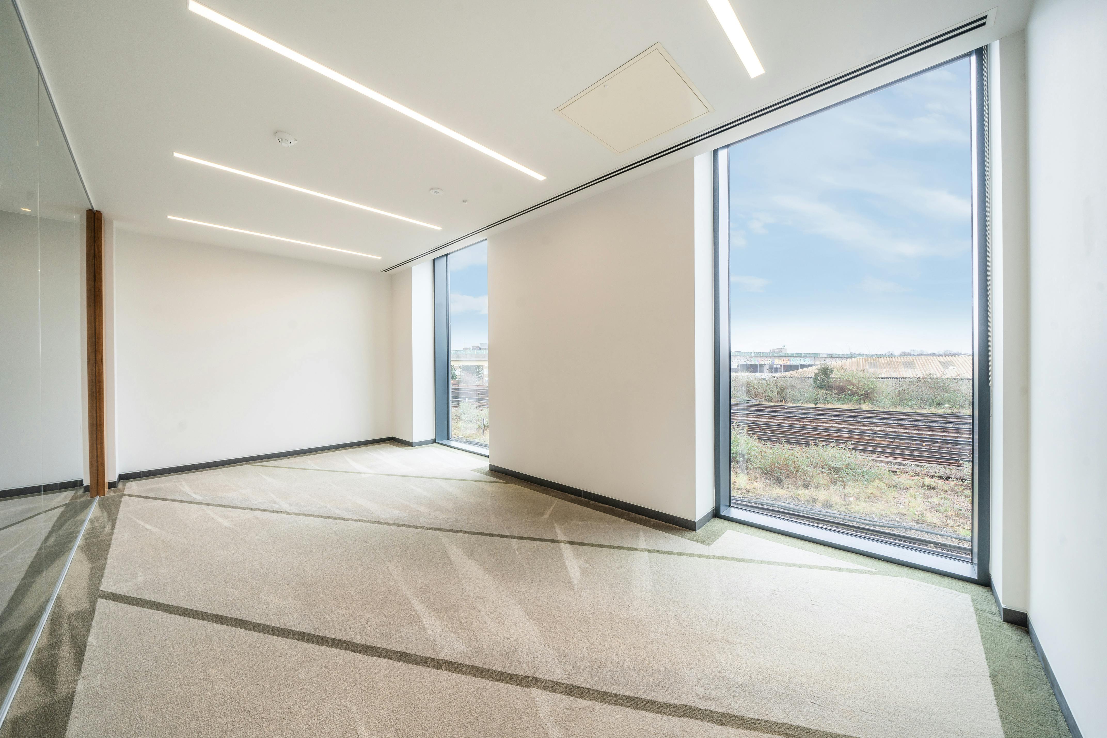 A modern, self-contained office building spanning four floors: ground, first, second, and third. The property features floor-to-ceiling glazed windows, a private third-floor terrace, and kitchen and WC facilities on each level.