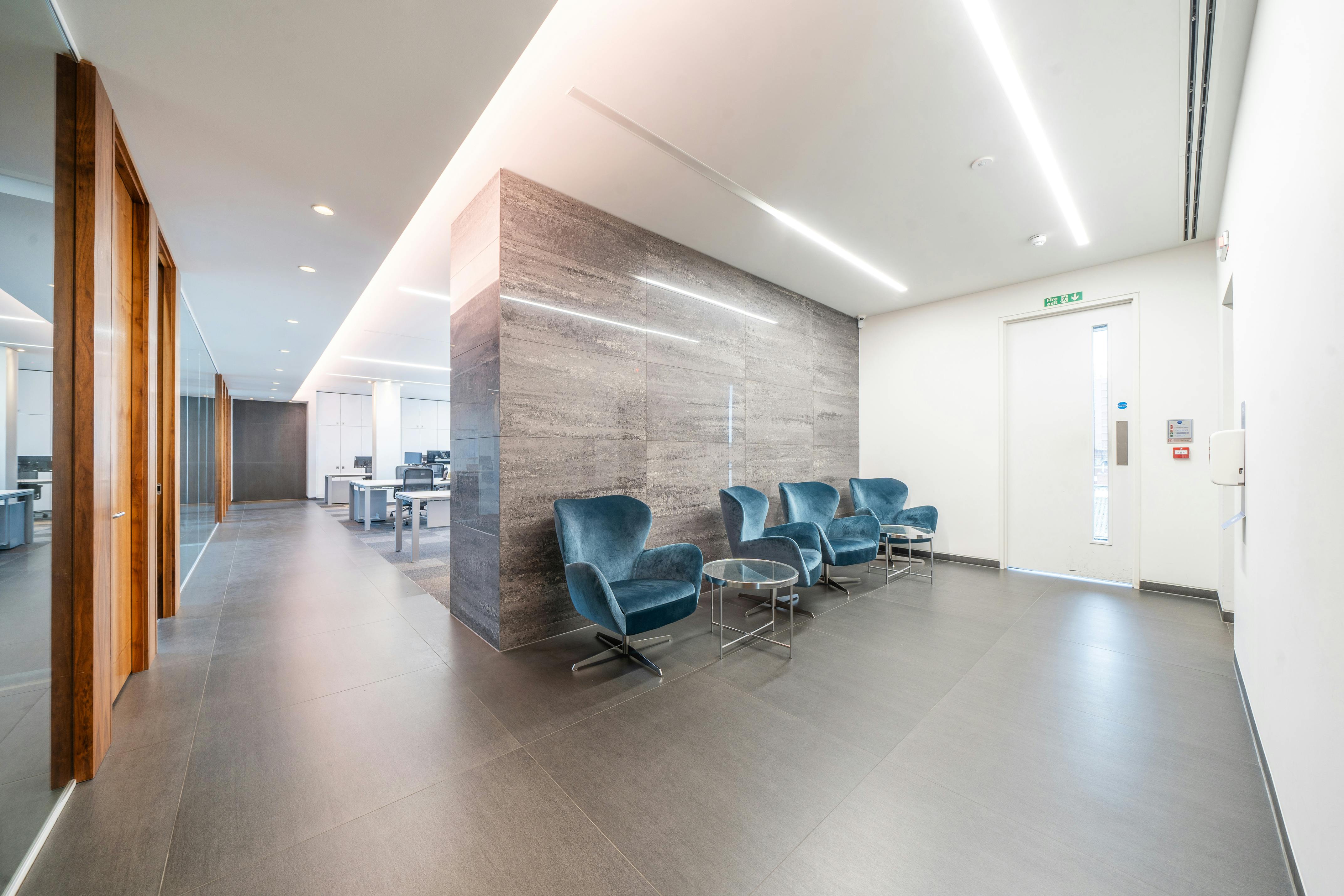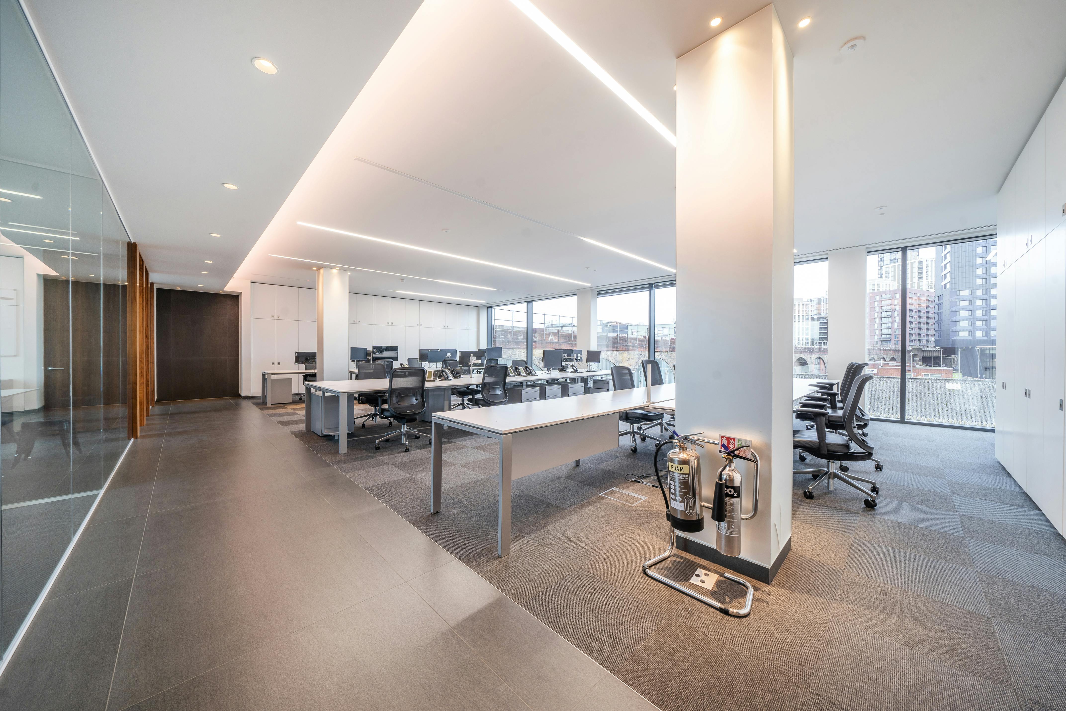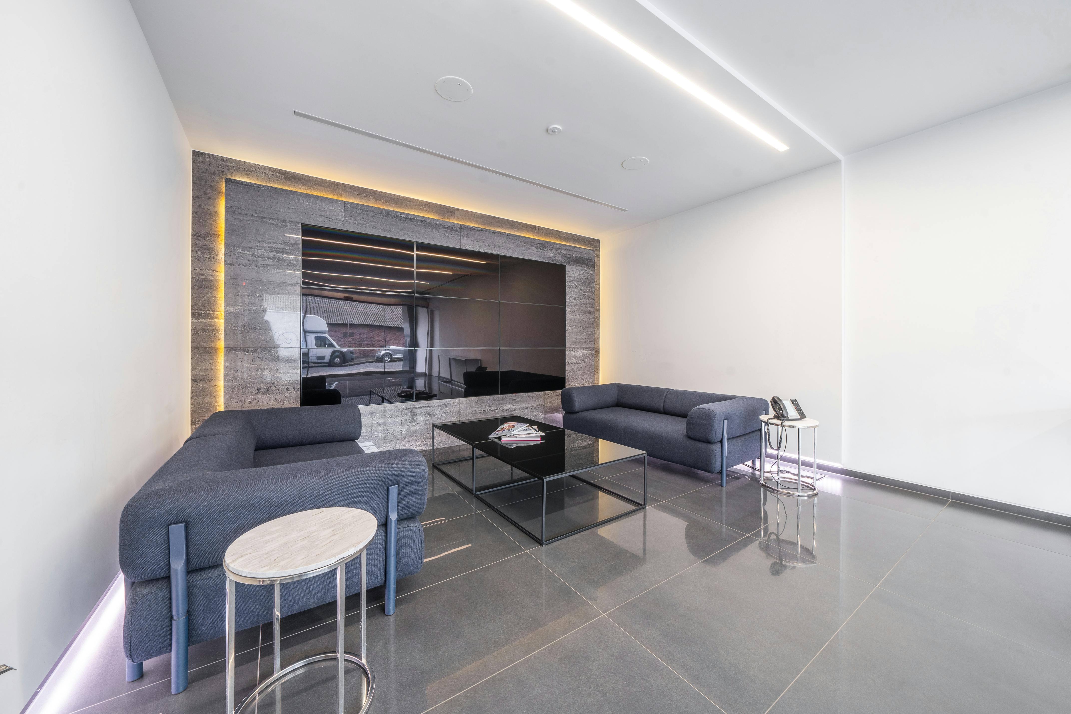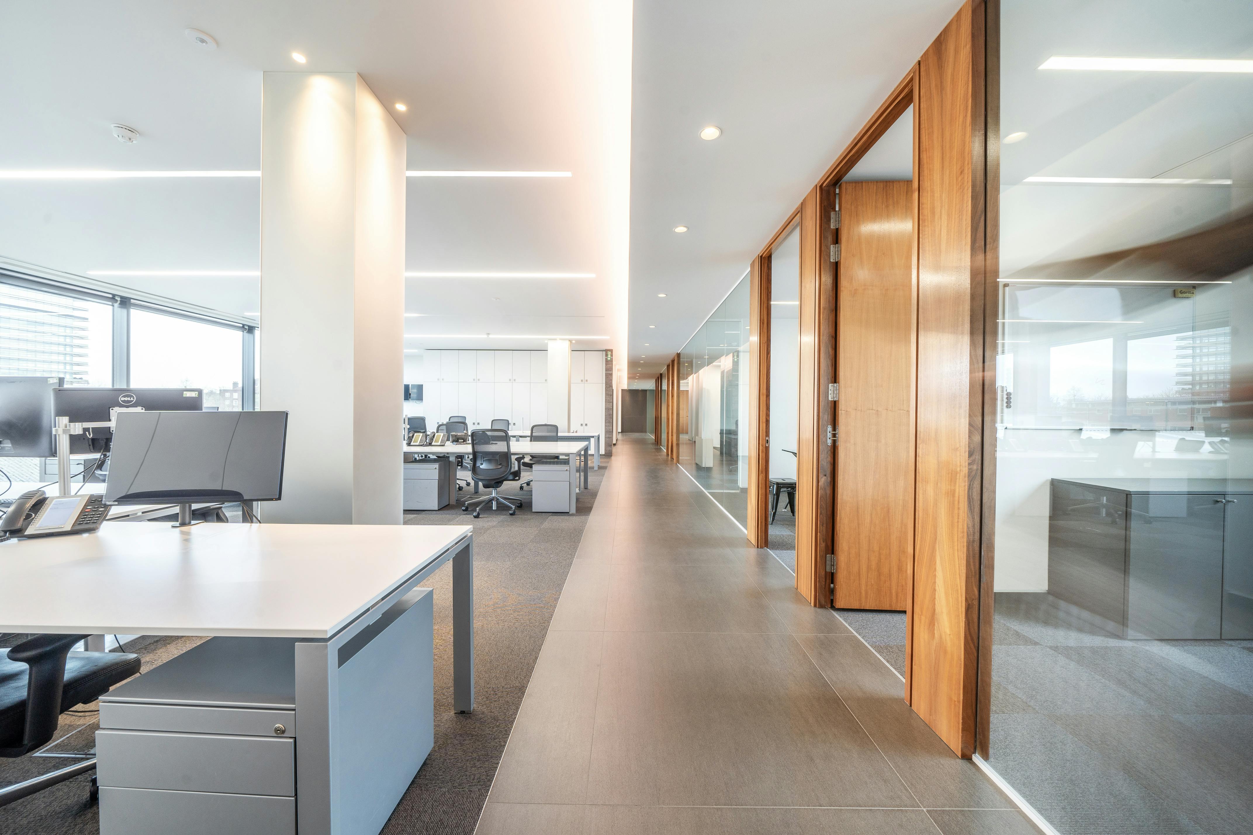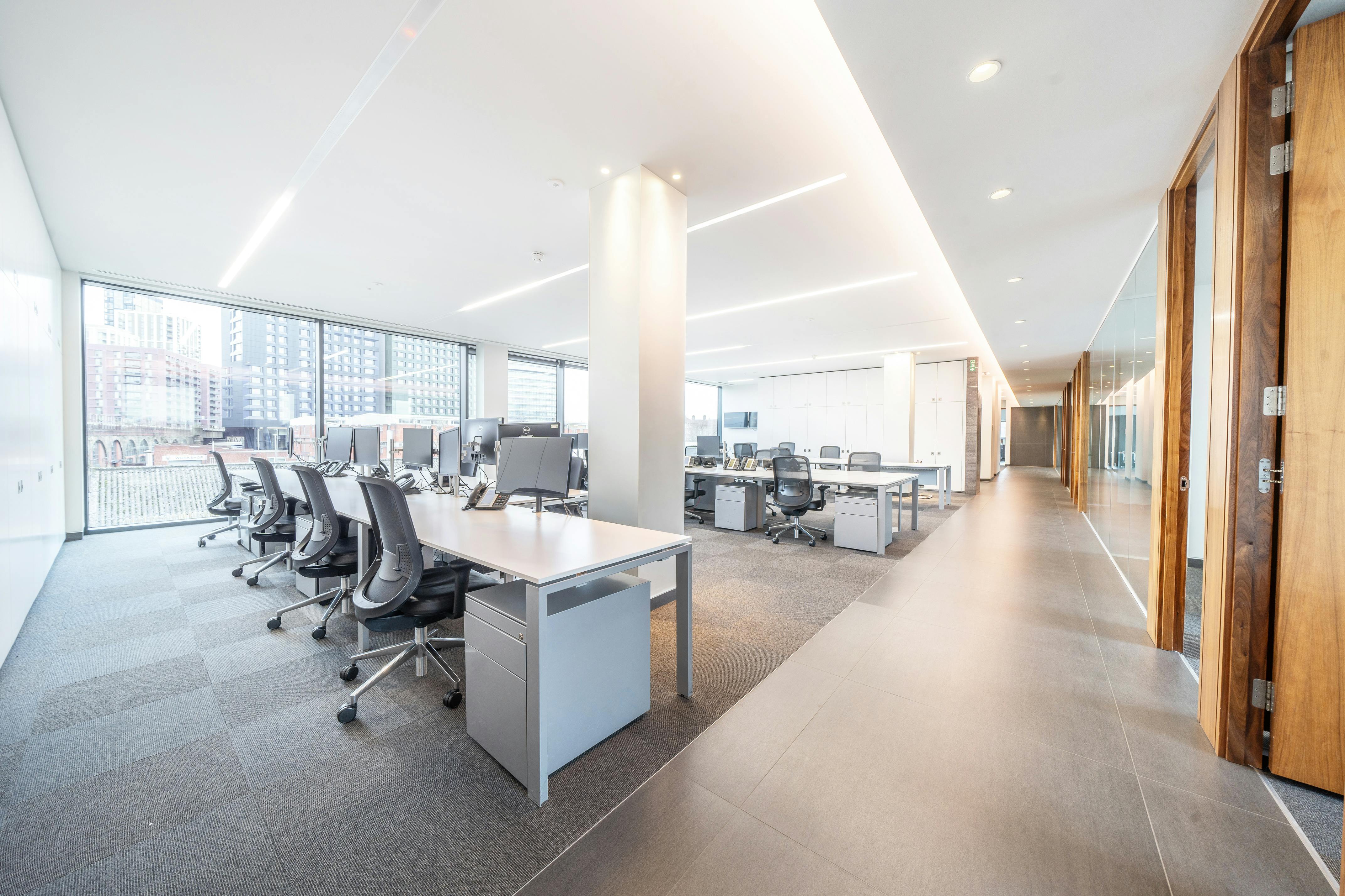 A modern, self-contained office building spanning four floors: ground, first, second, and third. The property features floor-to-ceiling glazed windows, a private third-floor terrace, and kitchen and WC facilities on each level.