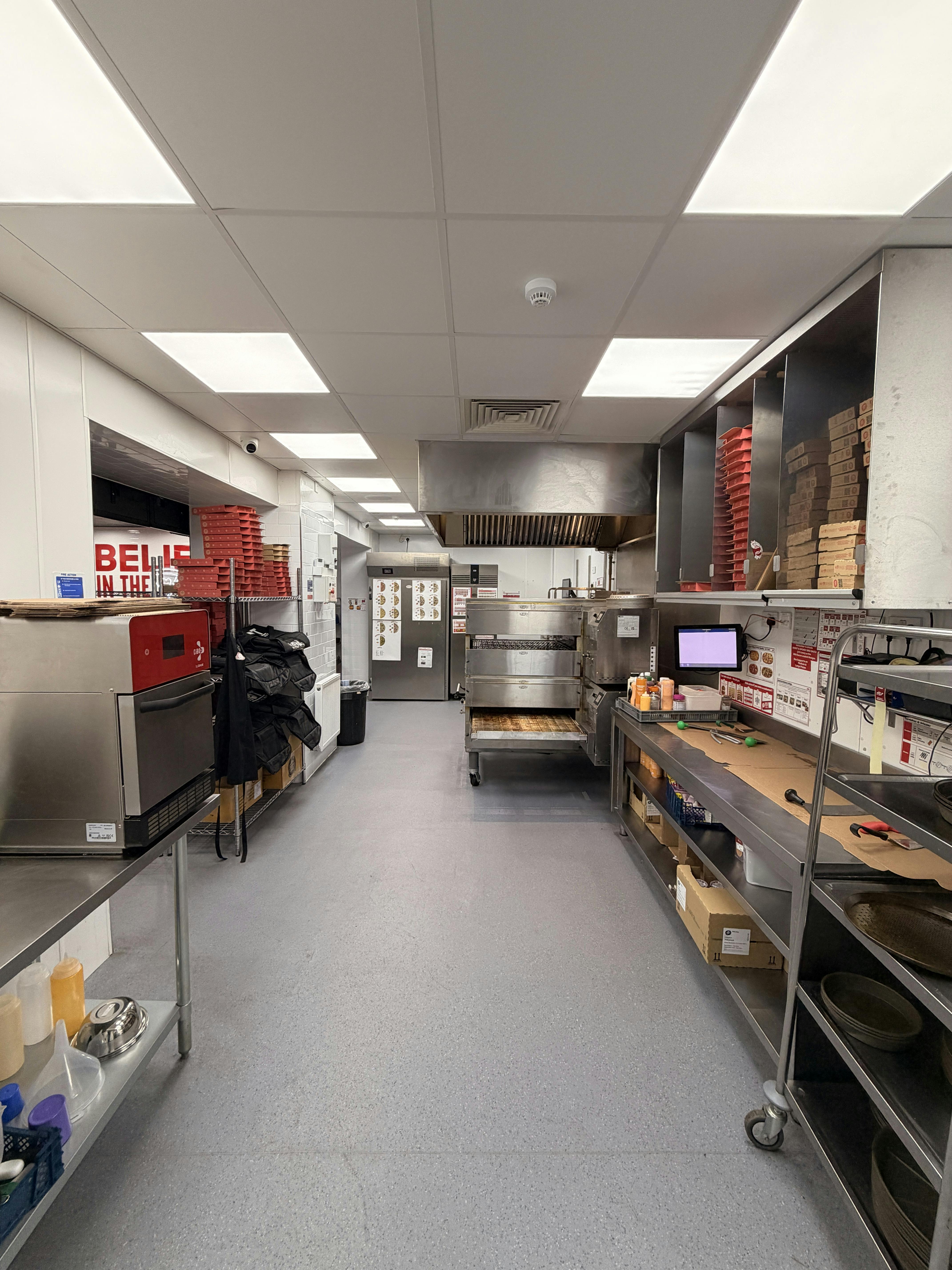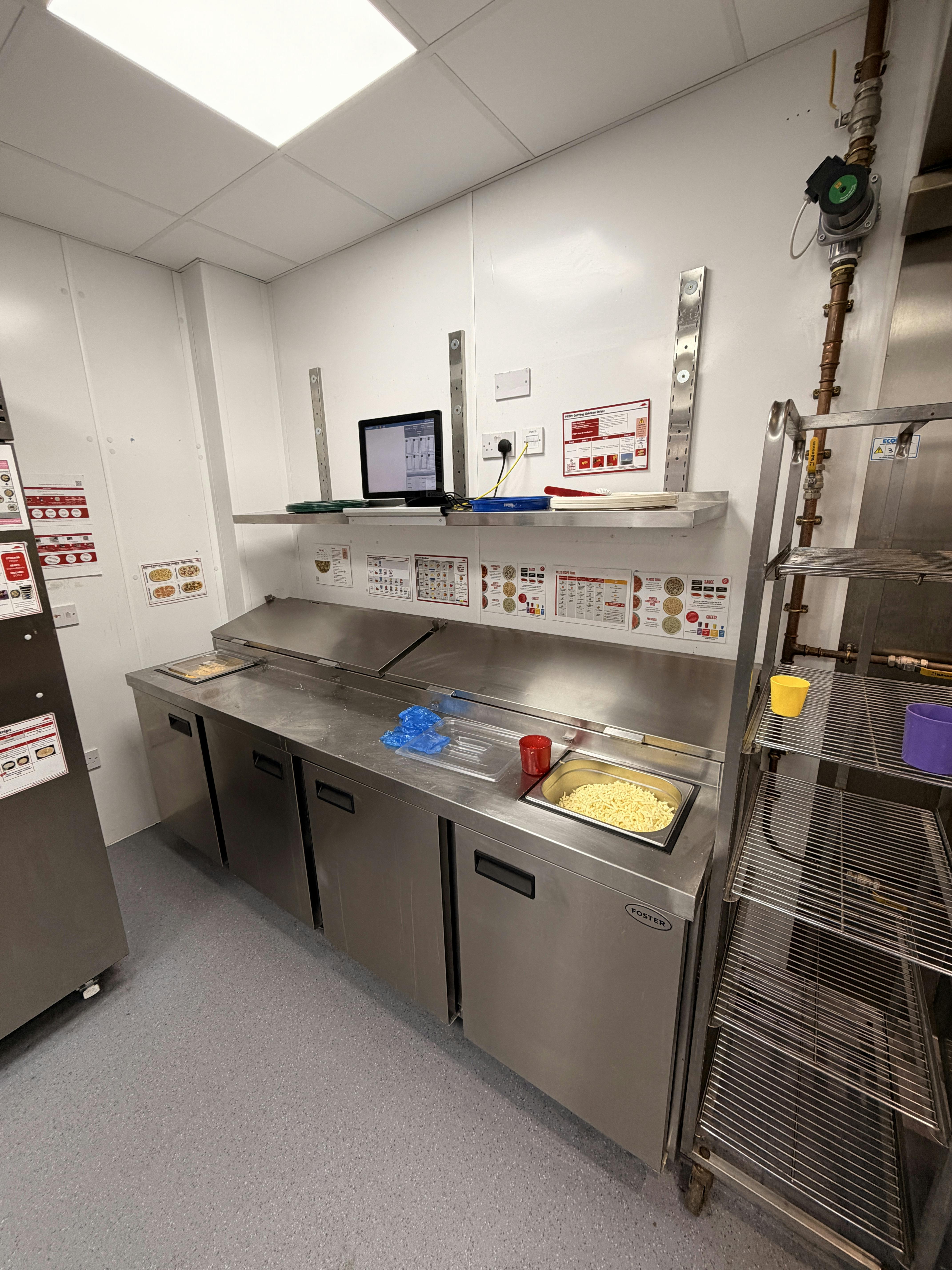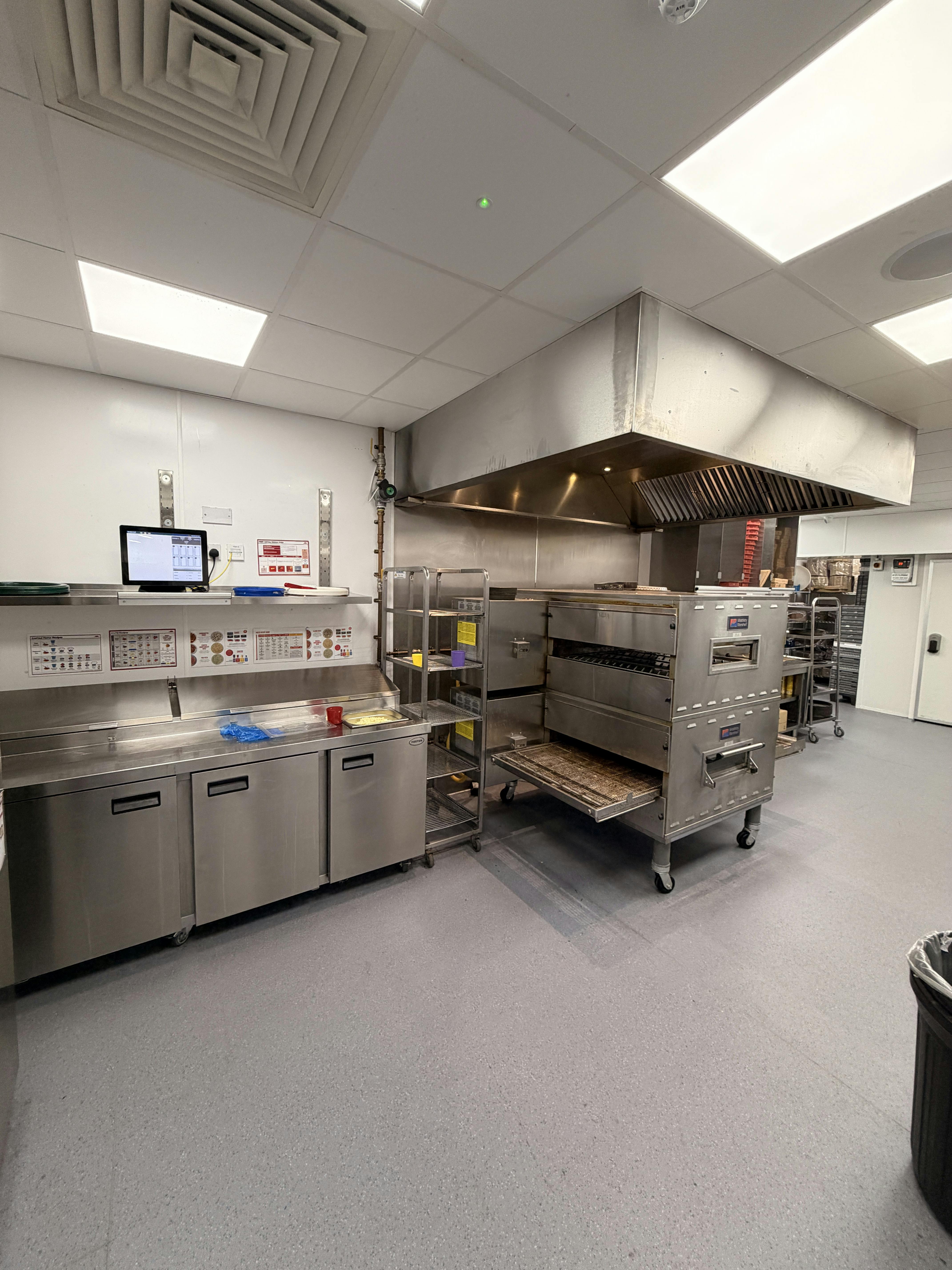The takeaway is accessed via a single flush pedestrian door which leads into the customers waiting area. Internally, the space is fitted out to a high standard in corporate branding. The commercial kitchen is, as expected, fitted out to a professional standard with extract ventilation, conveyor gas fired pizza oven, pizza prep station and a range of stainless steel sink units, utility basins and fitments.