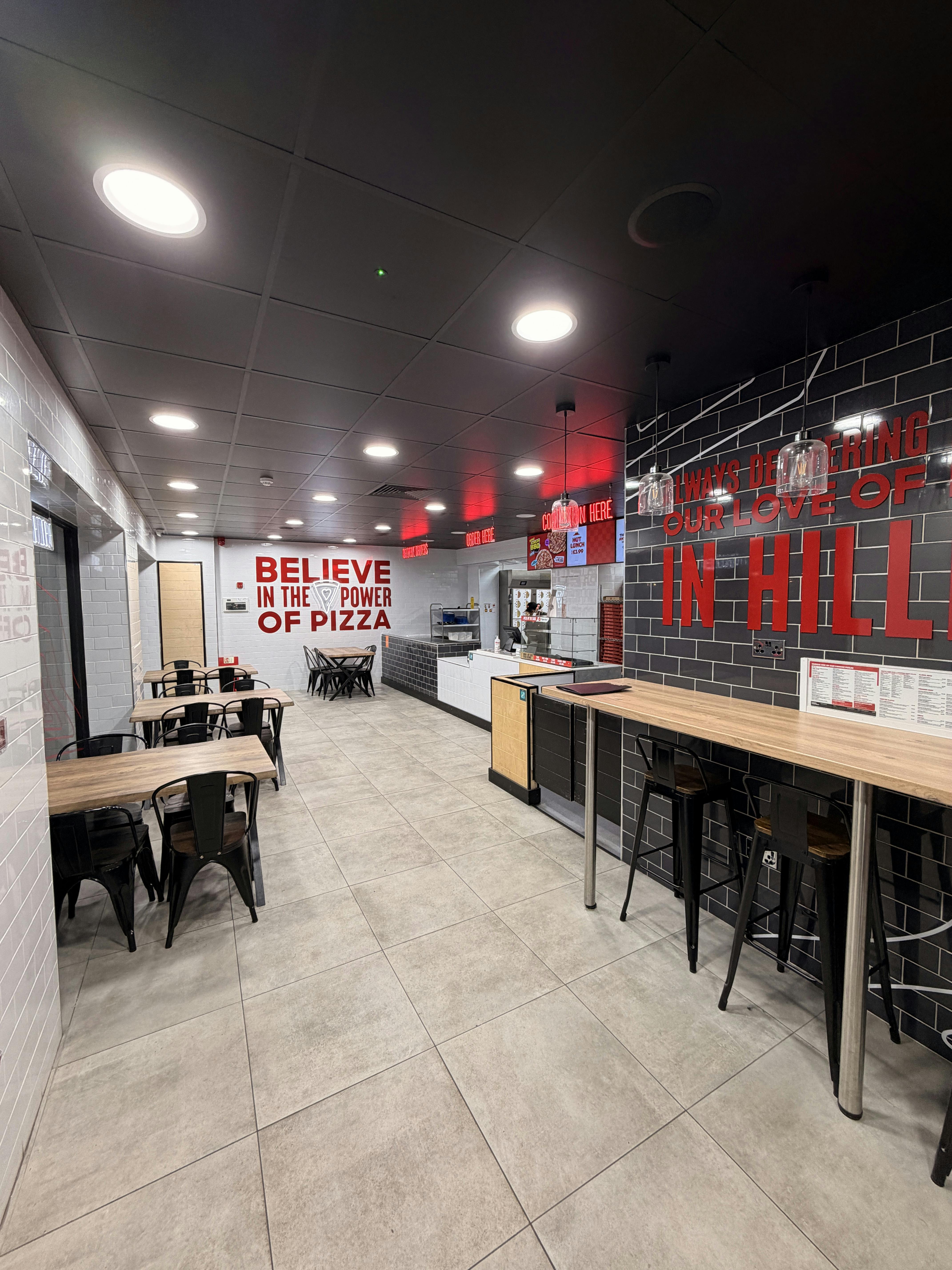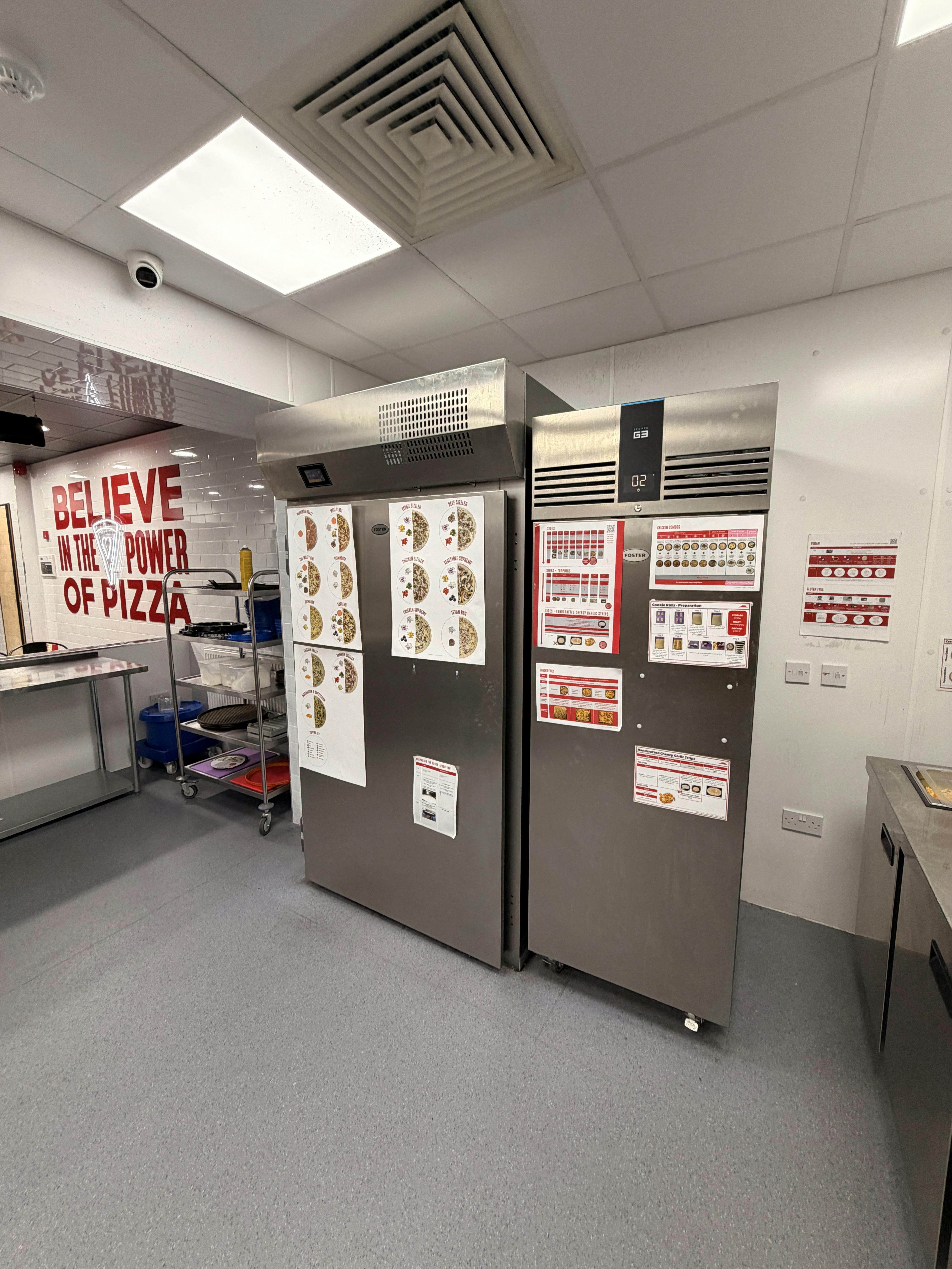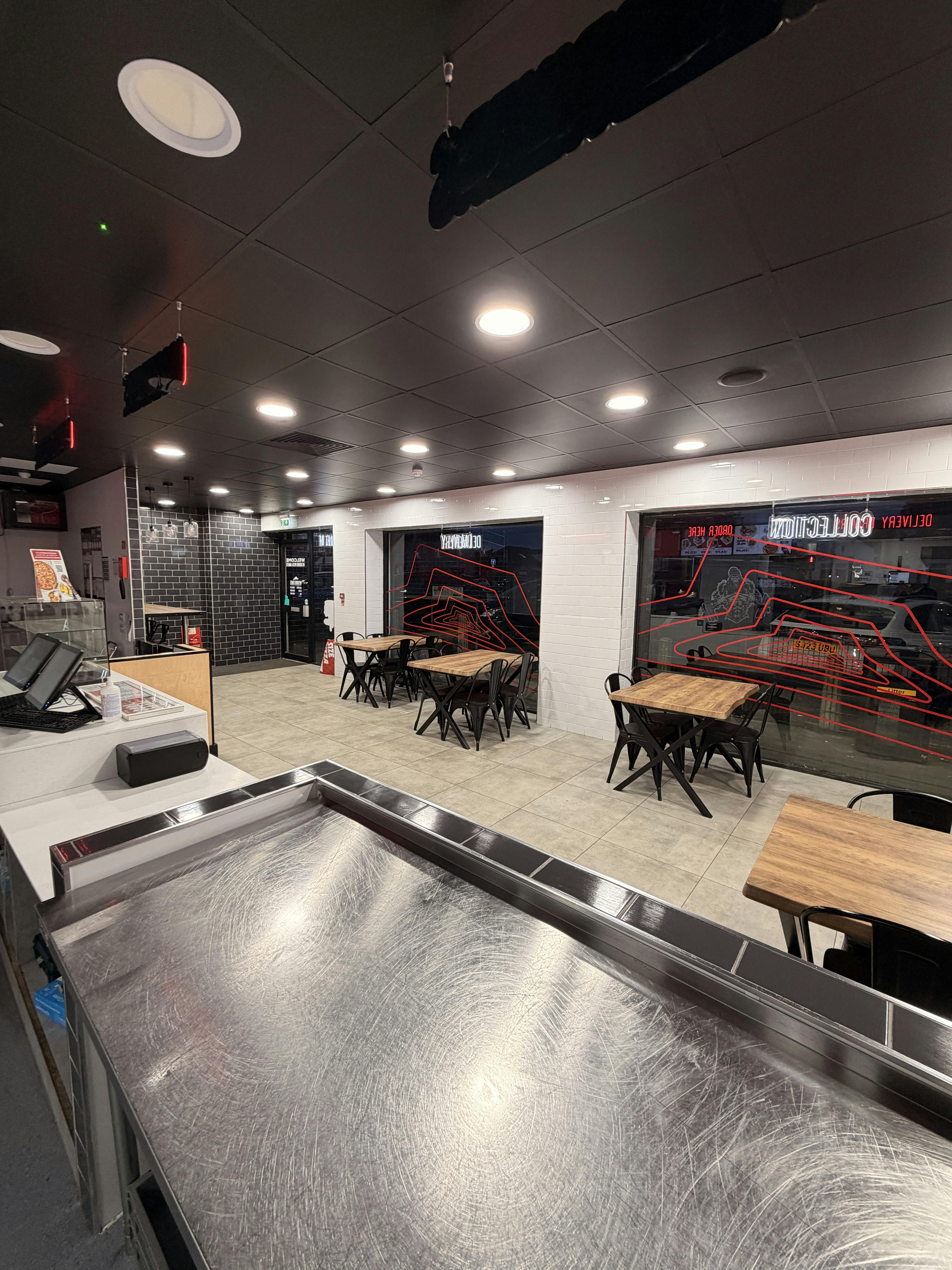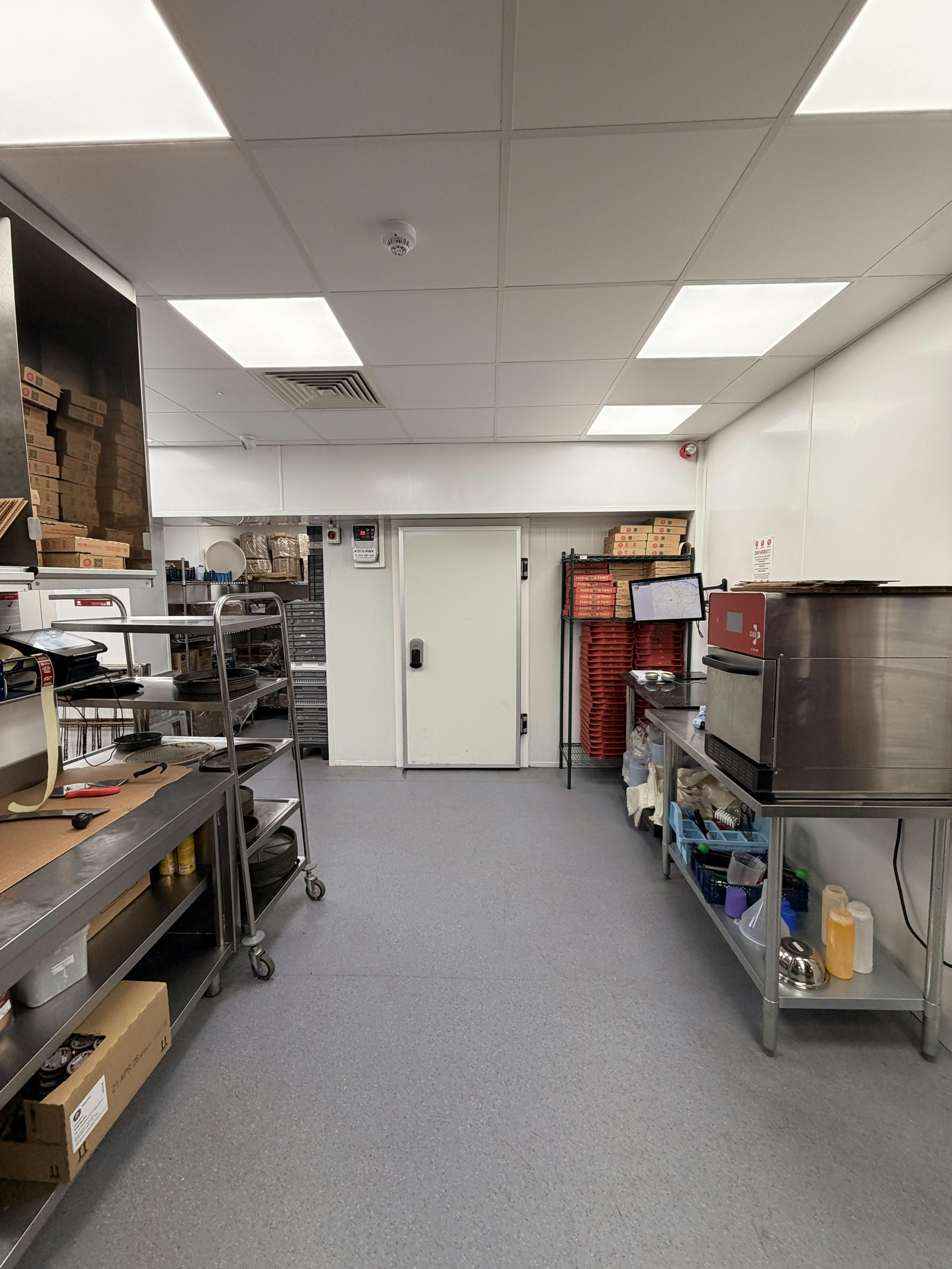 The takeaway is accessed via a single flush pedestrian door which leads into the customers waiting area. Internally, the space is fitted out to a high standard in corporate branding. The commercial kitchen is, as expected, fitted out to a professional standard with extract ventilation, conveyor gas fired pizza oven, pizza prep station and a range of stainless steel sink units, utility basins and fitments.