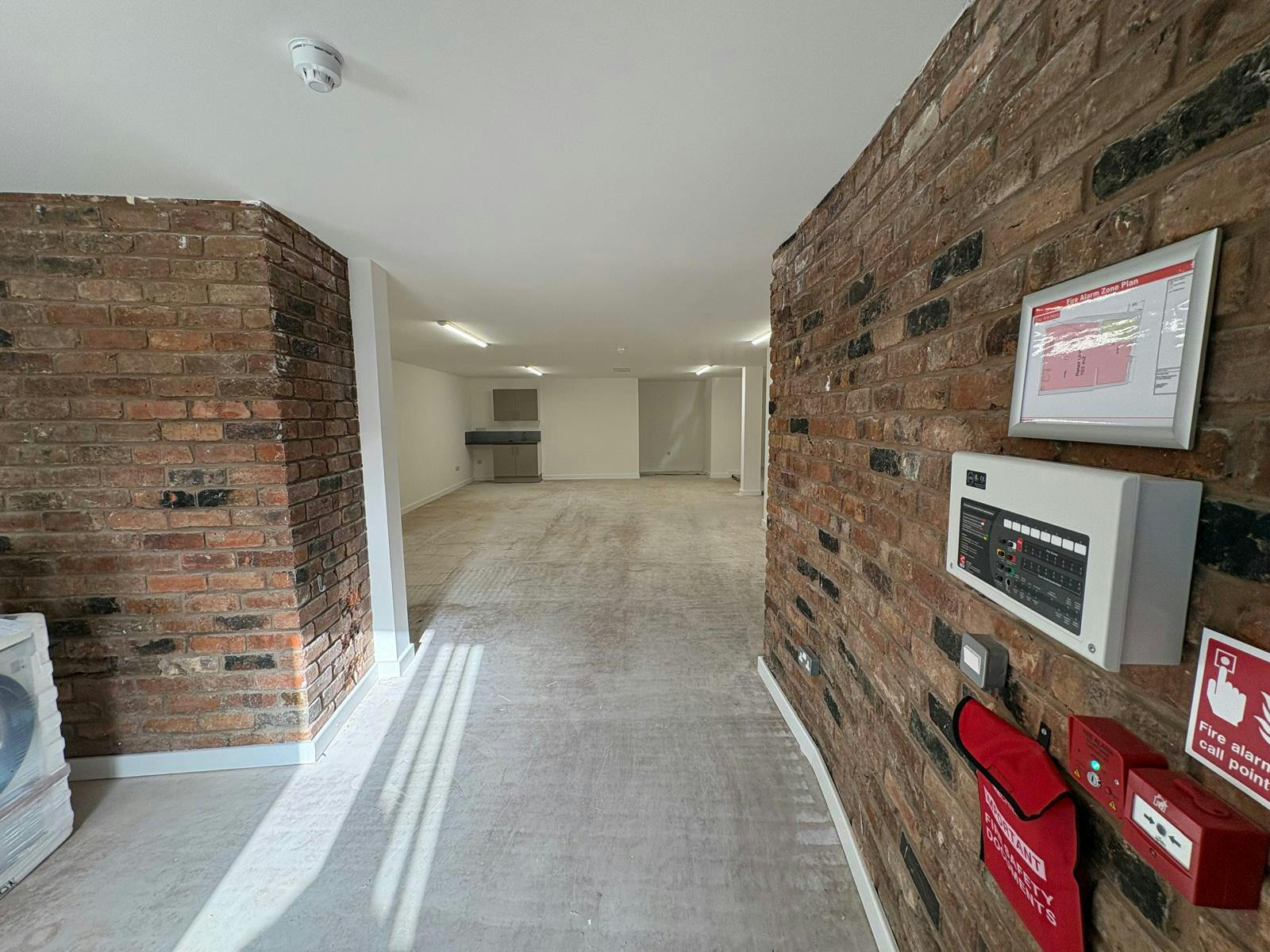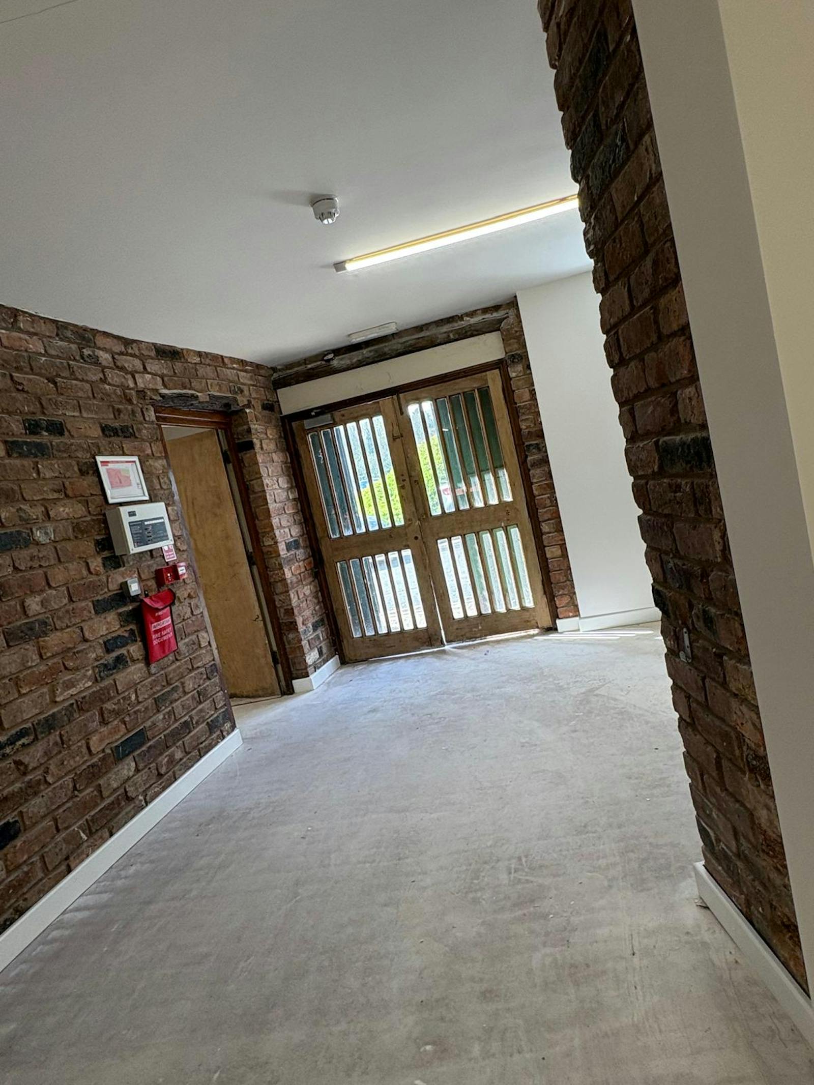The property boasts a distinctive and characterful frontage, featuring stable-style security doors with double-glazed wooden entrance doors set behind, creating both charm and practicality. Internally, the space opens into a substantial ground floor area, enhanced by exposed brickwork that adds warmth and character—making it suitable for a wide range of commercial uses.