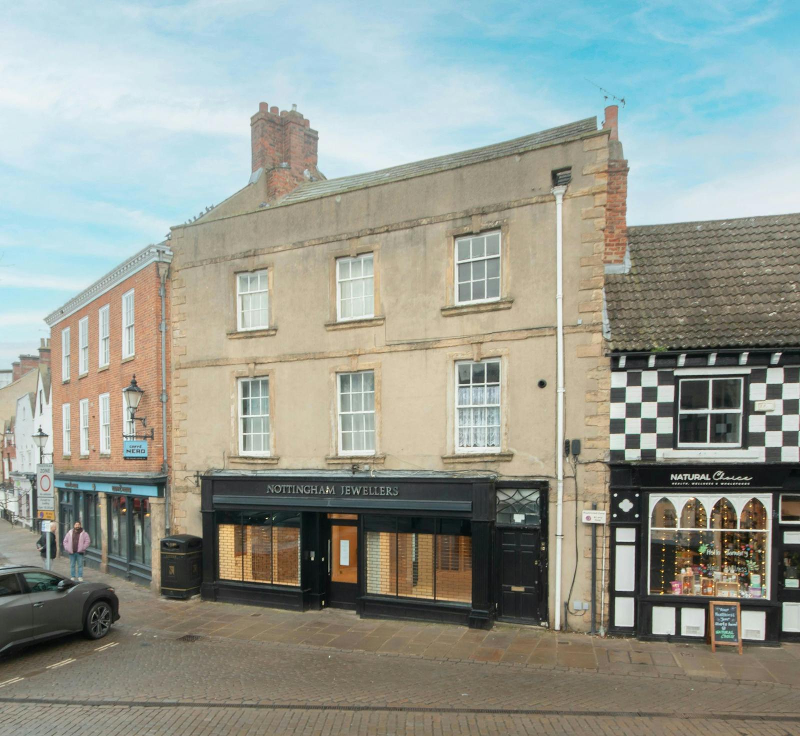 The premises occupy the ground floor of an imposing Georgian Grade II listed property, featuring an attractive shop front that affords a prominent and highly visible position within The Market Place.
