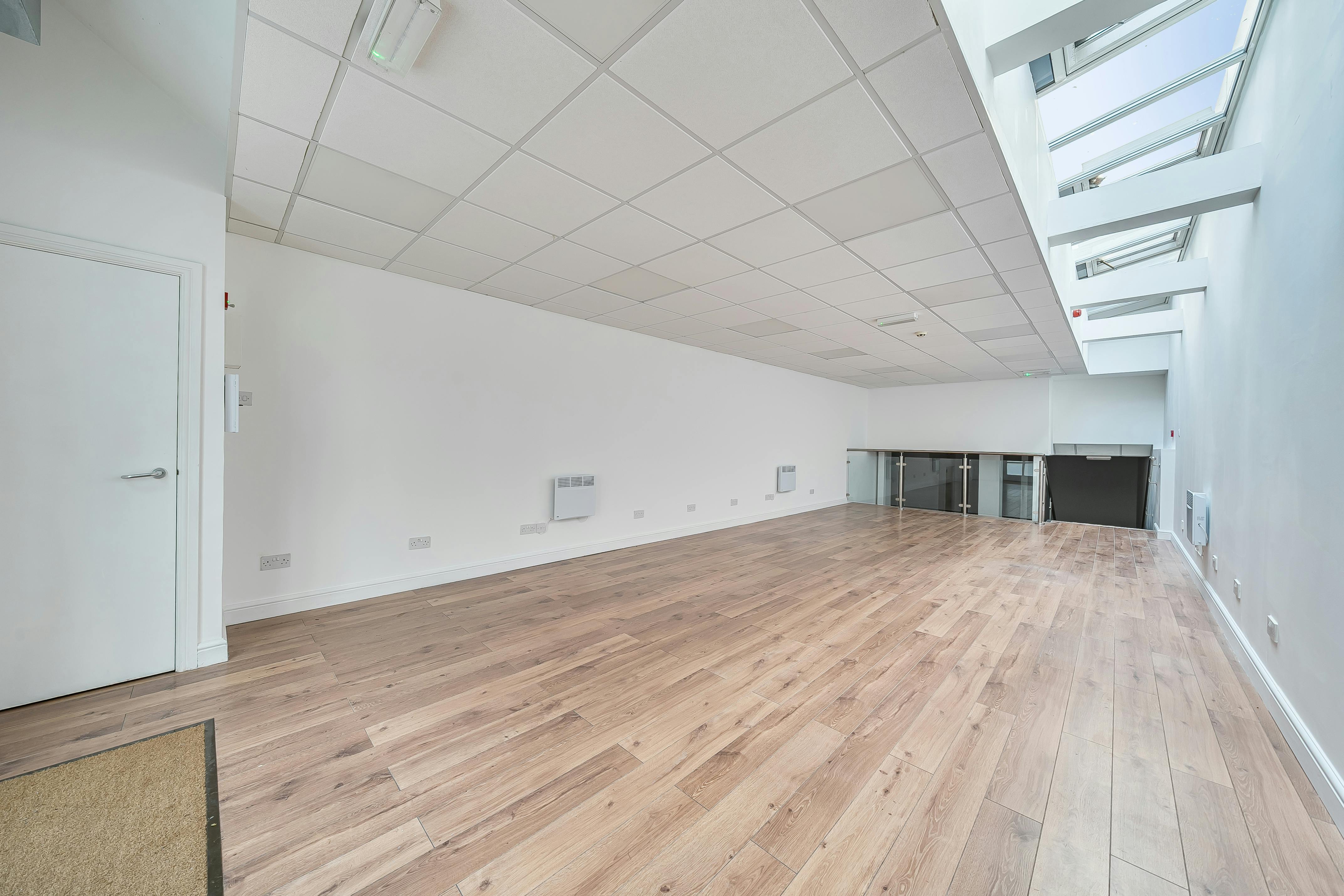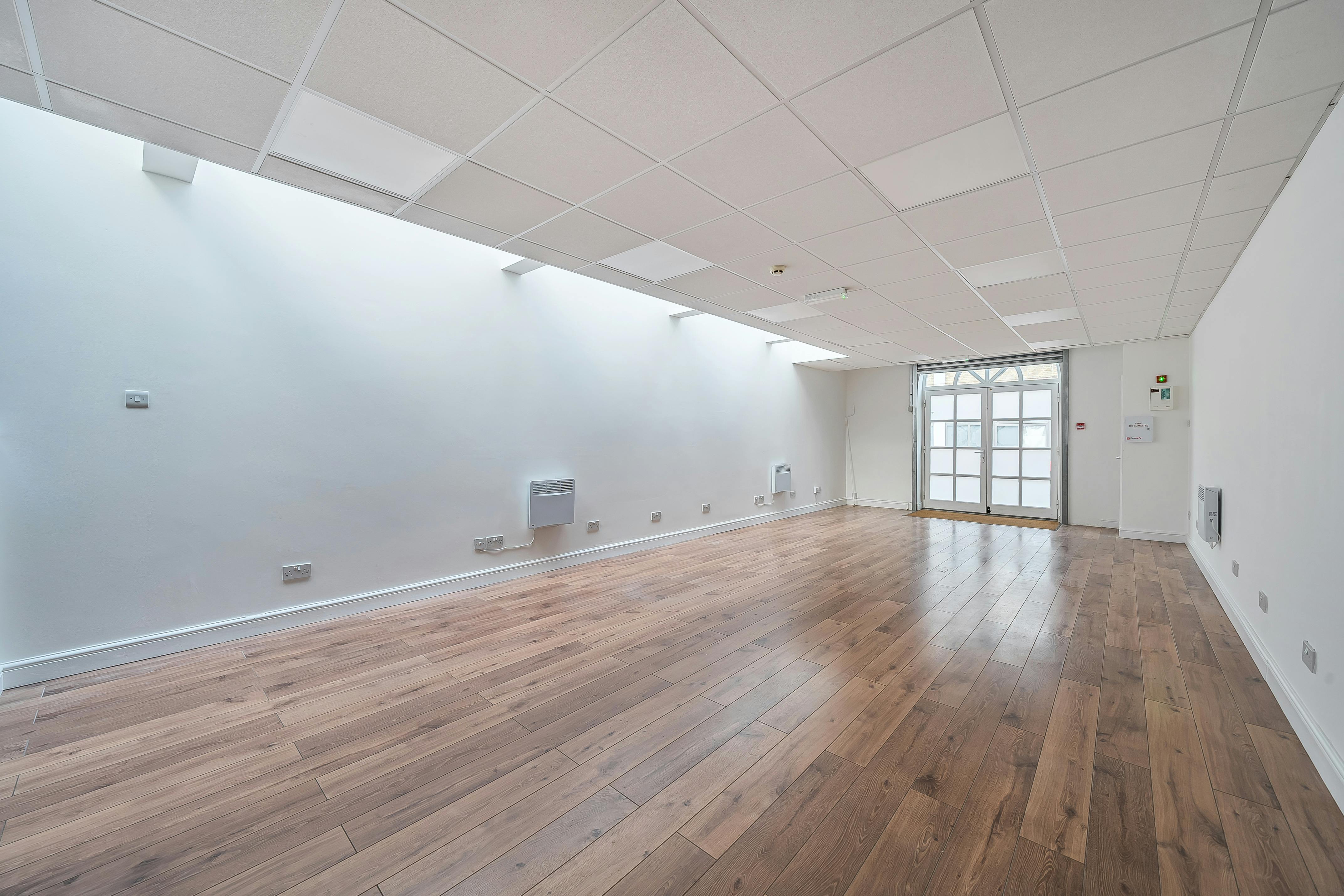 The premises feature a modern fitted kitchen with laminate worktops and ample storage units, as well as a contemporary shower room and WC. Additional amenities include a secure entrance with security shutters, laminate flooring, suspended ceilings, modern lighting, and skylights that provide excellent natural light throughout.